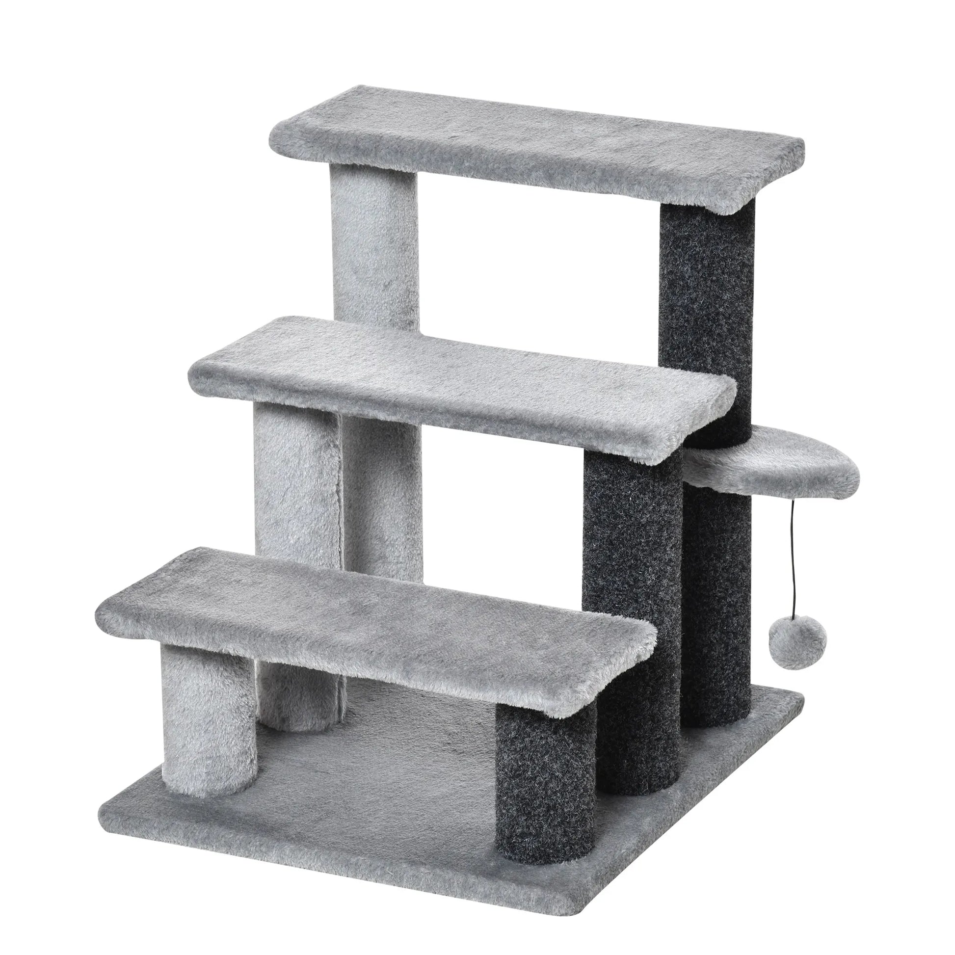 3 pakopų katės ir šunų laipteliai su draskyklėmis ir kamuoliuku, naminiams gyvūnėliams iki 5 kg, pliušas, džiutas, pilkos spalvos, 45 x 40 x 48 cm