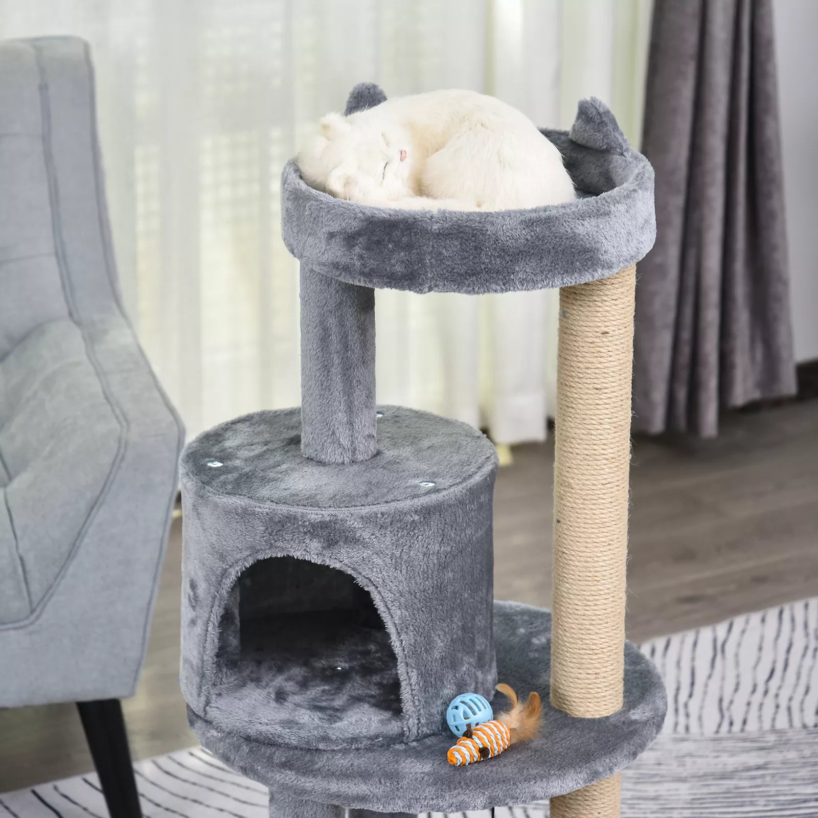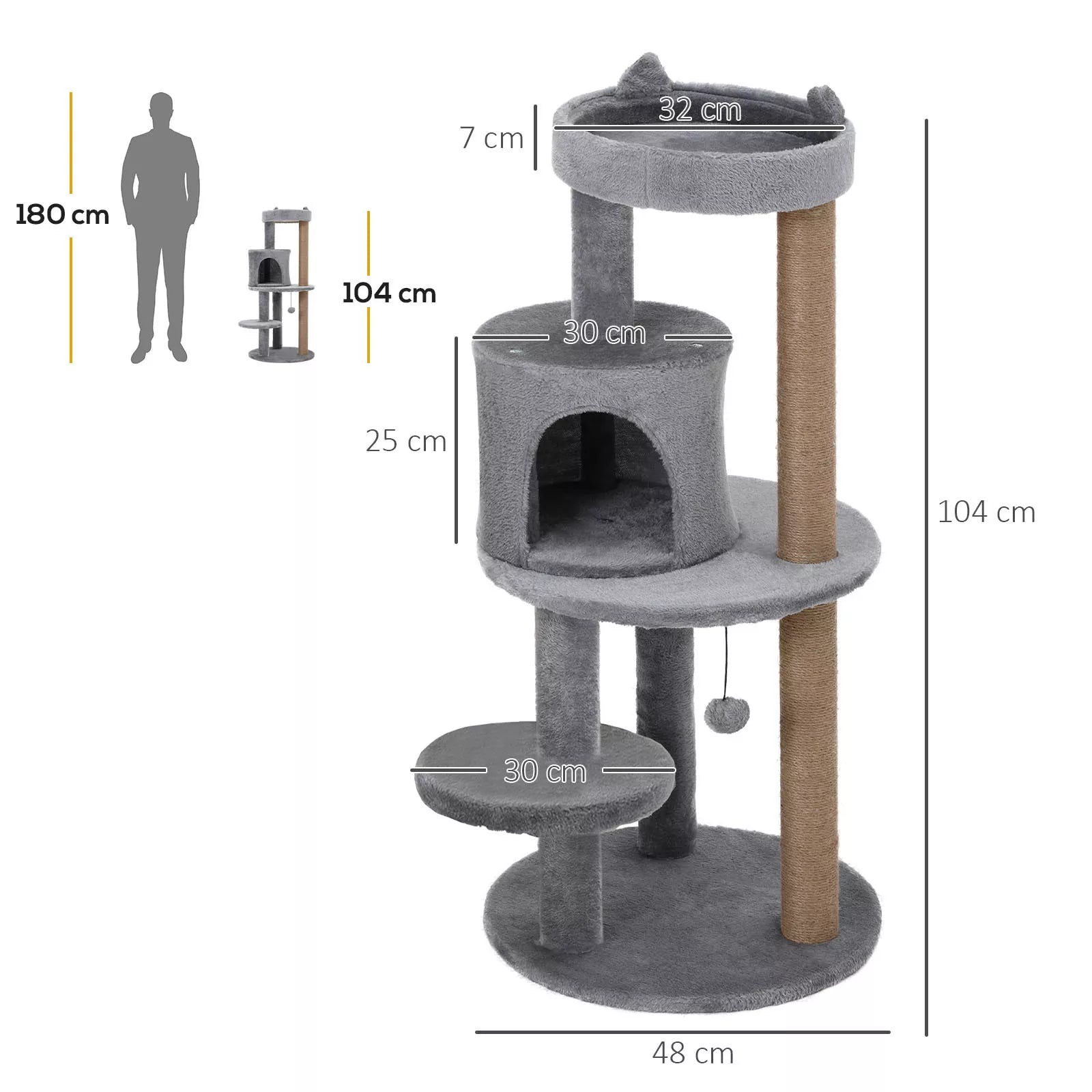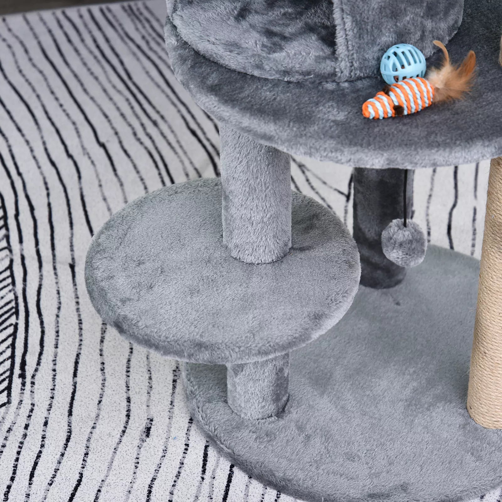 4 aukštų katės medis su urveliu, nameliu, žaisliukais, sėdimąja platforma, sizalio stulpu ir draskykle, didelis, stabilus, prabangus, pilkas, iš sizalio ir pliušo, 48x48x104 cm