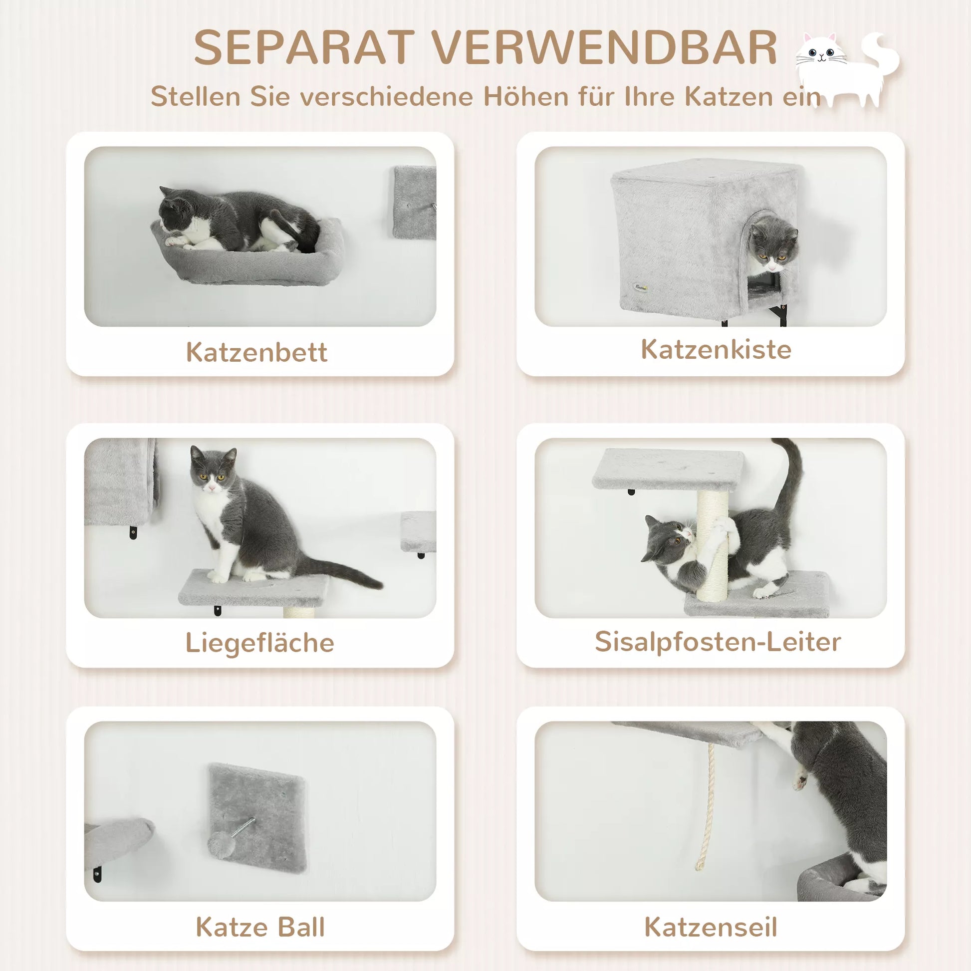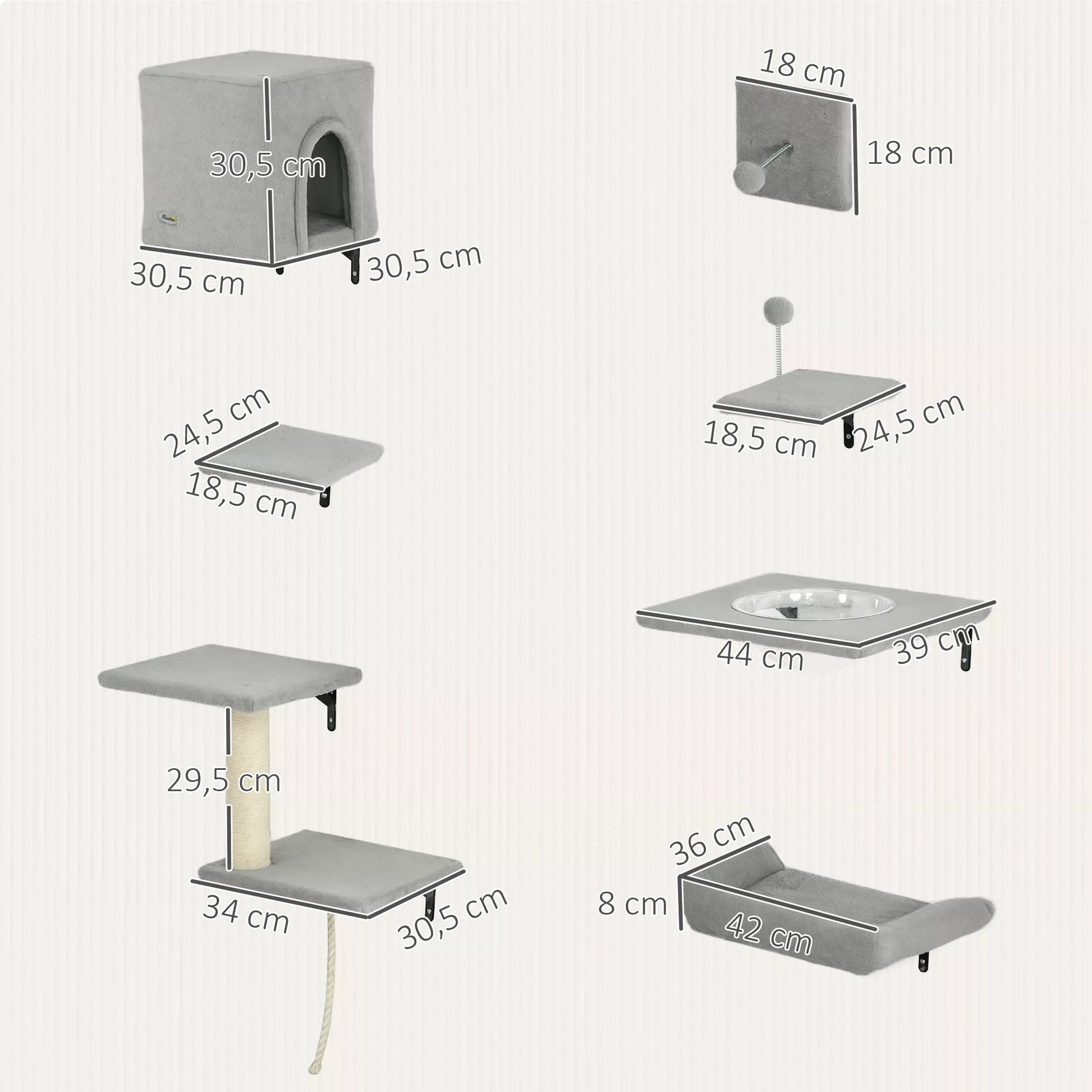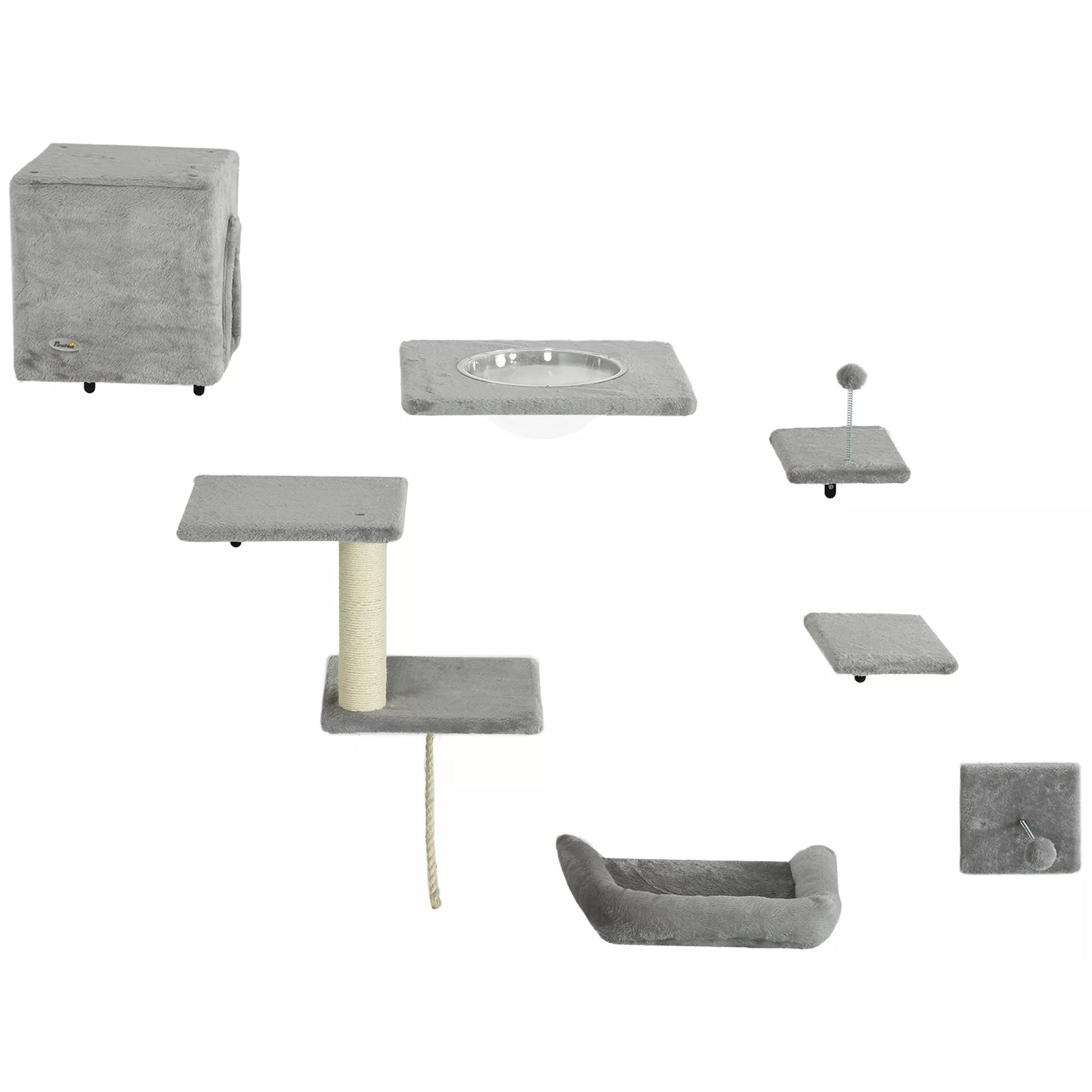 7 dalių kačių laipiojimo sienelės komplektas su kačių nameliu, platformomis (pilka)