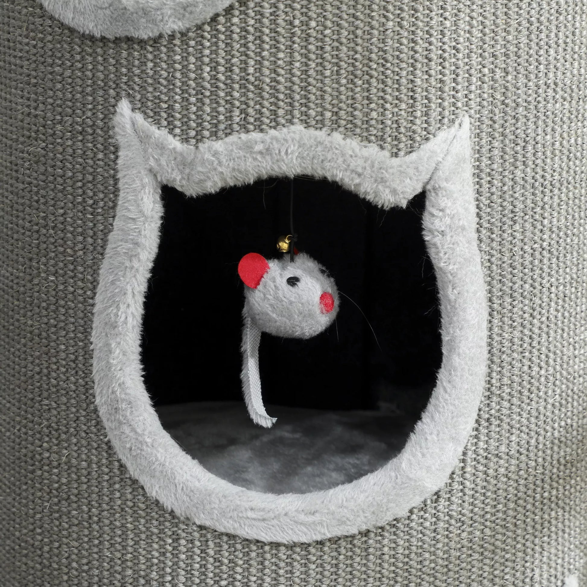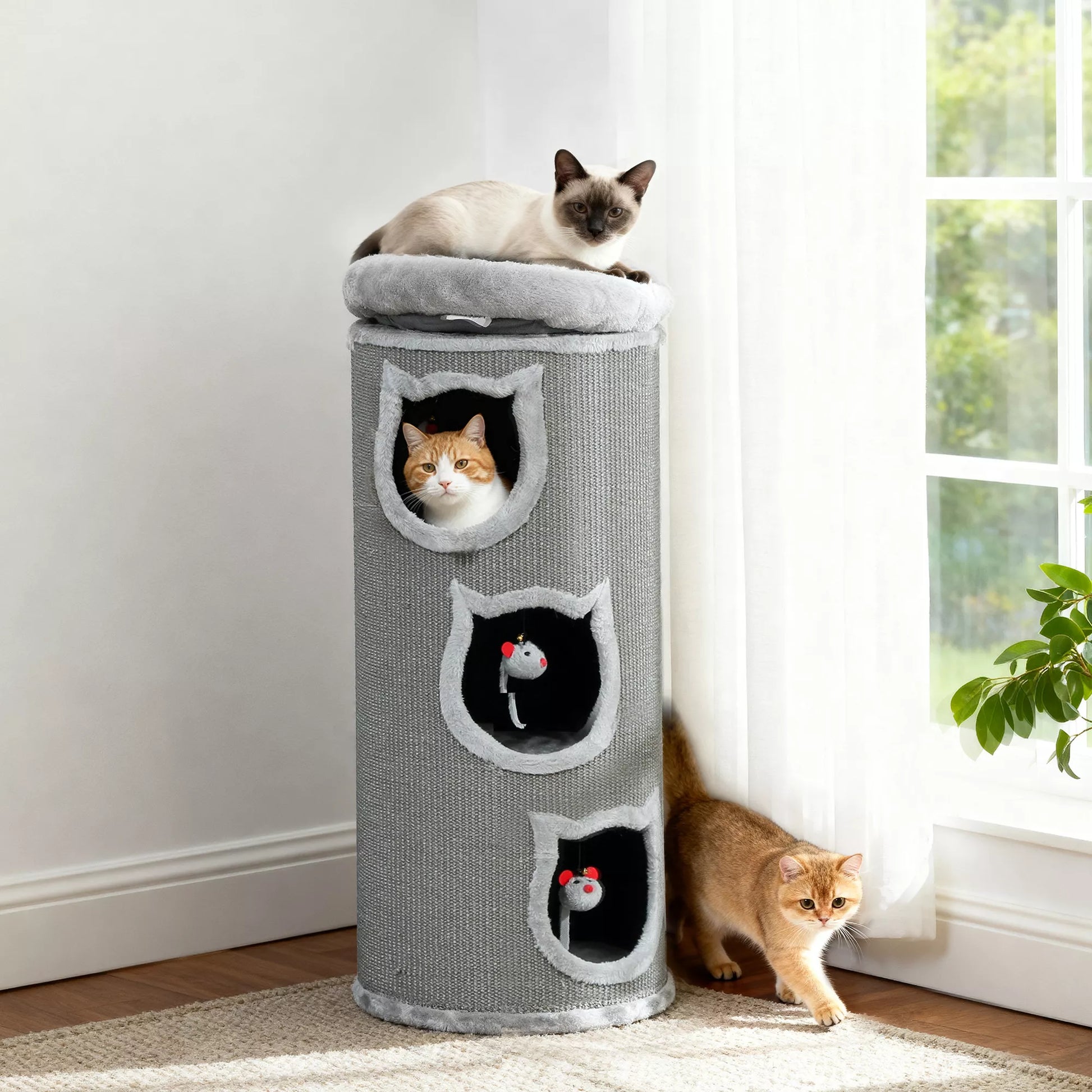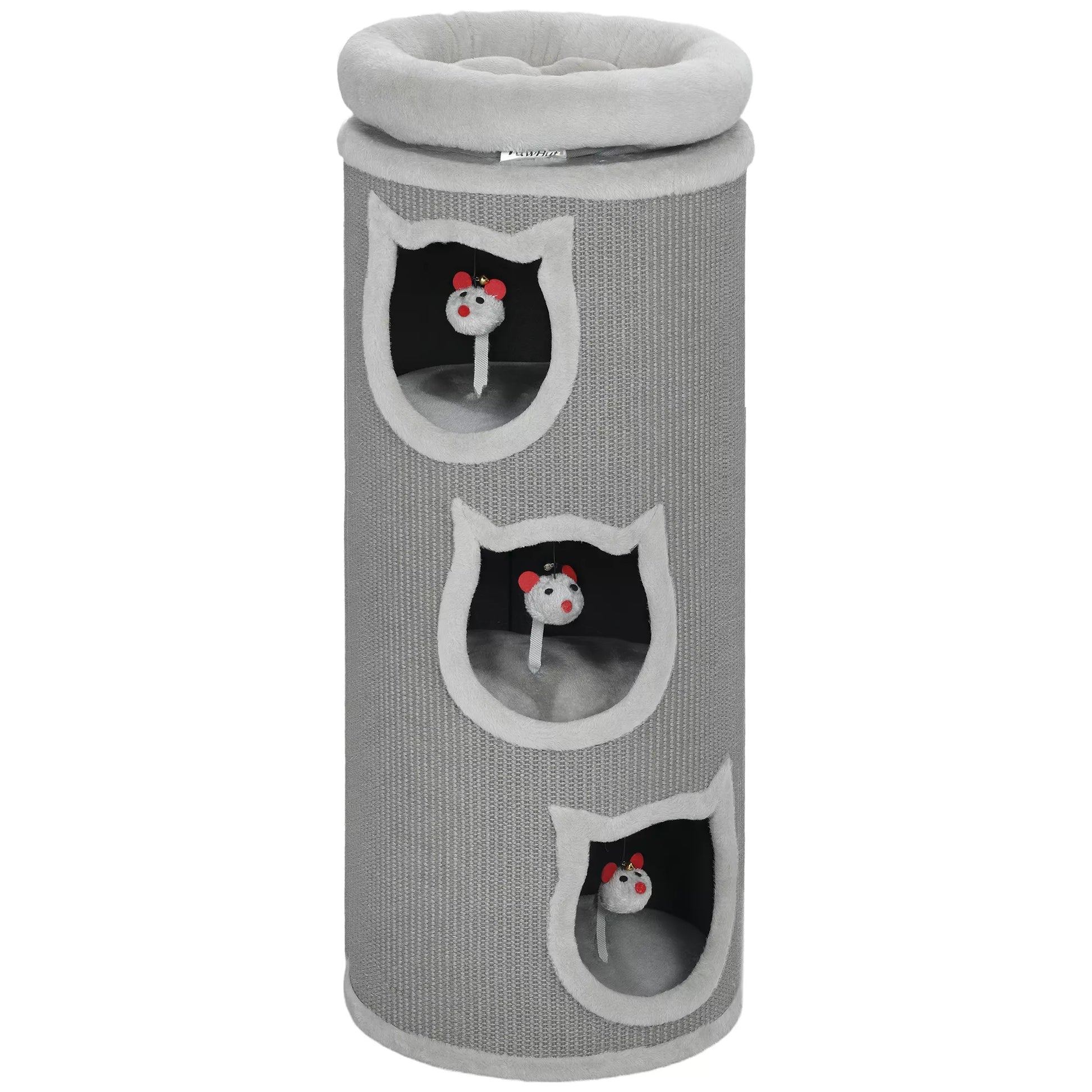 Katilinės draskyklė, 96 cm, 4 lygių katės bokštas su skalbiamu guoliu, 3 miegamosios olos, kabantys žaislai, daugeliui kačių, pilka