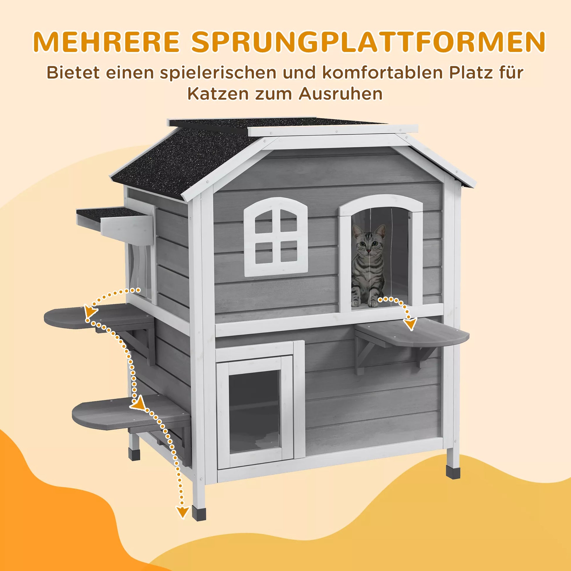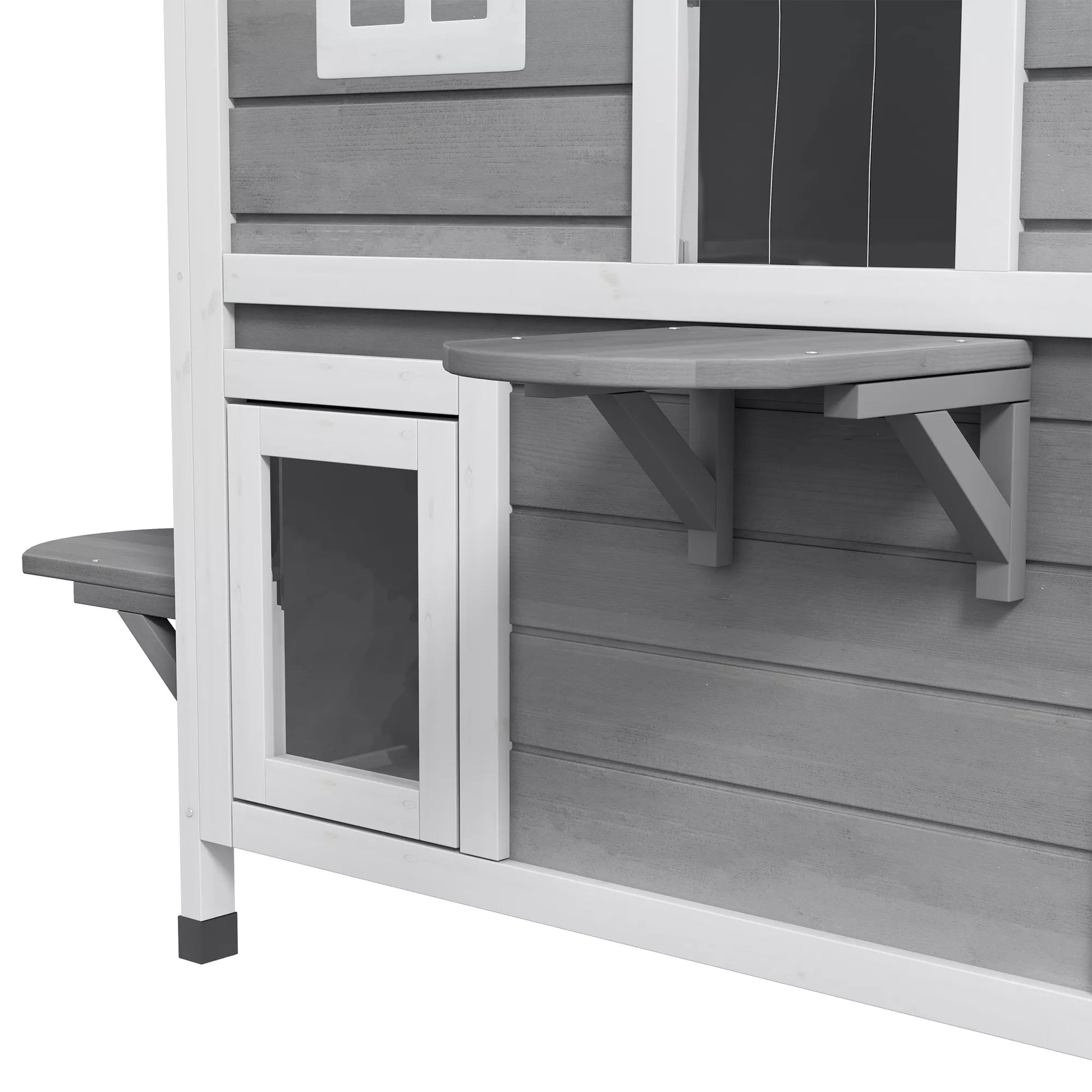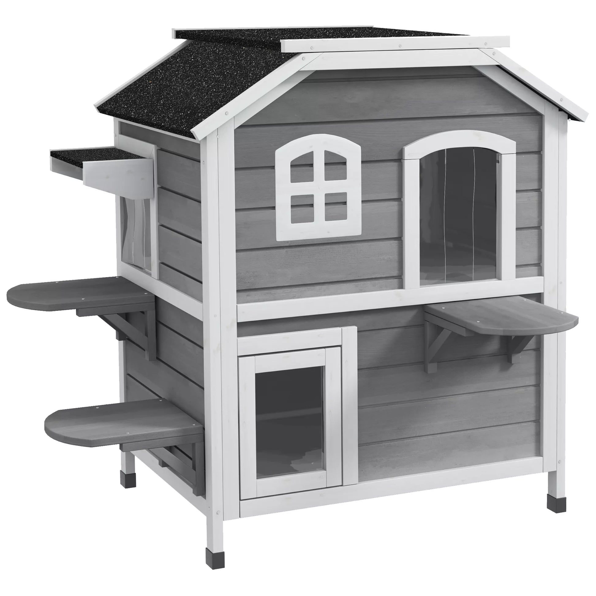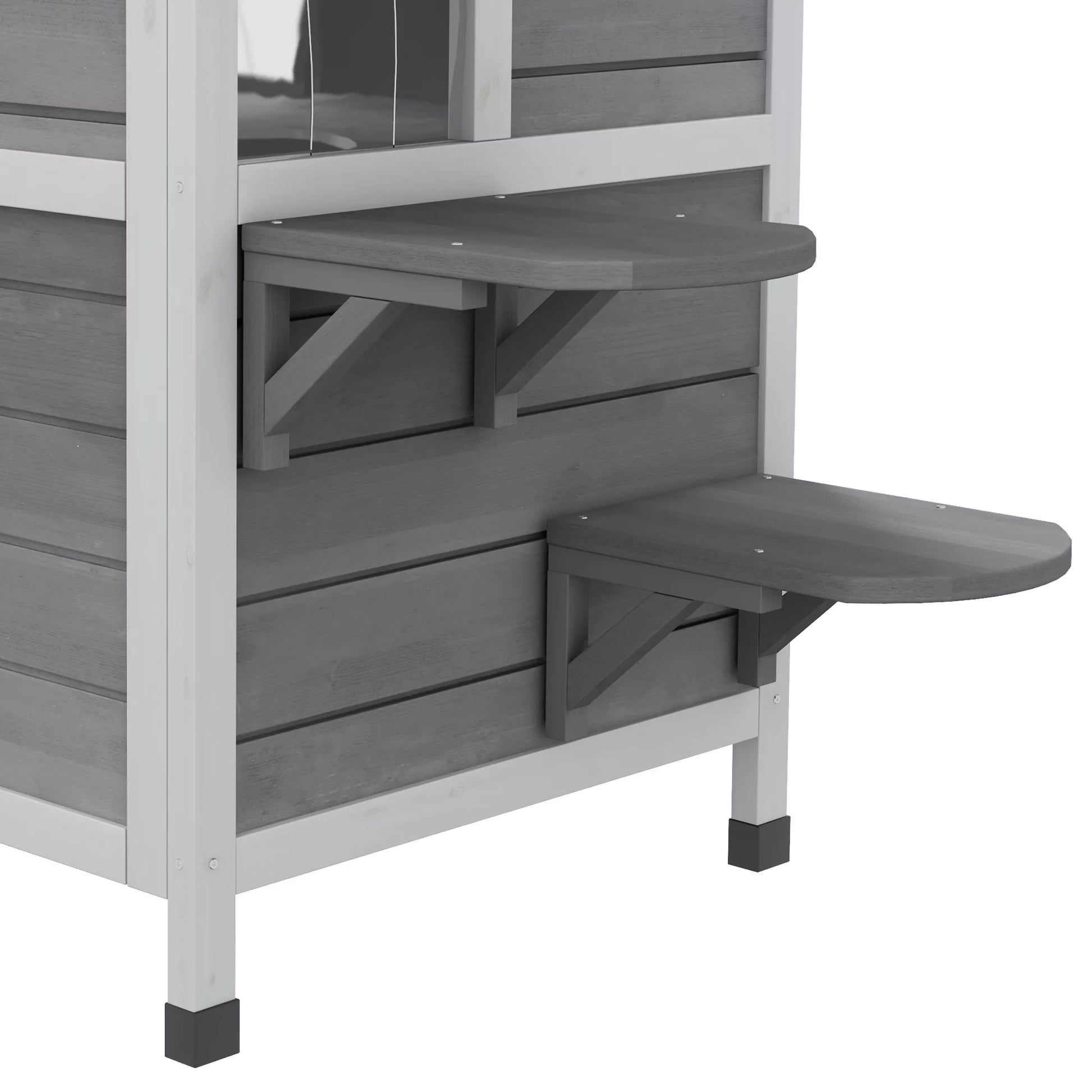 Medinis katės namelis, 2 aukštų, atsparus žiemai, neperšlampamas katės būdelė su bitumine danga, atlenkiamu dangčiu, laipteliais, katės ola lauke, sode, balkone 99,5 x 76 x 91 cm Pilka