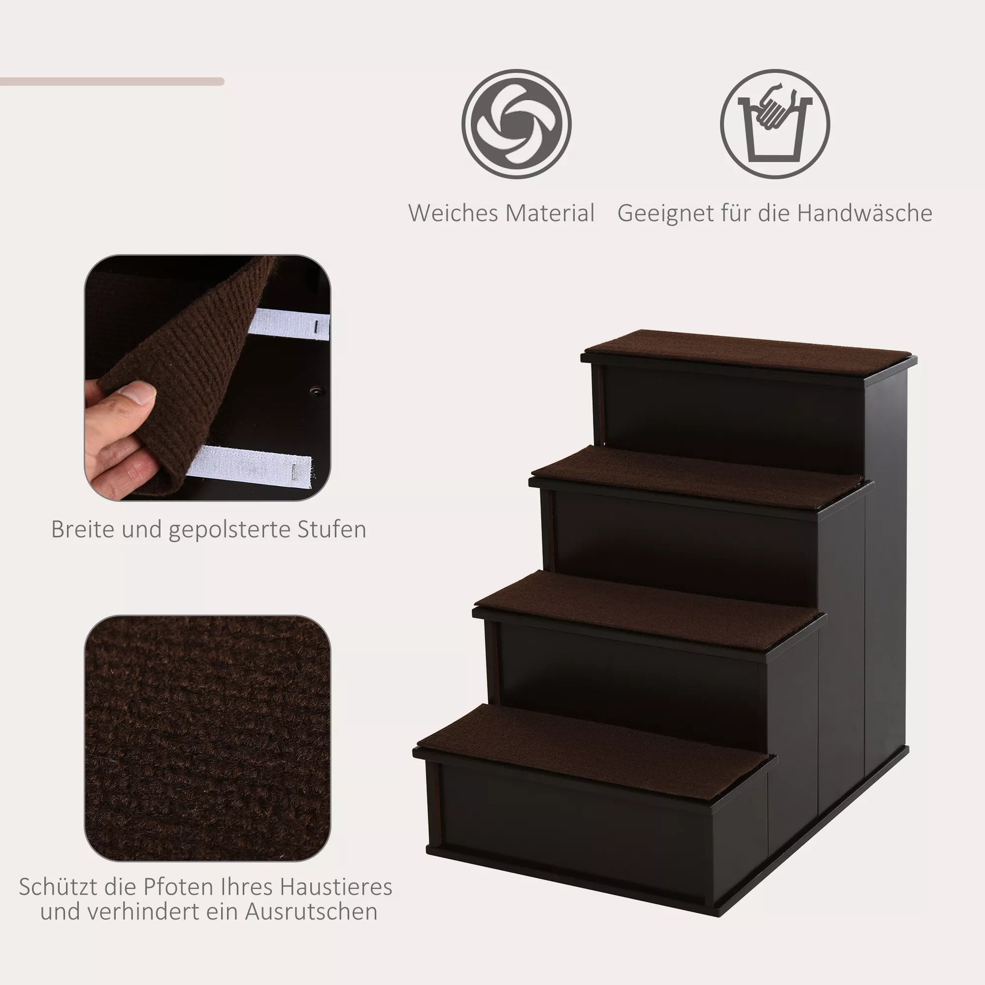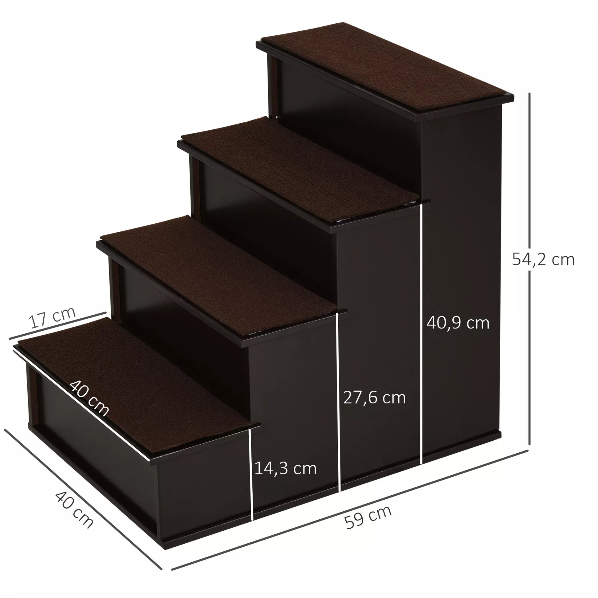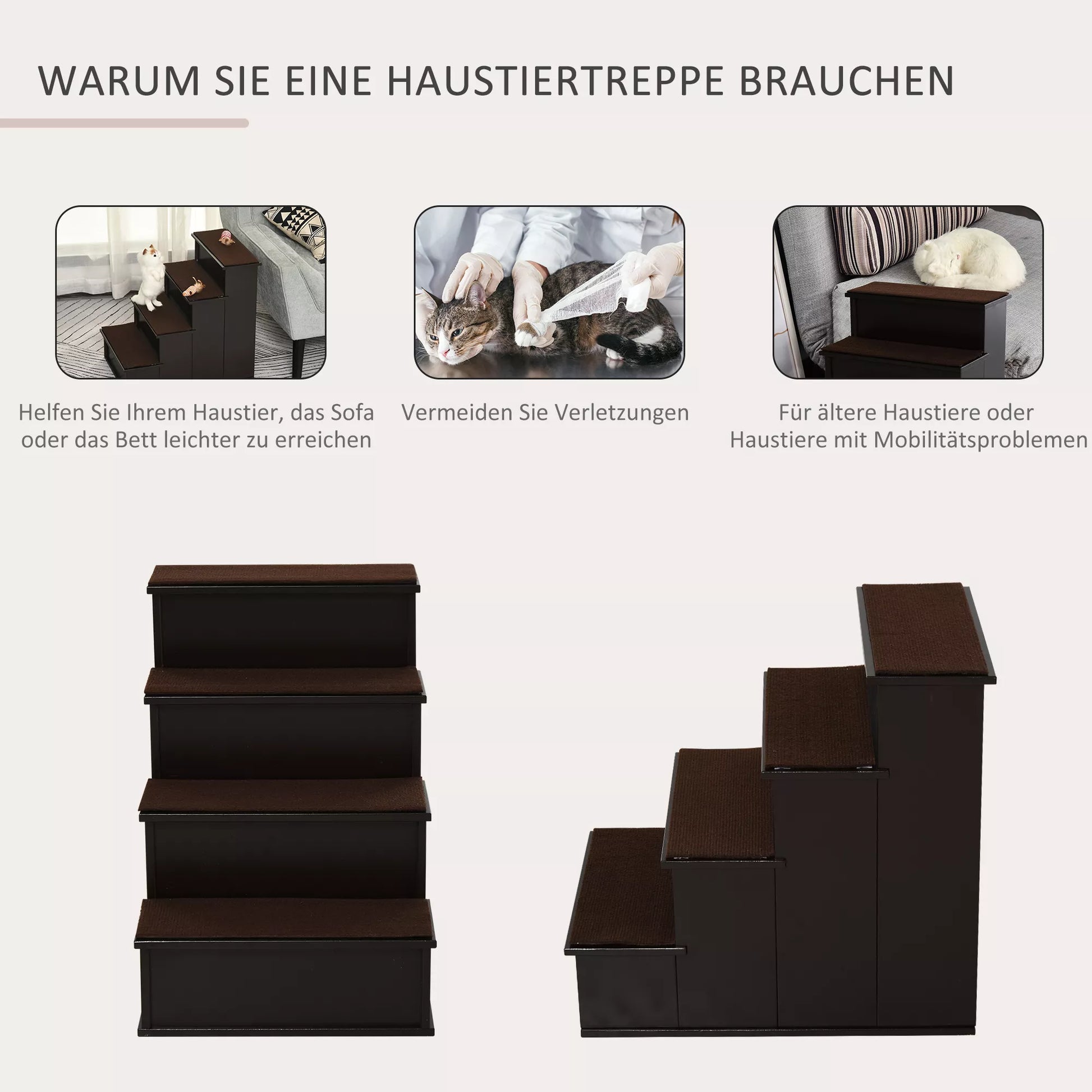 - ✔ 4 laiptelių augintinių laipteliai, tamsios kavos spalvos, puikiai dera prie jūsų esamų baldų
