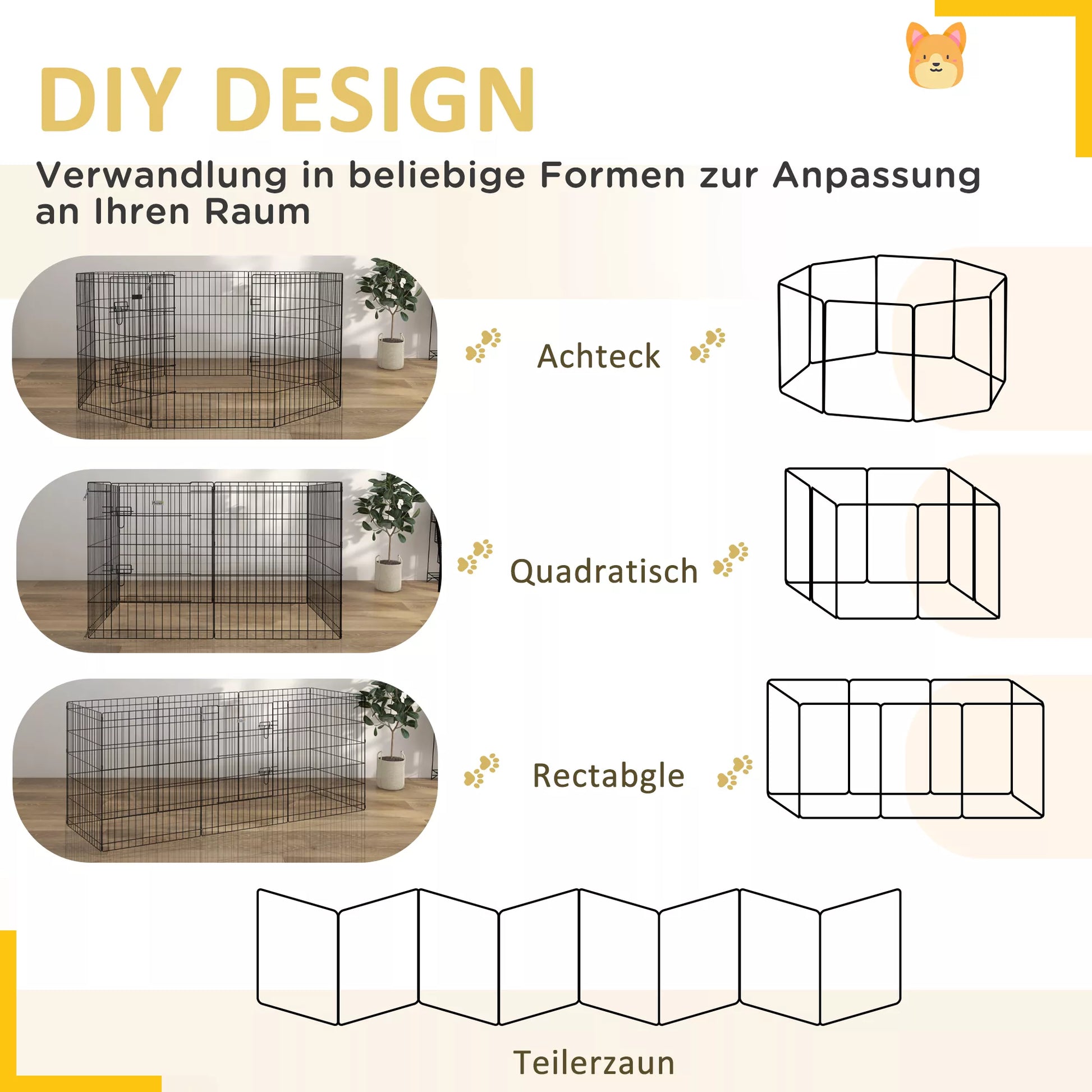 Žaidimų aptvaras padaro žaidimų laiką mažesniems naminiams gyvūnėliams saugesnį. Lankstus naudojimas, jį galima suformuoti į aštuonkampį, kvadratą ar stačiakampį ir pritaikyti bet kokiai patalpai ar sodui. Norint daugiau vietos, jį galima lengvai sujungti su kitu tokiu pačiu aptvaru, taip sukuriant papildomą žaidimų ir poilsio erdvę.