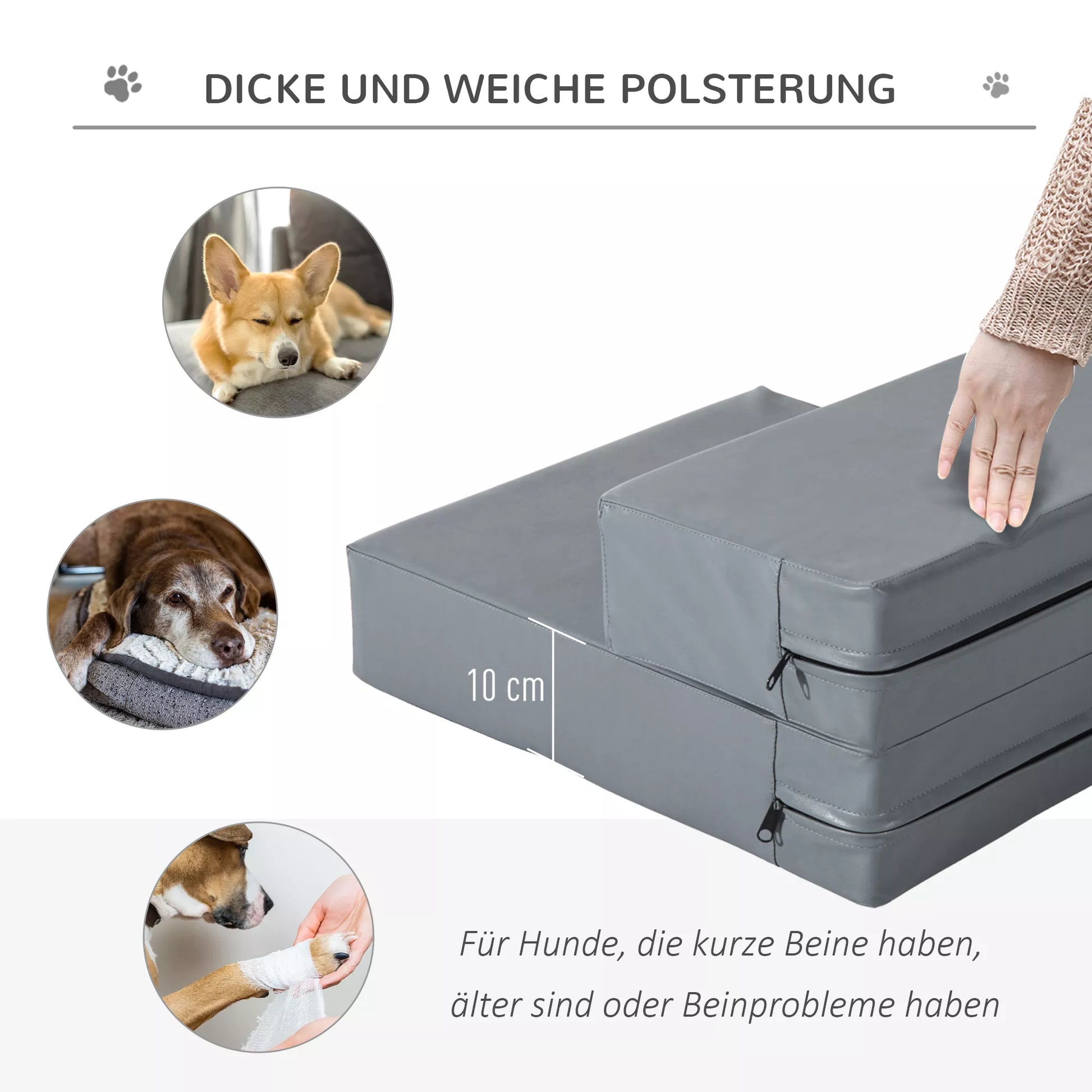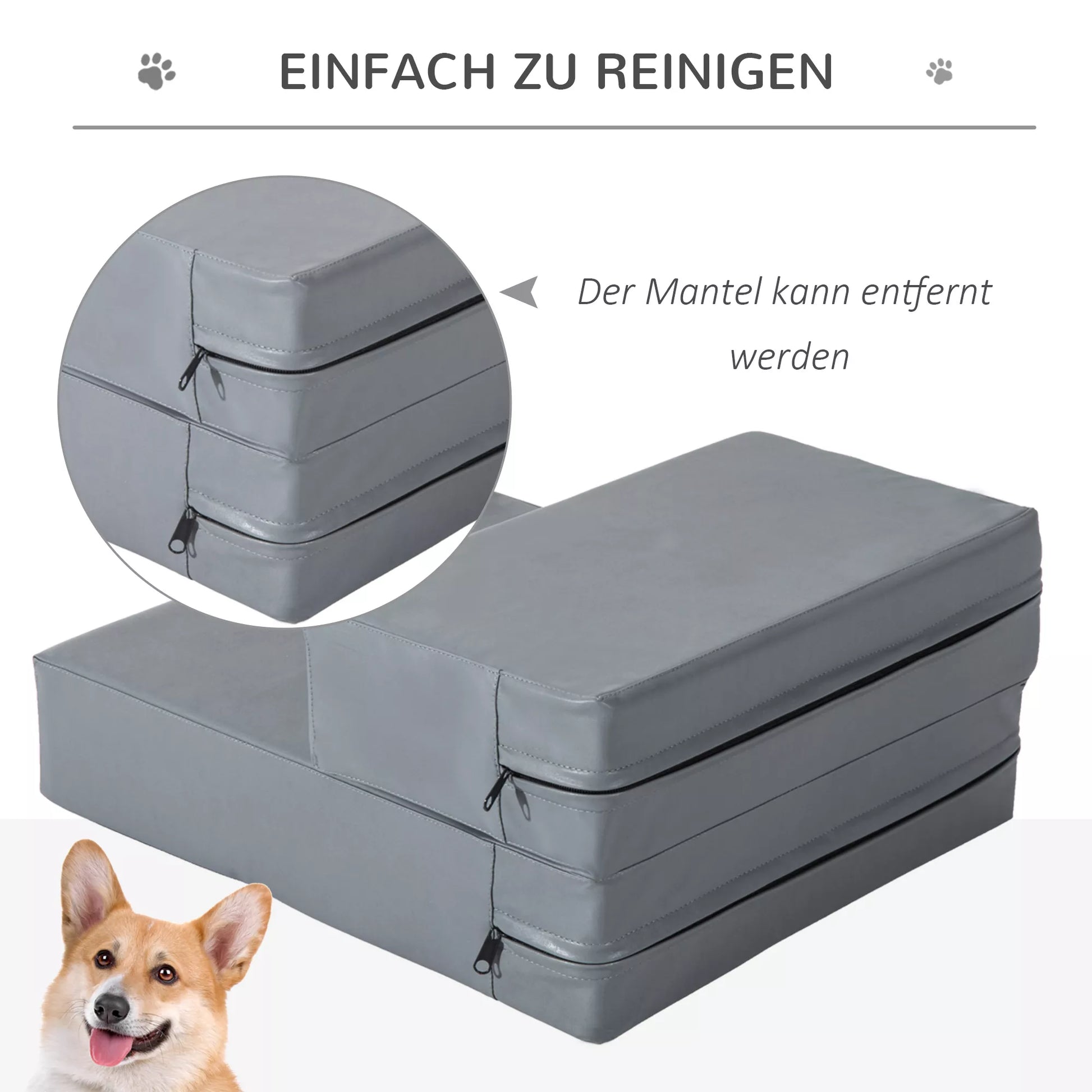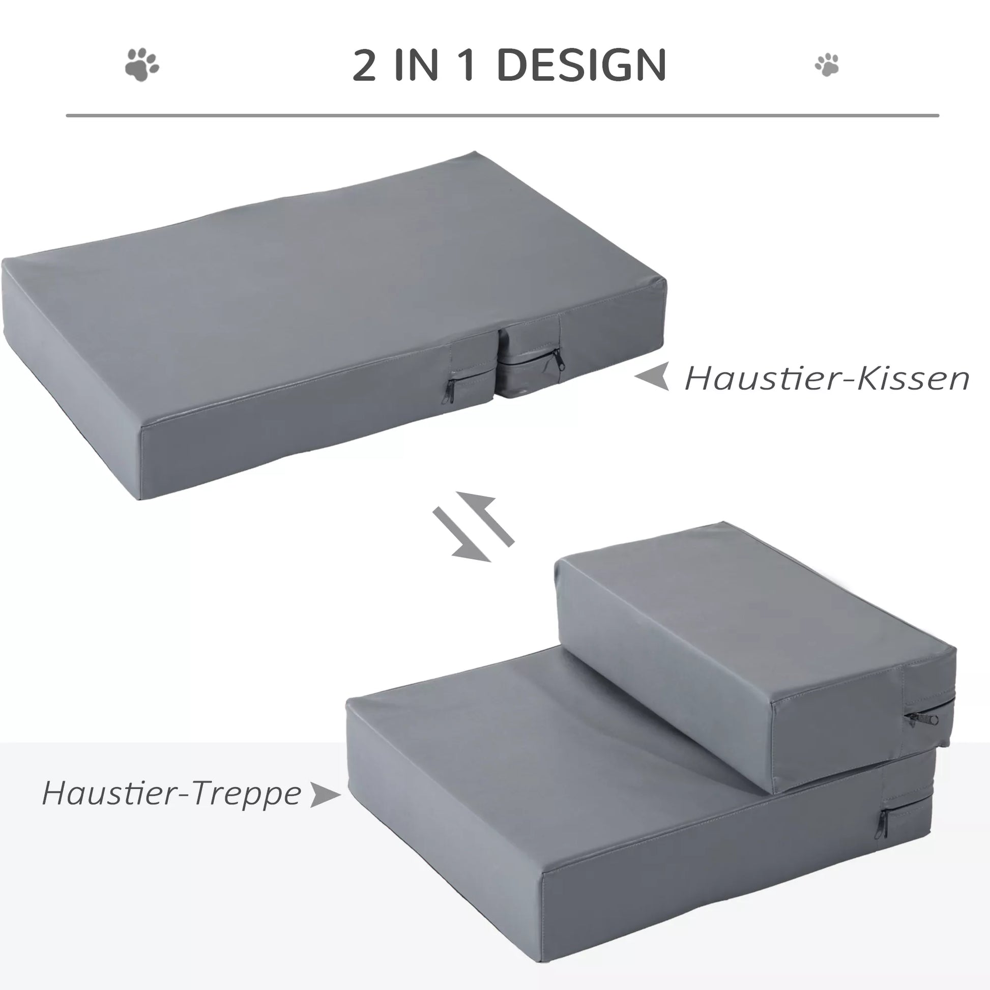 Katės laiptai ypač tinka vyresnio amžiaus gyvūnams, turintiems sąnarių problemų. Taip jie lengvai pasiekia sofą ar kitas aukštesnes vietas. Dėl 2-in-1 dizaino pagalvėles taip pat galima išdėstyti taip, kad jas būtų galima naudoti kaip patogią pagalvėlę. Aukštos kokybės PU oda lengvai valoma, o užvalkalas prireikus nuimamas. Dėl storos putų paminkštinimo pagalvėlės yra ypač minkštos ir patogios. Neutralios spalvos laiptai suteikia jaukų dizainą ir puikiai dera prie jūsų interjero.