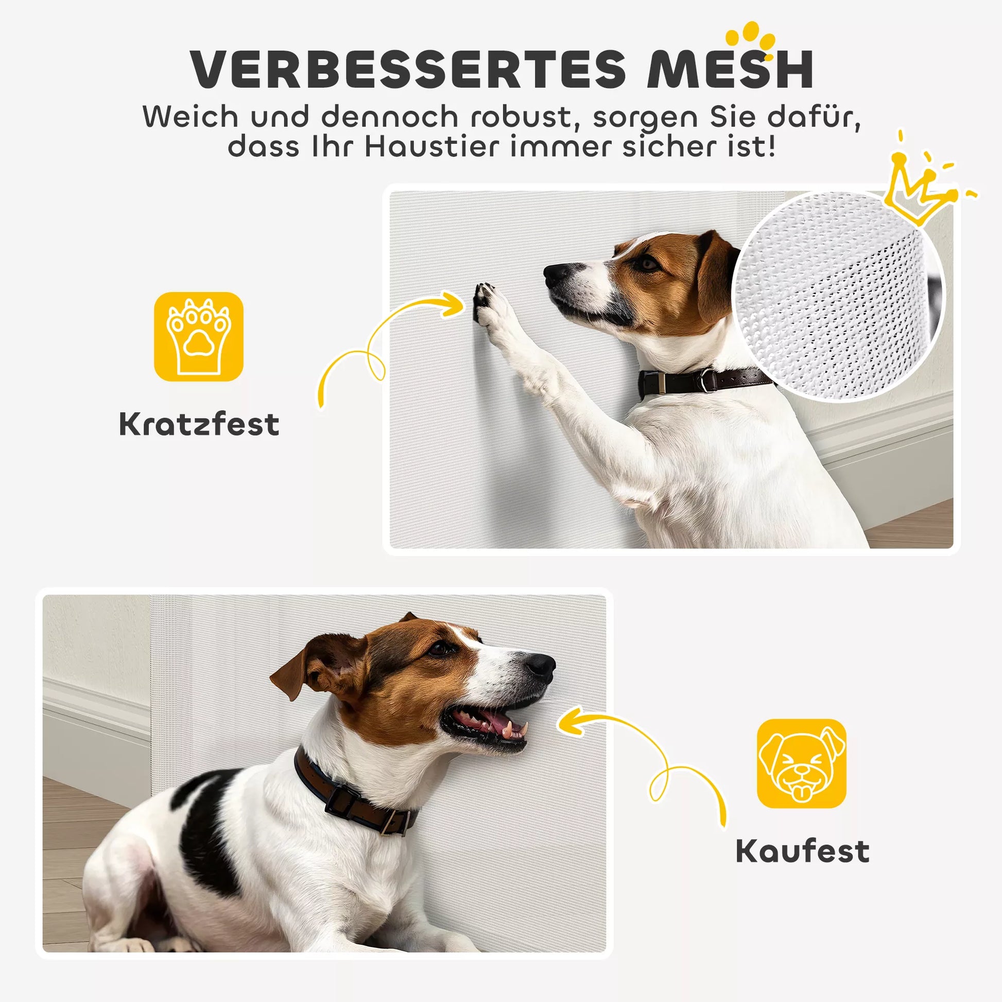 Apsaugokite savo mažą šunį su mūsų ištraukiamaisiais varteliais, tinkamais durims iki 136 cm ir šunims iki 40 cm aukščio ties pečiais. Be atramine sijos – saugus praėjimas jūsų šeimai. Greitas montavimas su plėtimosi kaiščiais. Minkštas, padengtas tinklelis apsaugo jūsų šunį, o fiksavimo jungiklis palengvina naudojimą. Puikiai tinka koridoriams ir durims – ideali sprendimas jūsų namams!