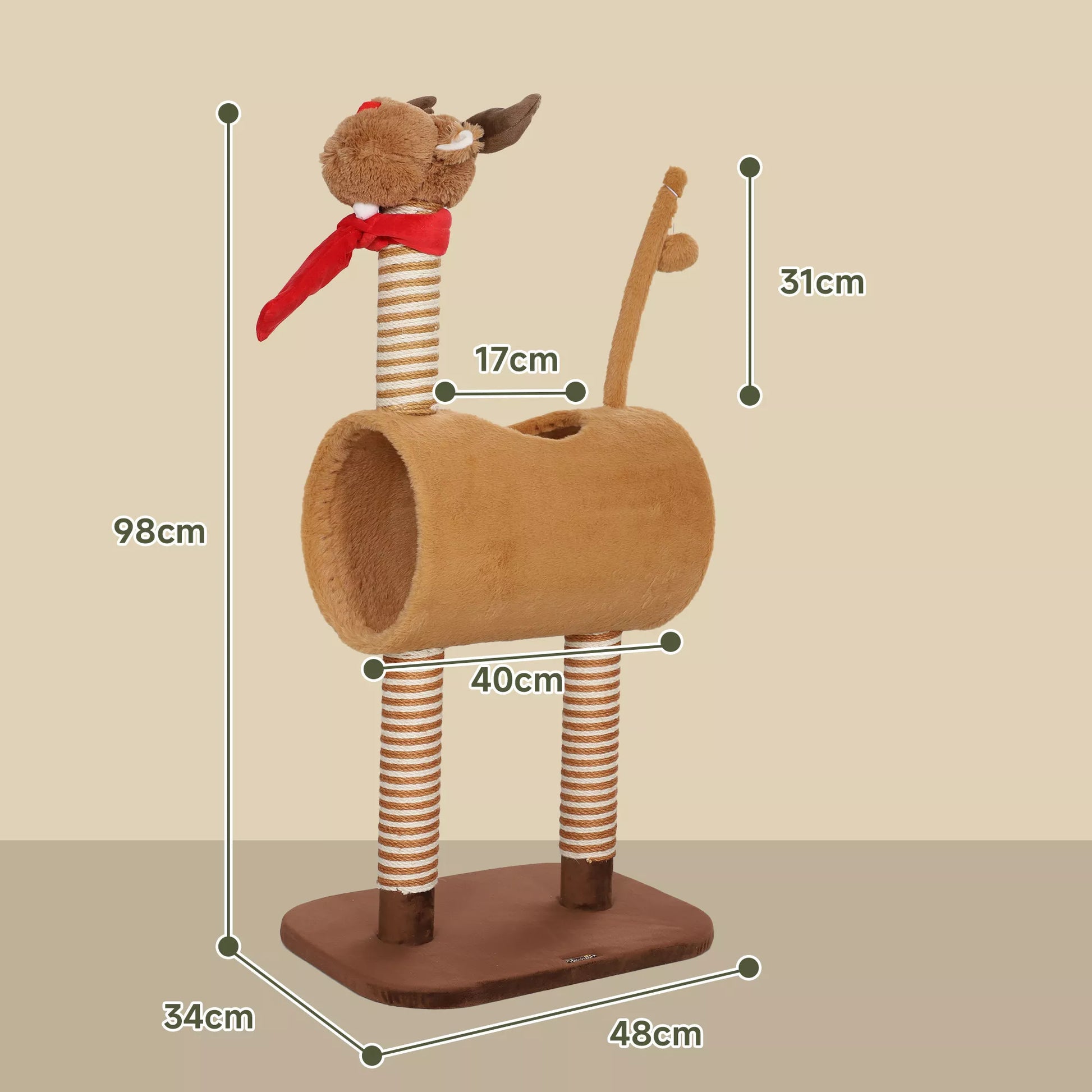 Kačių namelis 98 cm, kačių bokštas elnio dizaino, su guoliu, žaisliniu kamuoliuku, džiuto stiebais, rudas