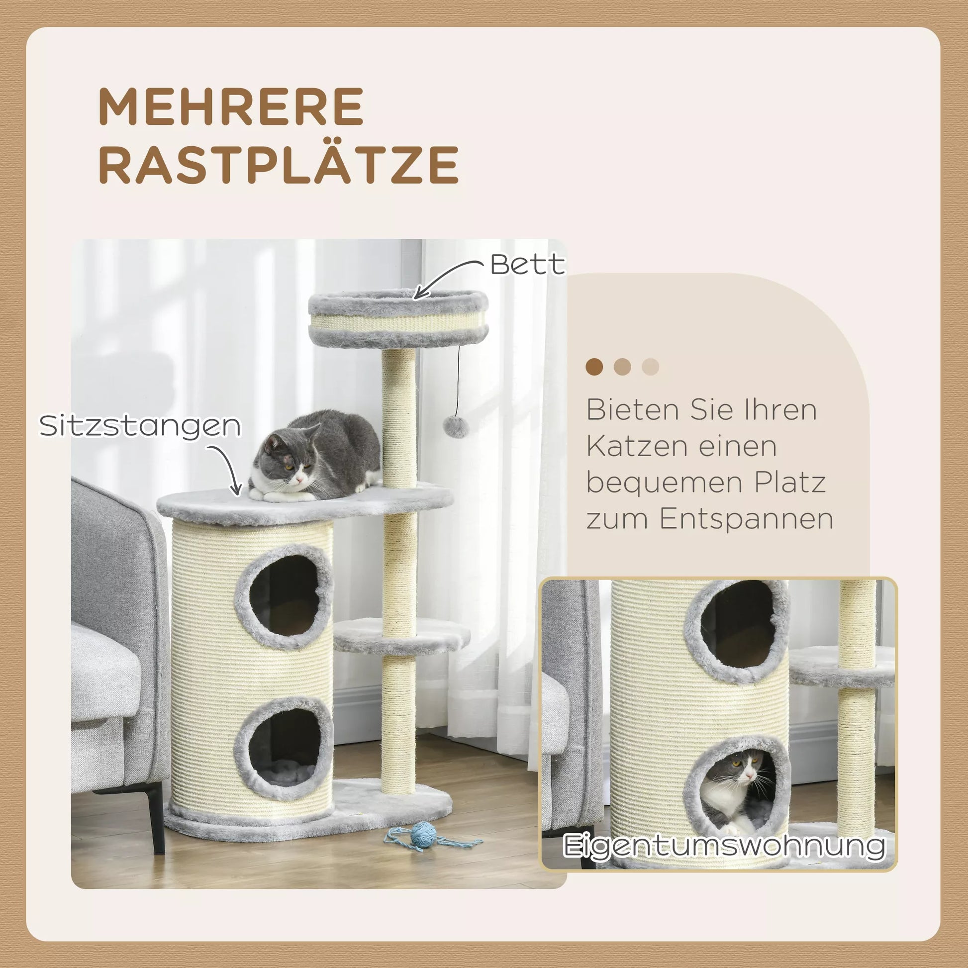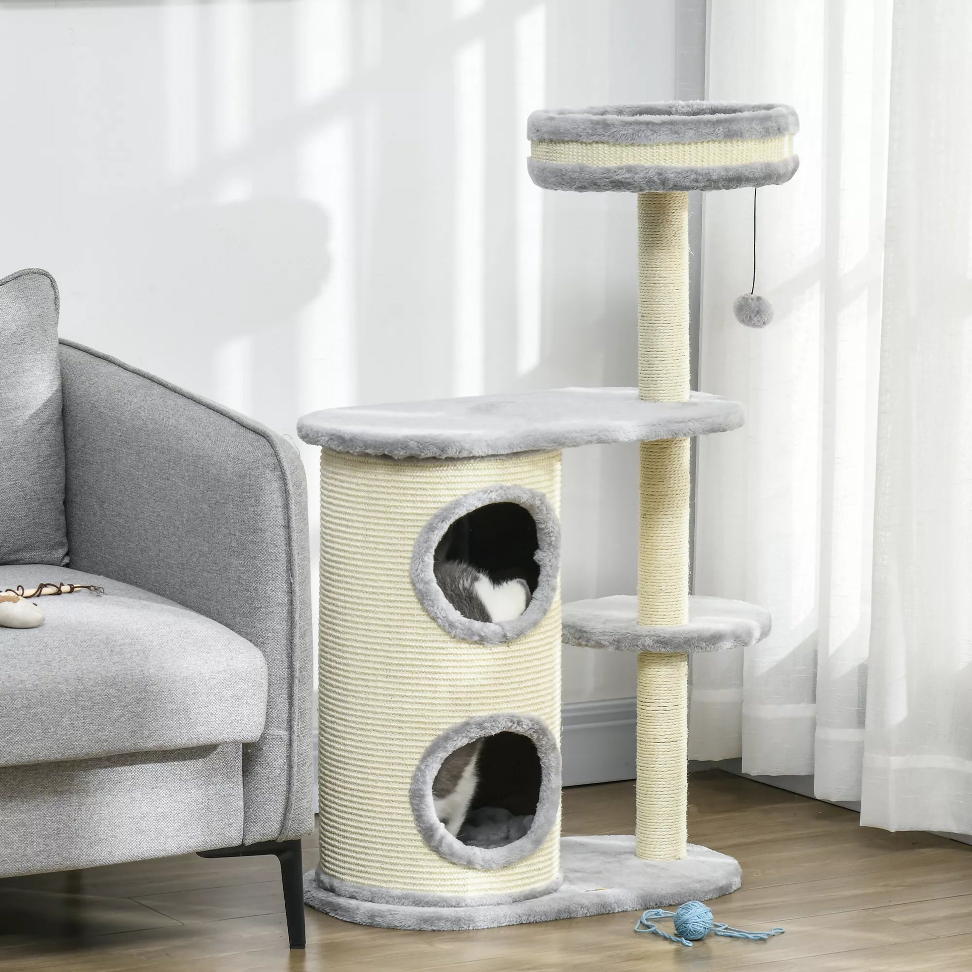 Kačių draskyklė, su sisaliniais stulpeliais, minkštu pliušu, daugiaaukštė, su kamuoliukų žaislu, pilka, 59x35x100 cm