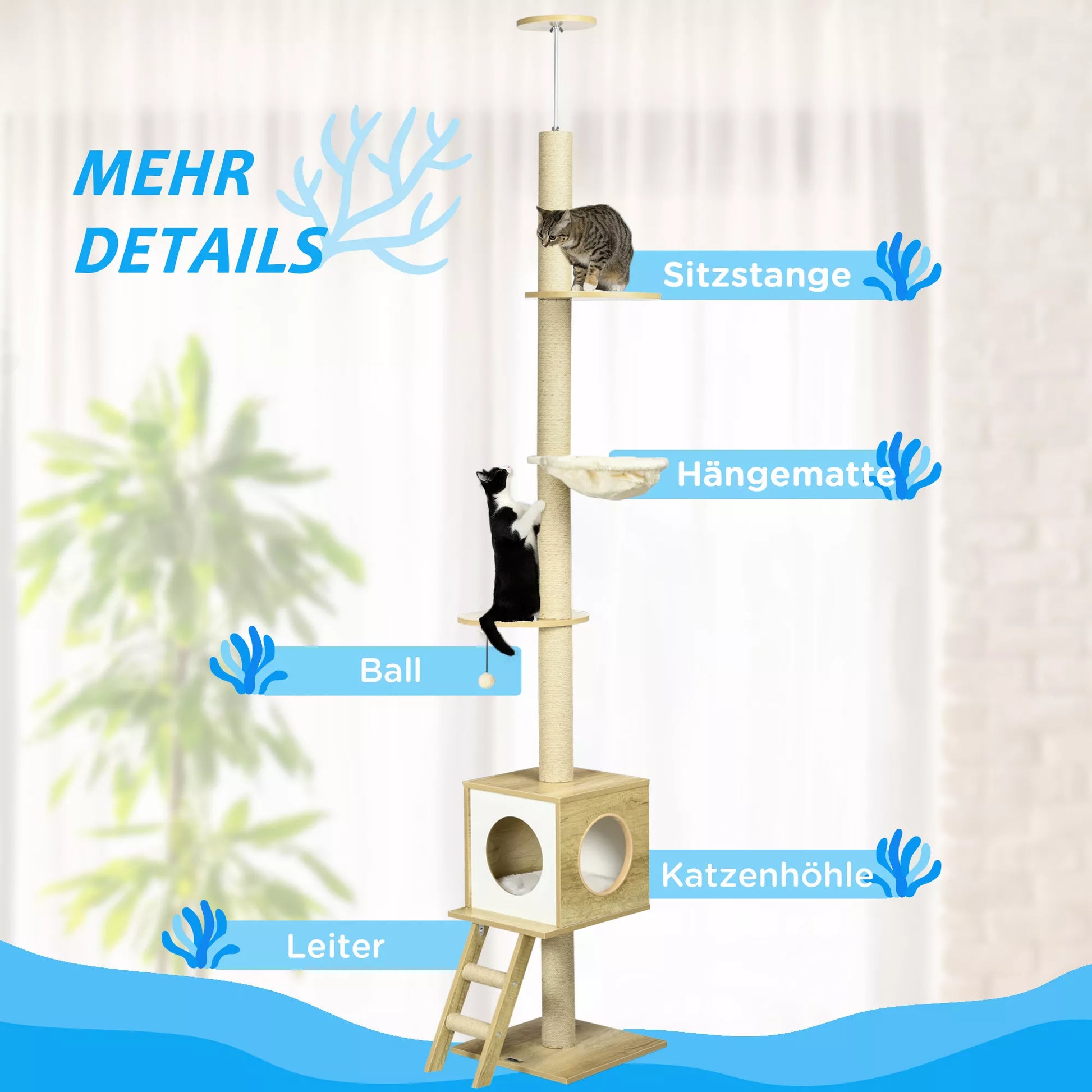 - ✔ Draskyklės stulpeliai su džiuto virve patenkina kačių draskymo instinktus ir neleidžia joms gadinti jūsų baldų