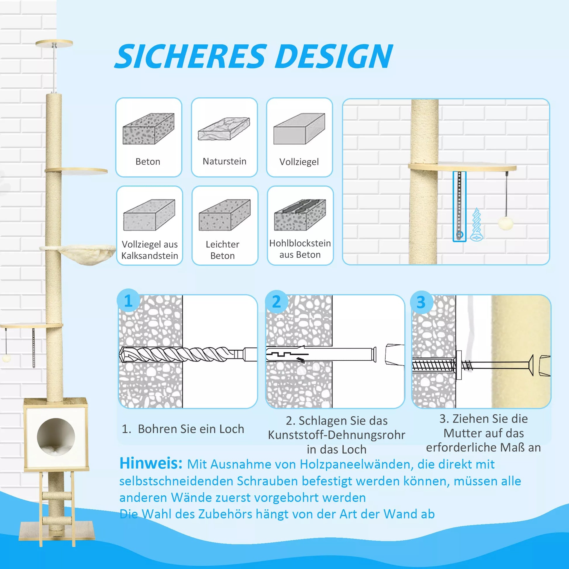 Šis iki lubų siekiantis namelis su draskykle yra ideali žaidimų ir poilsio vieta jūsų augintiniui. Kelios platformos leidžia katėms smagiai laipioti ir siūlo įvairias poilsio vietas jaukiam atsipalaidavimui. Namelis su draskykle pagamintas iš ilgaamžės medžio drožlių plokštės ir turi apsaugą nuo apsivertimo, todėl jūsų augintiniai gali draskyti ir žaisti nesijaudindami. Atsiradus nuoboduliui, kabantis žaidimų kamuoliukas suteiks pramogų.