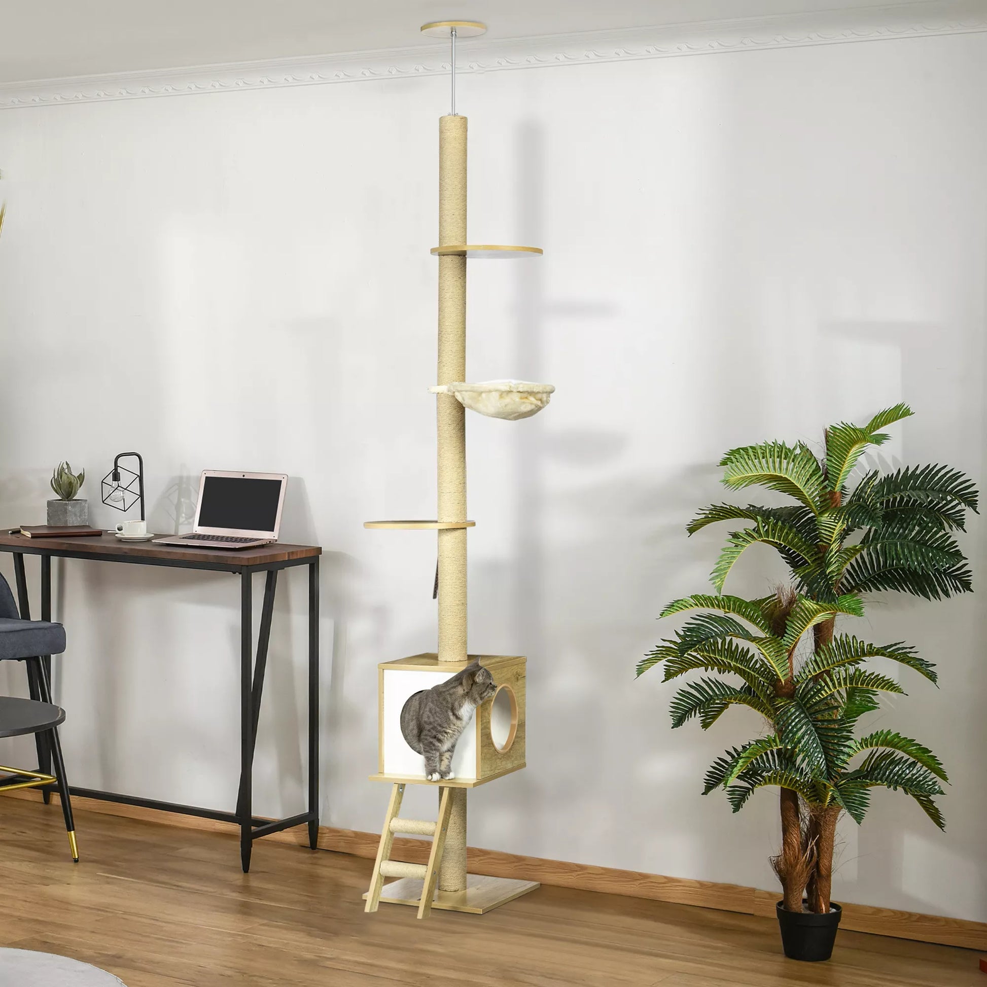 Kačių draskyklė iki lubų, su kačių nameliu, dviem platformomis, hamaku, apsauga nuo apvirtimo, šviesiai rudos ir smėlio spalvos, 40 x 40 x 260 cm