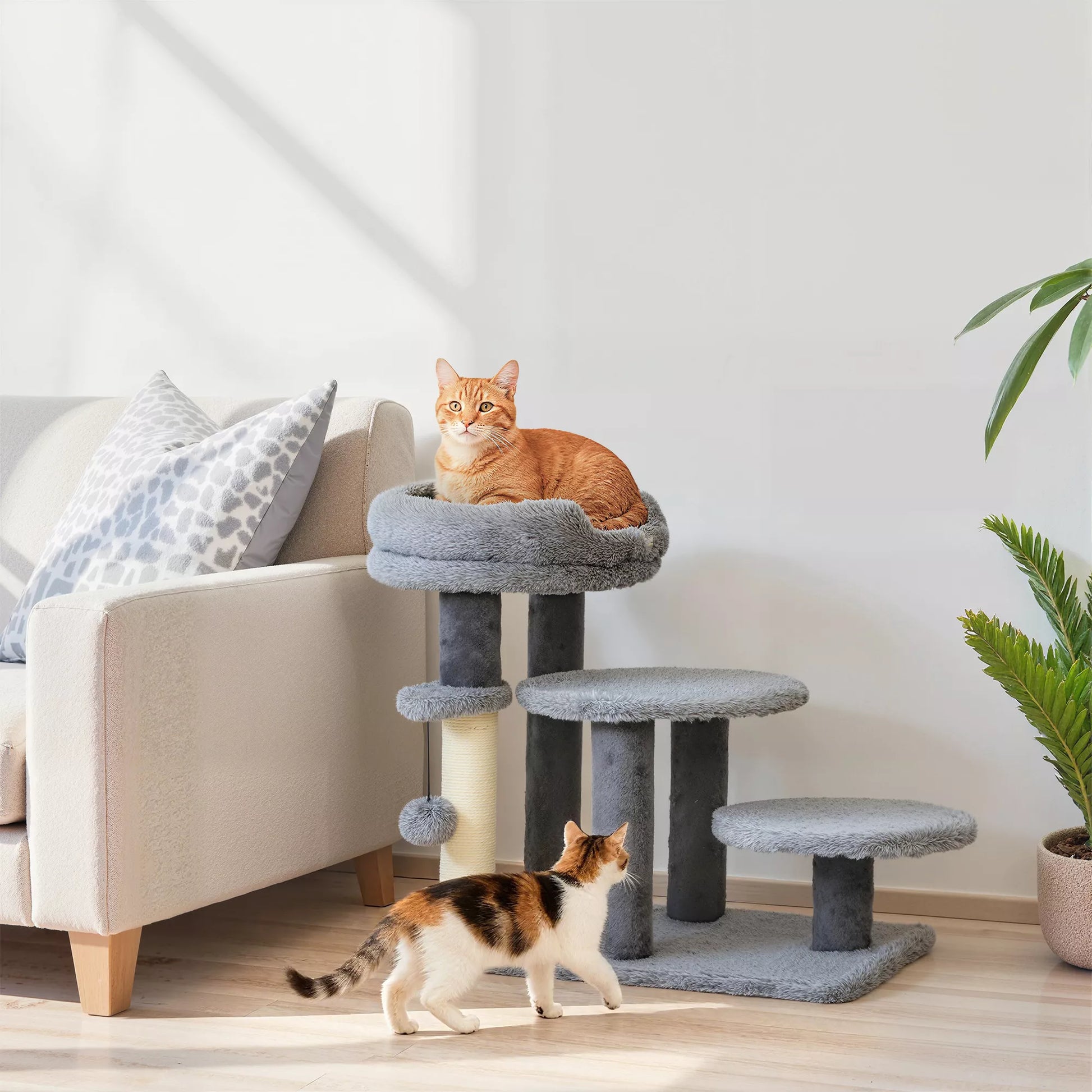 - ✔ Trys laiptelių pakopos skatina aktyvių kačių judėjimą ir laipiojimą