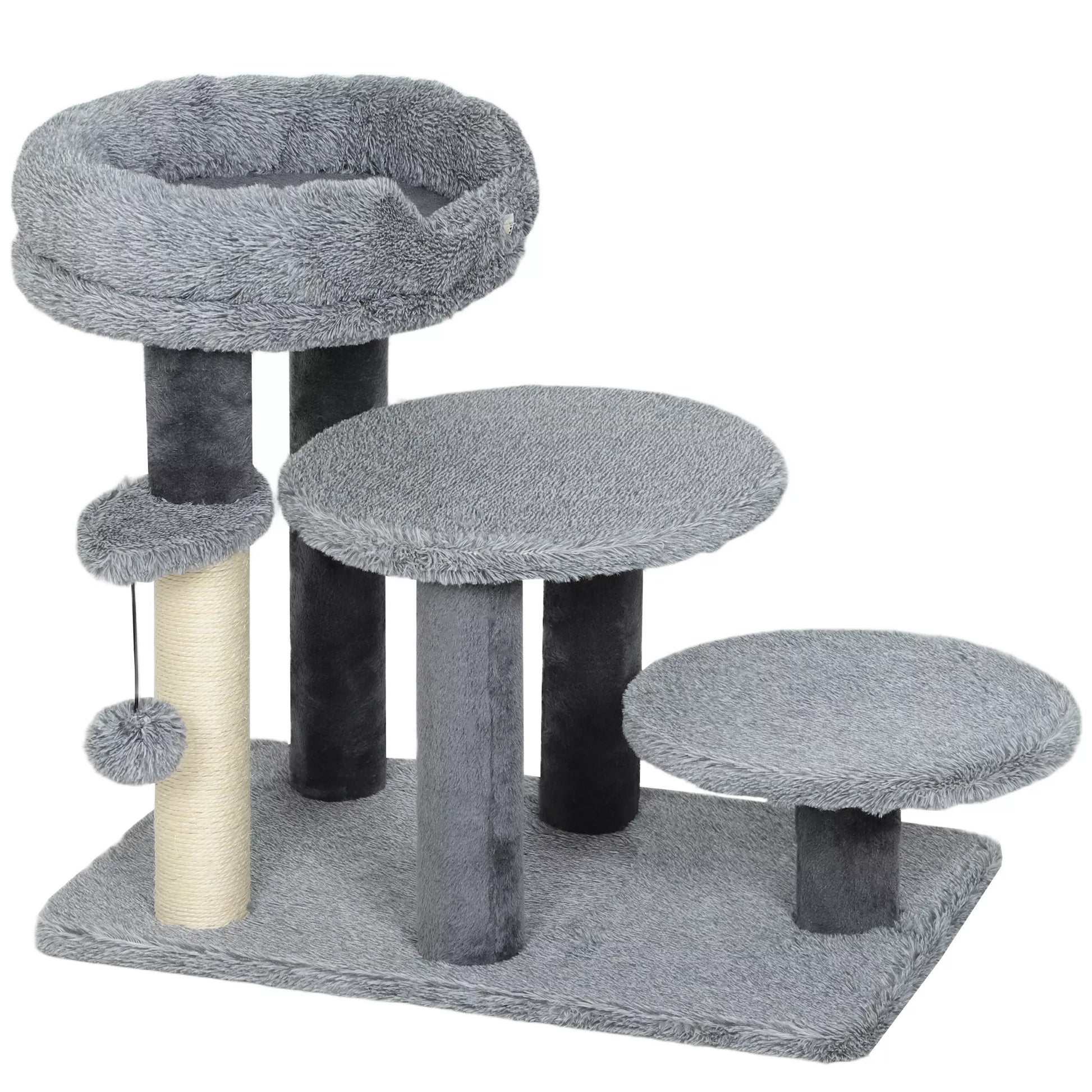 Kačių medis ir laipteliai, plati bazė, pliušinis audinys, sisalio draskyklė, pilkos spalvos
