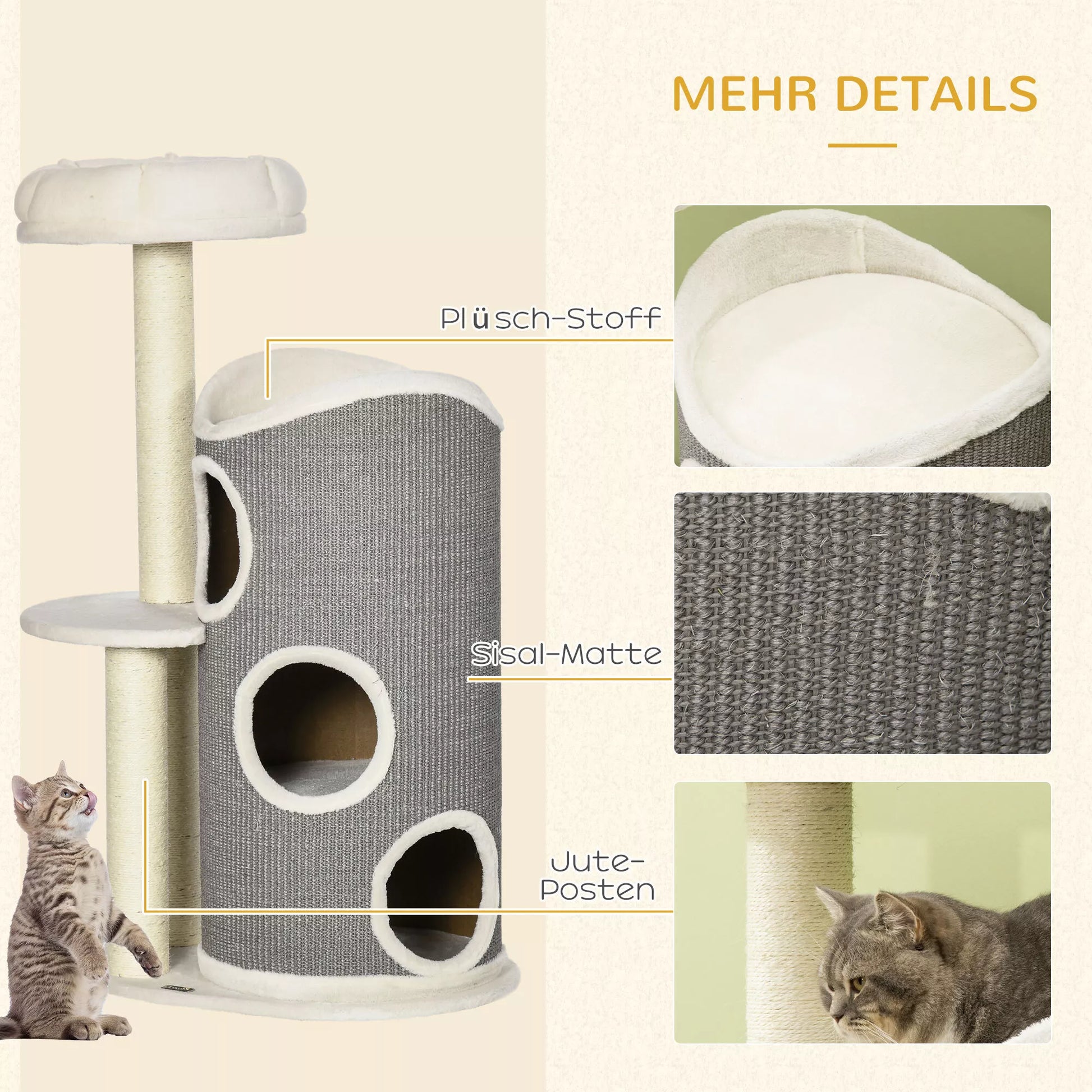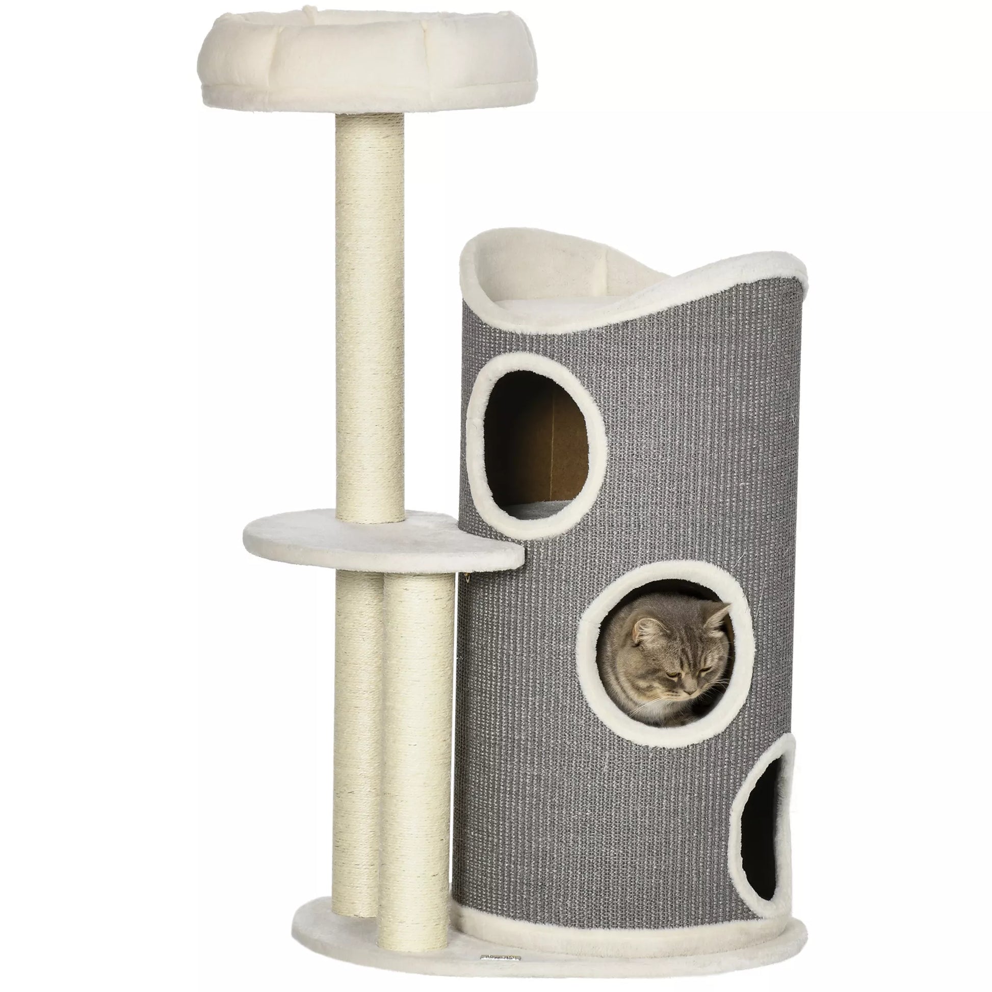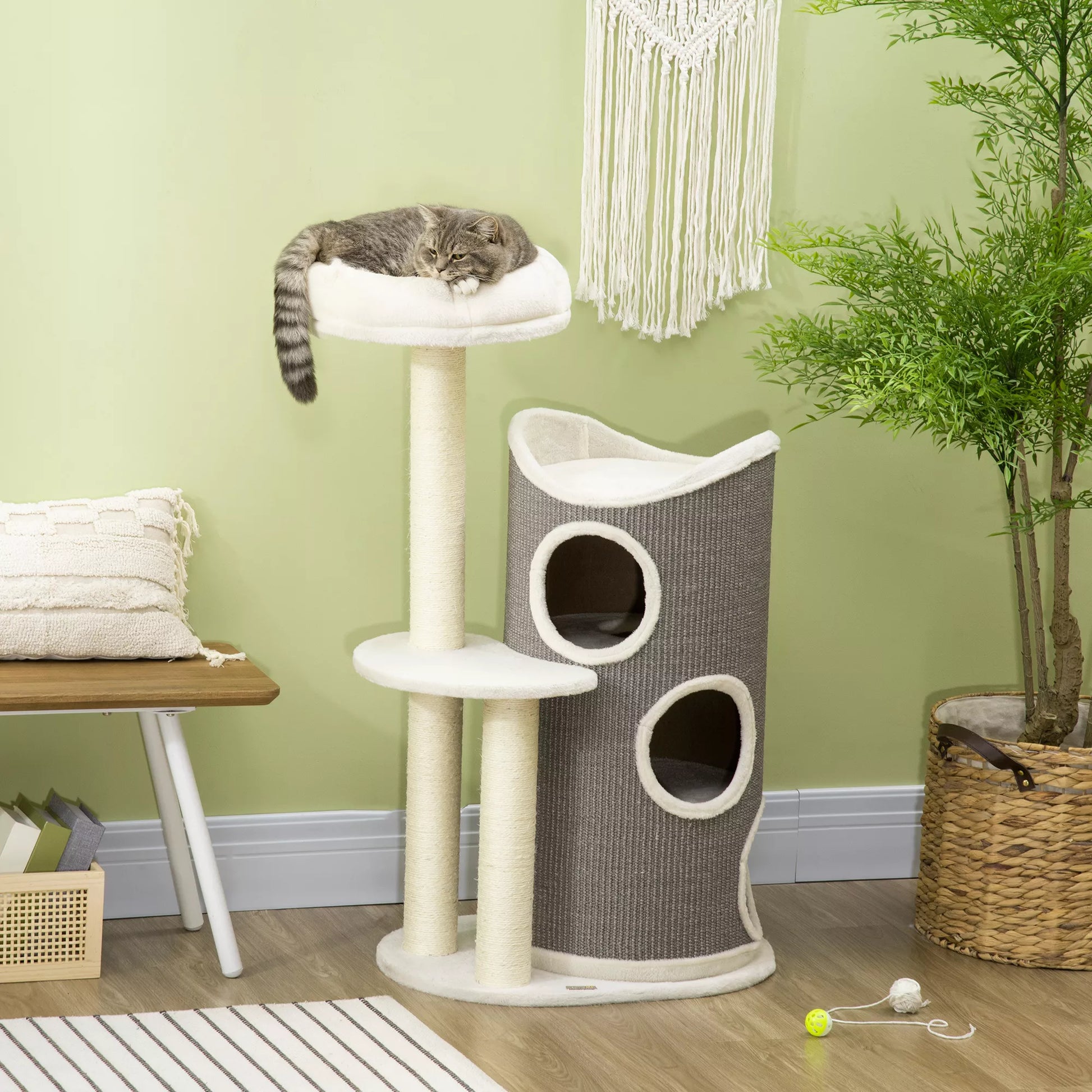 Kačių medis su kačių guoliu ir braižymo statine katėms, 60 cm x 44,5 cm x 109 cm, Pilka + Natūrali + Balta