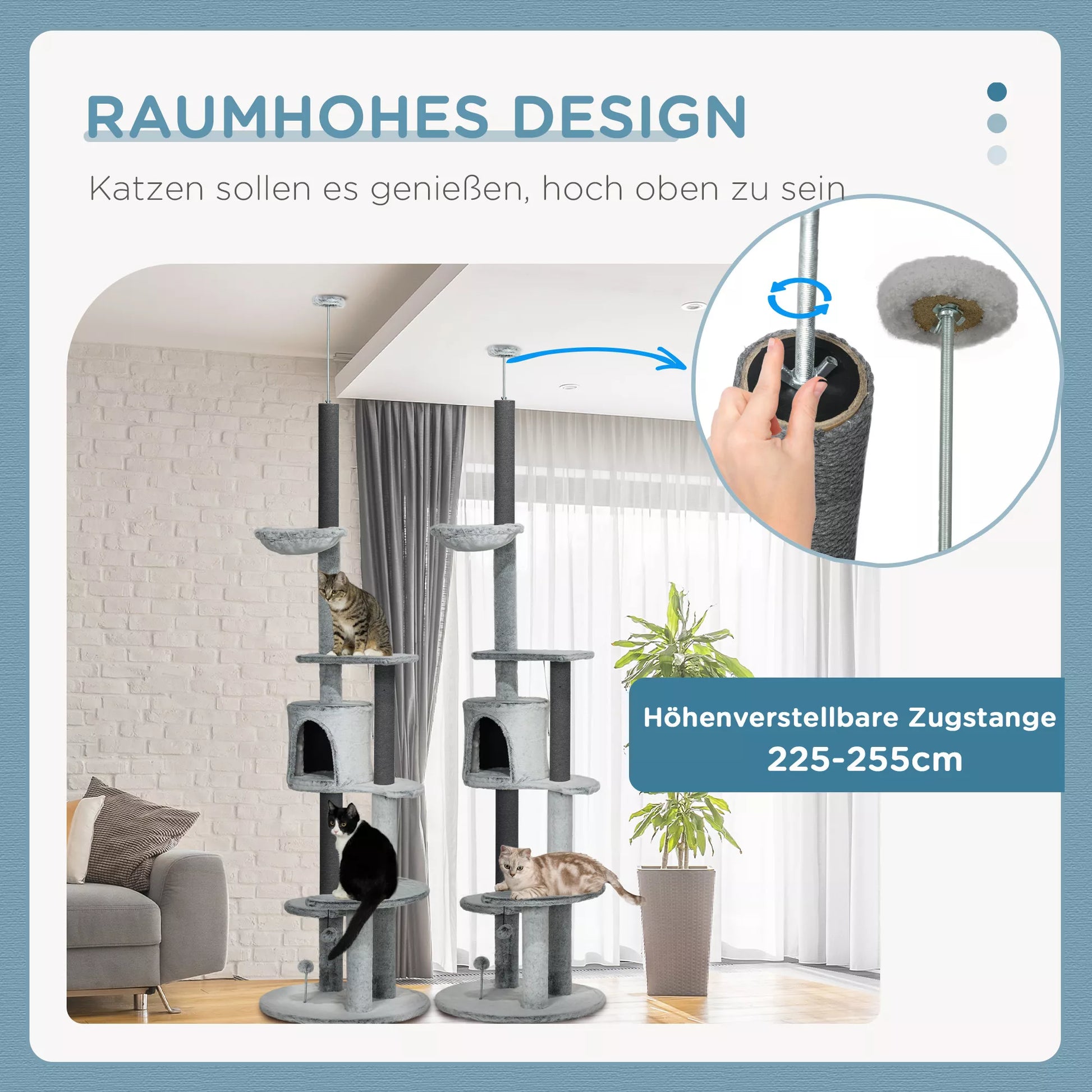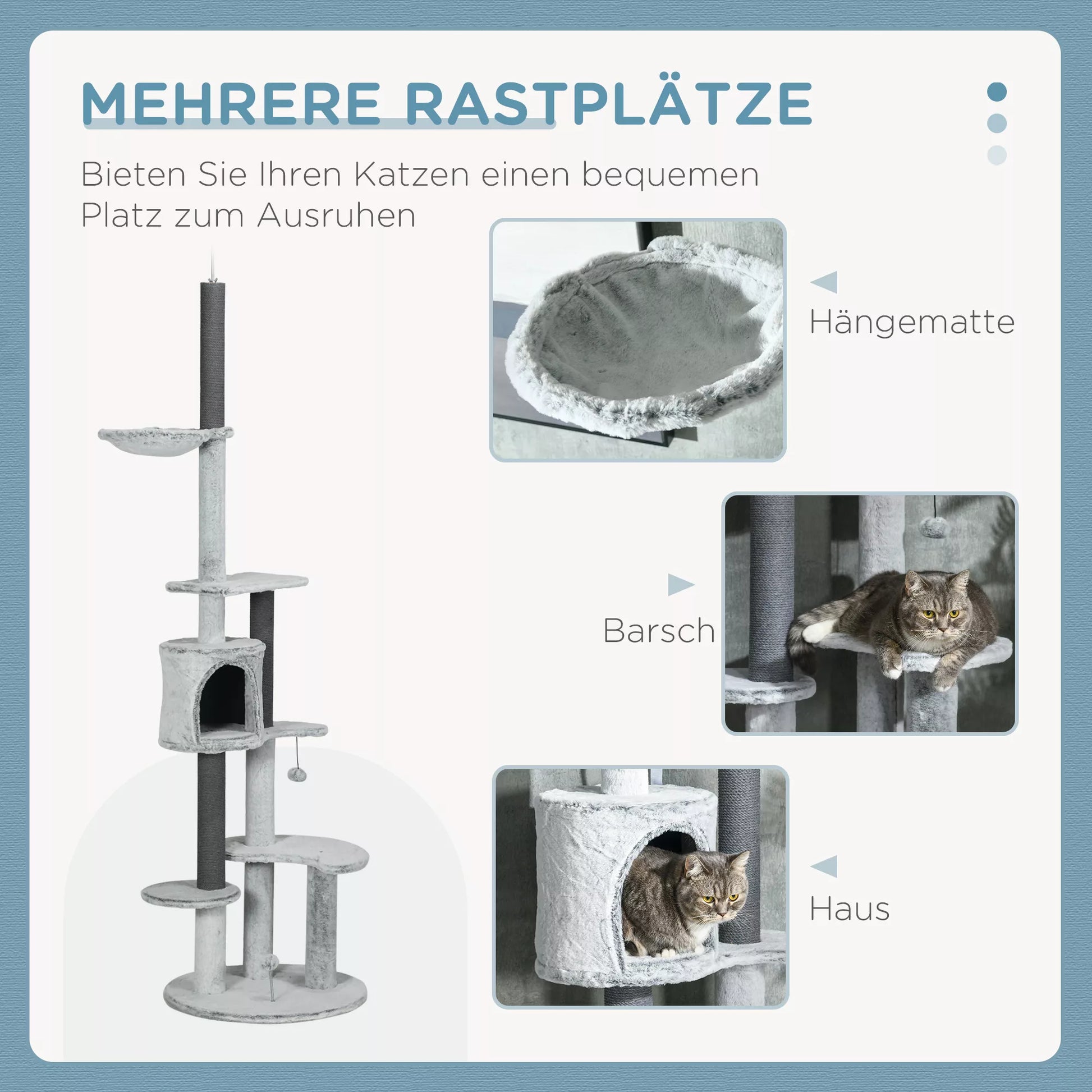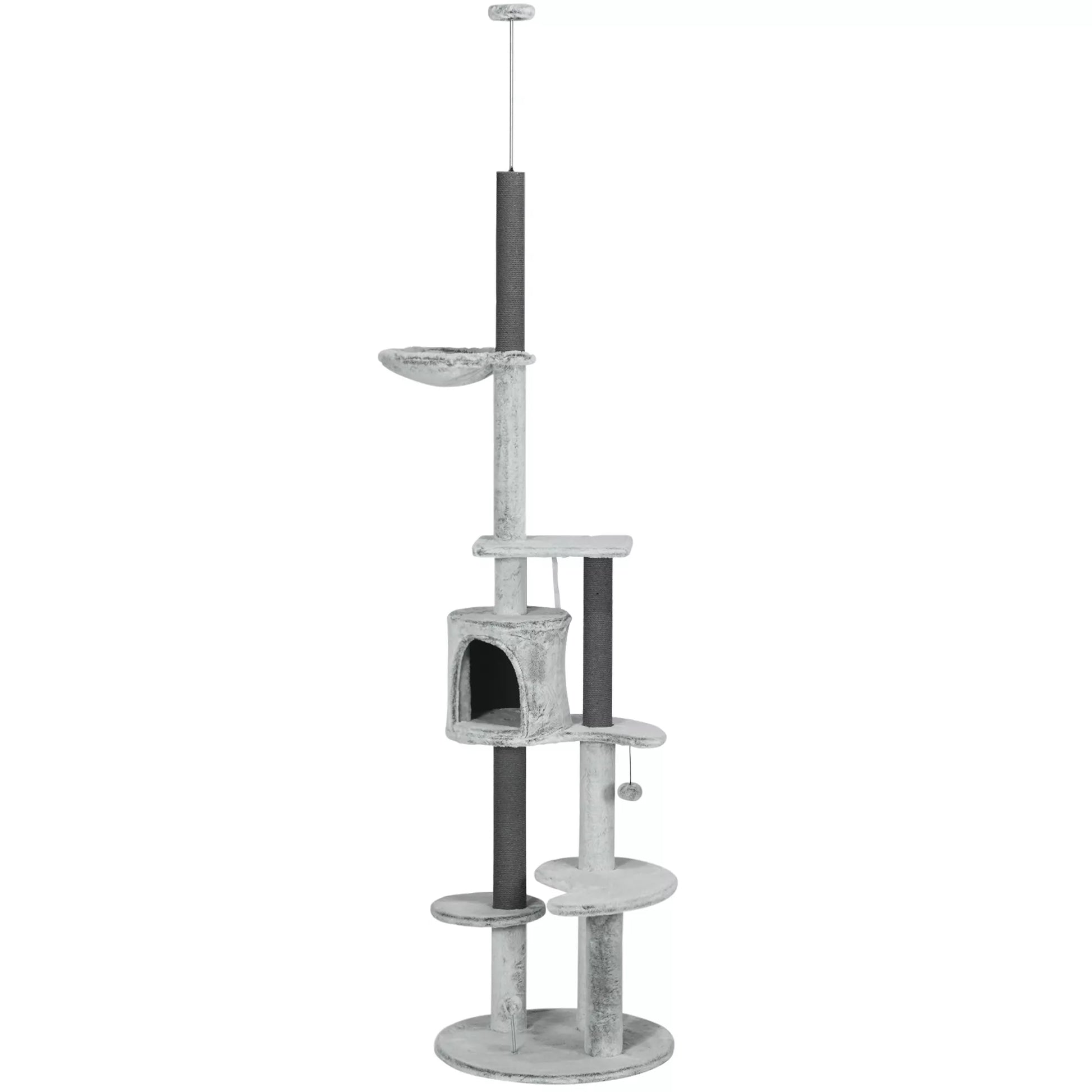 Katės medis su lubų įtempiu, hamaku, nameliu, platformomis, žaisliuku, 225-255cm, Pilkas