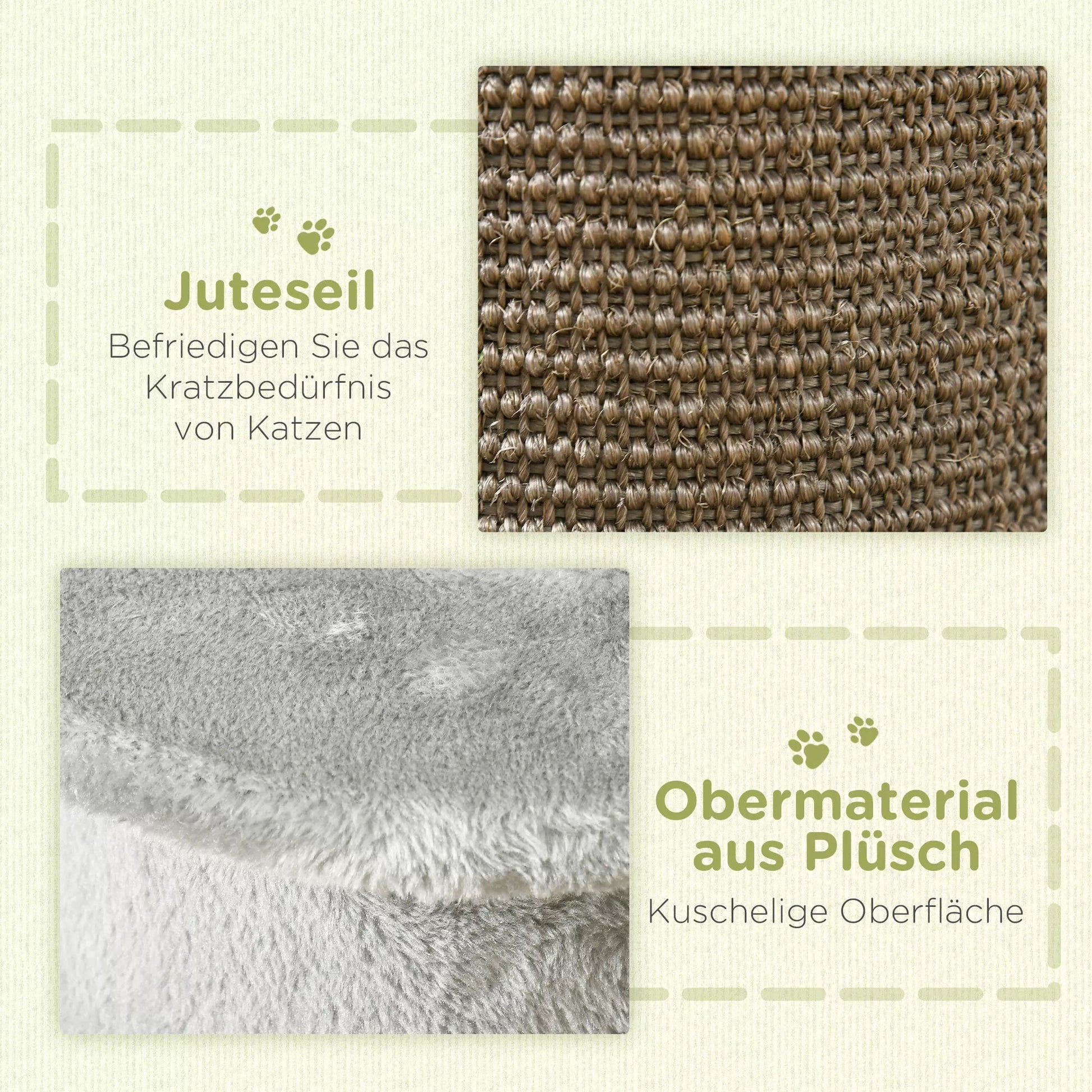 Katės draskyklė su žaislu, komplekte 2 kamuoliukai. Minkštas pliušas, 34 cm x 25,5 cm x 58 cm, pilkos spalvos.