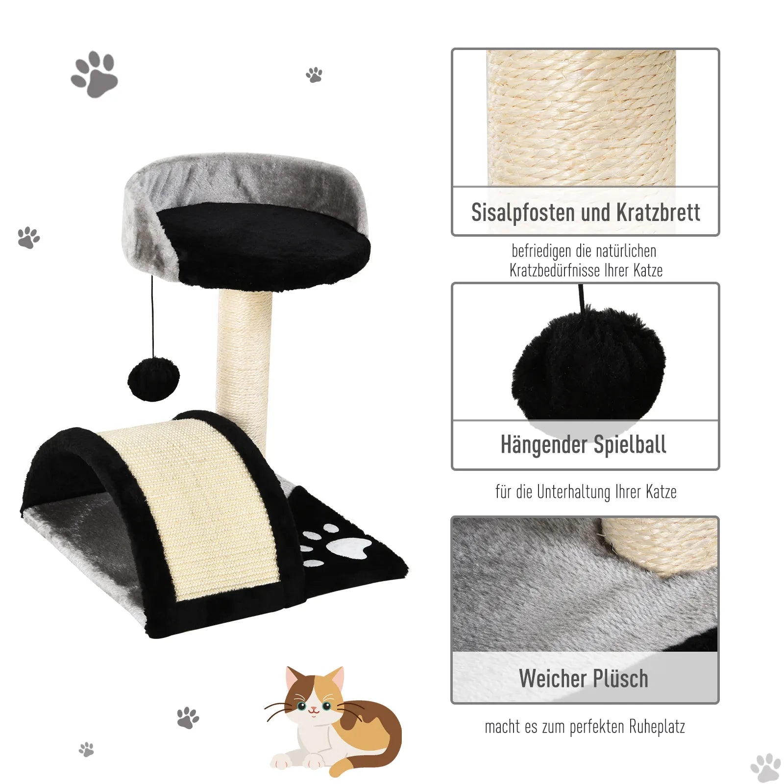 Katės draskyklė su žaidimo kamuoliukais, su sizalinės virvės draskomosiomis atramomis, juoda spalva, 35,5 x 37 x 46 cm