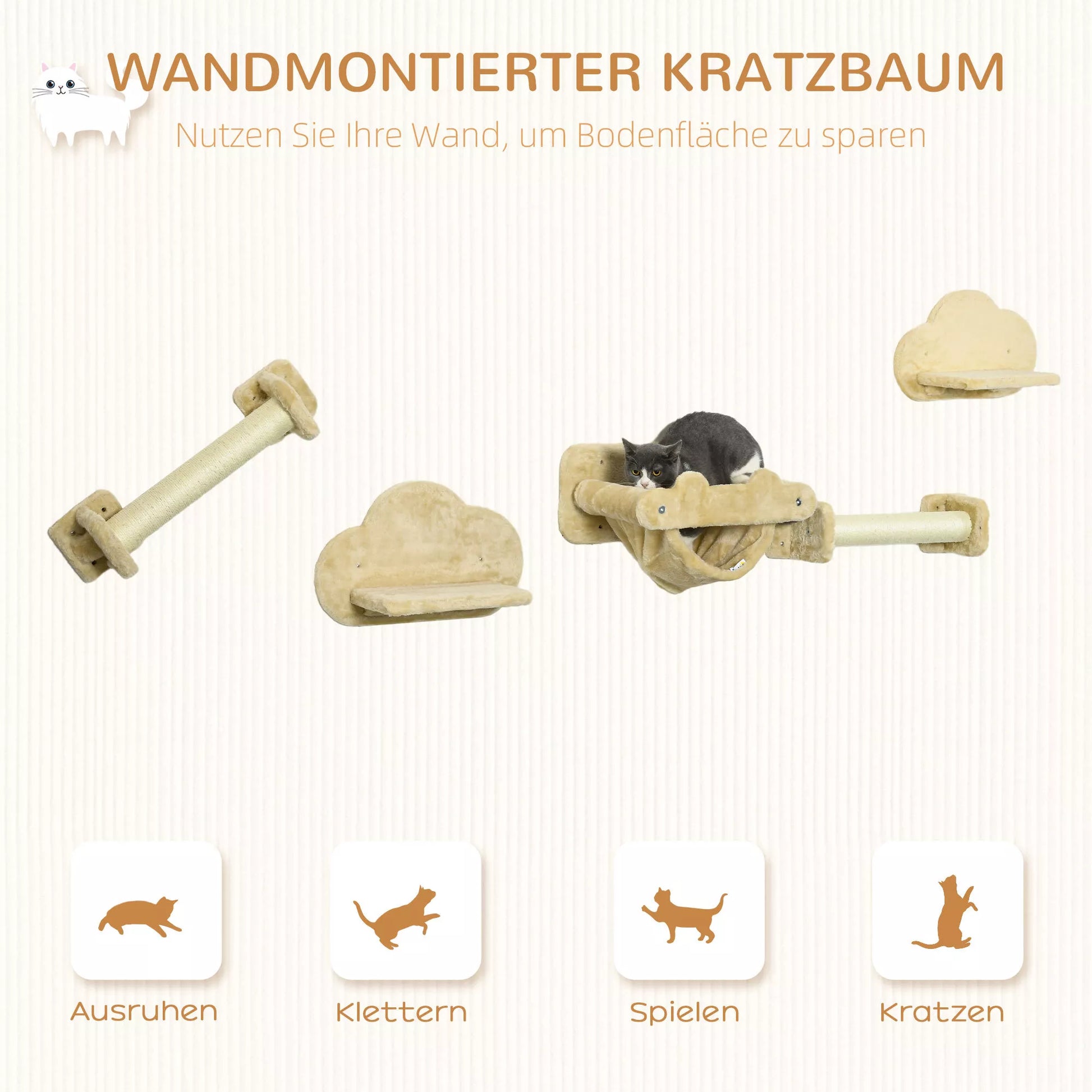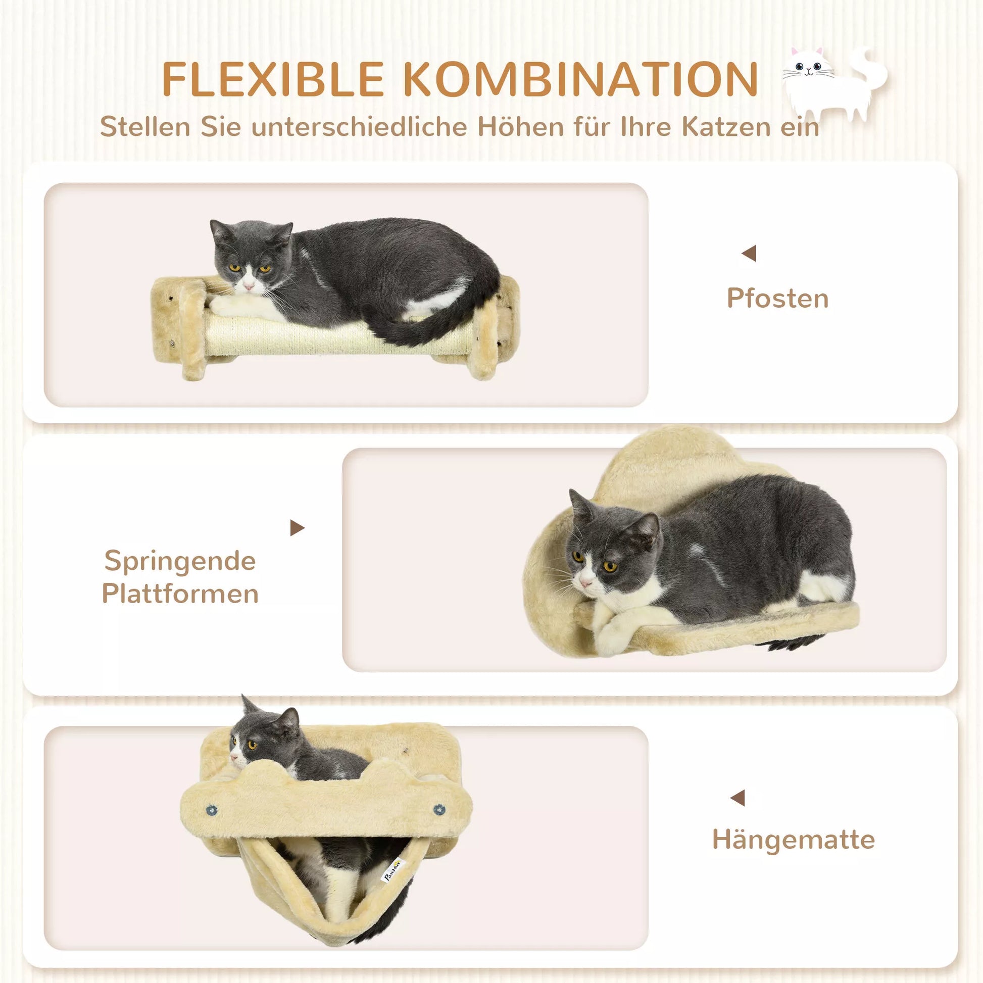 - ✔ Tvirtinamas prie sienos, kad katės galėtų atsipalaiduoti ir žaisti aukštai