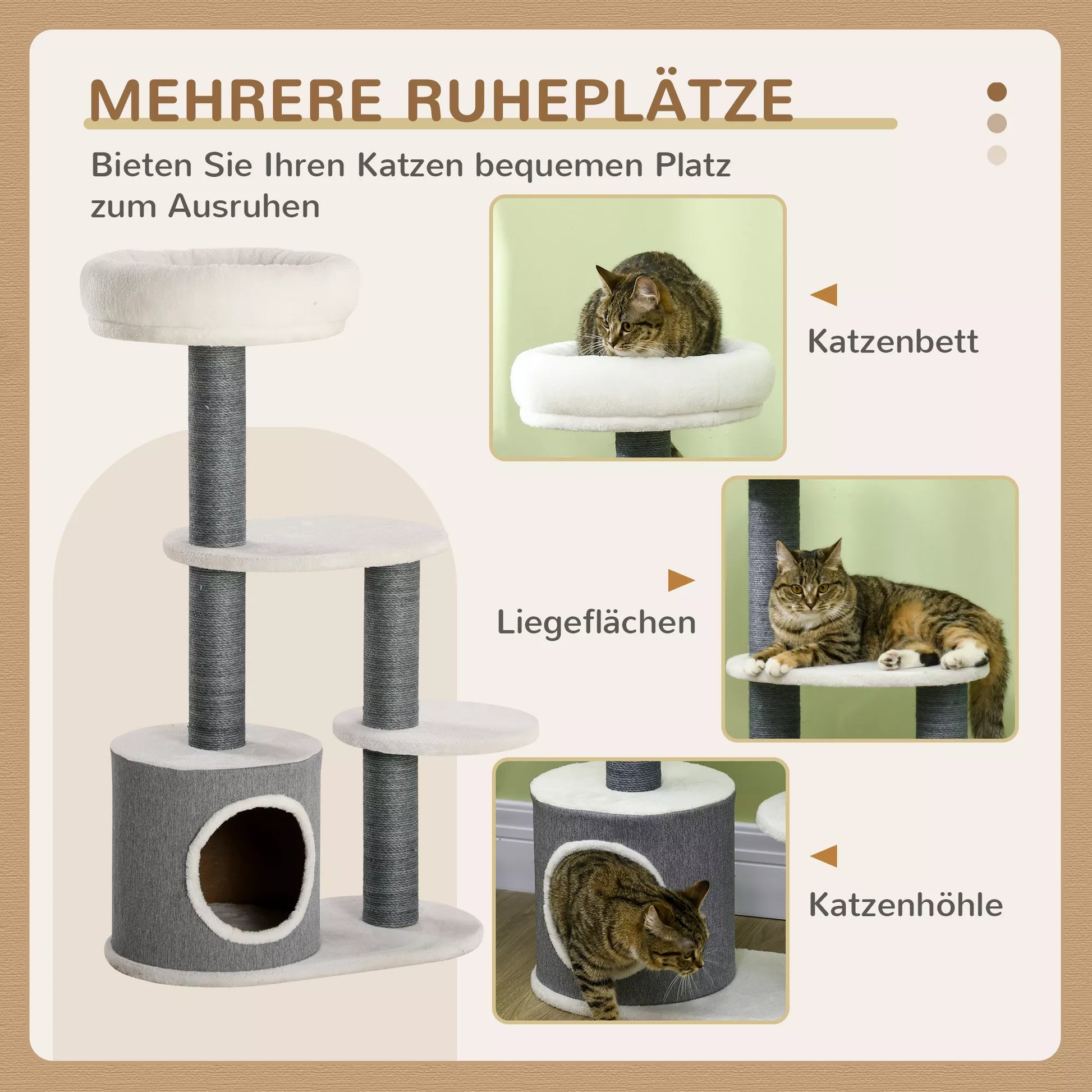PawHut kačių medis su 1 katės guoliu, 1 kačių lovyte, 2 platformomis, stulpeliais su jutės virve, balta + pilka PawHut