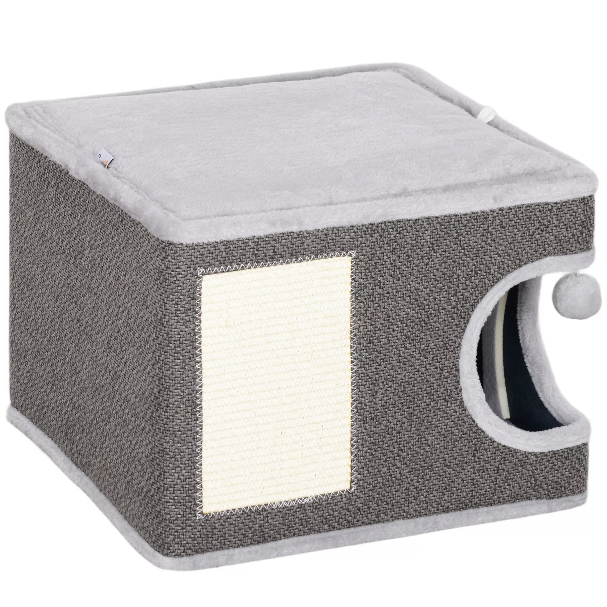 Katės namelis su 2 pagalvėlėmis, lova, guoliu, draskymo kilimėliu, žaisliniu kamuoliuku, mažu draskomuoju medžiu, pilkos spalvos