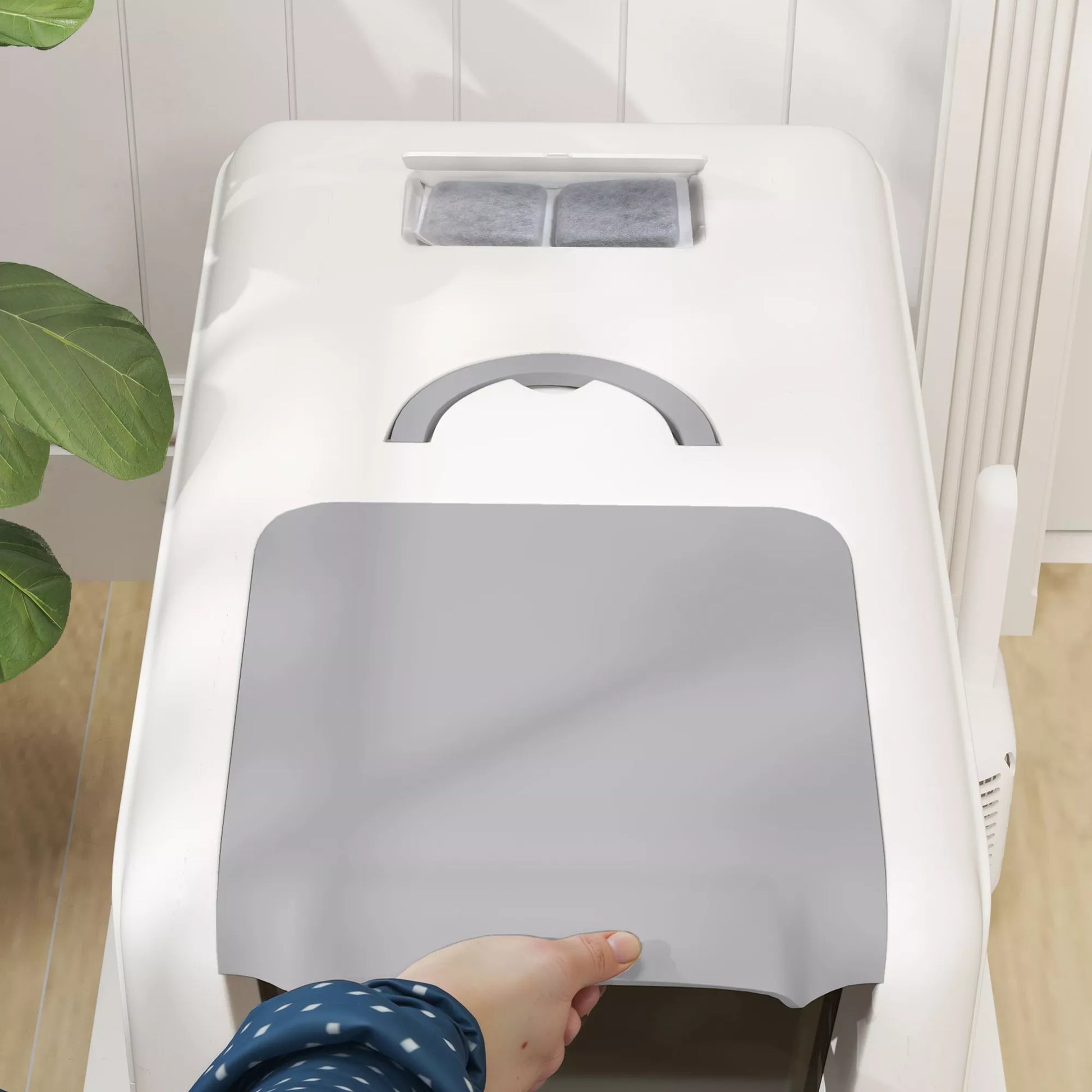 - ✔ Uždara kačių tualeto dėžės konstrukcija su dviem filtro maišeliais kvapų kontrolei