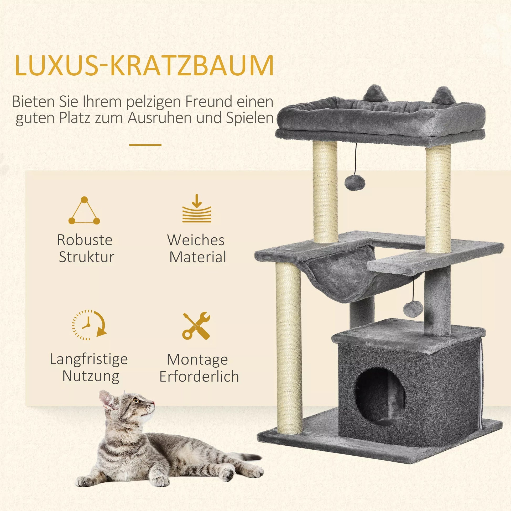 Kačių medis 90 cm, su hamaku, žaidimų medis, kačių guolis, platformos, laipiojimo medis, katės draskyklė, aktyvumo draskyklė, pliušas, sizalis, pilkos spalvos