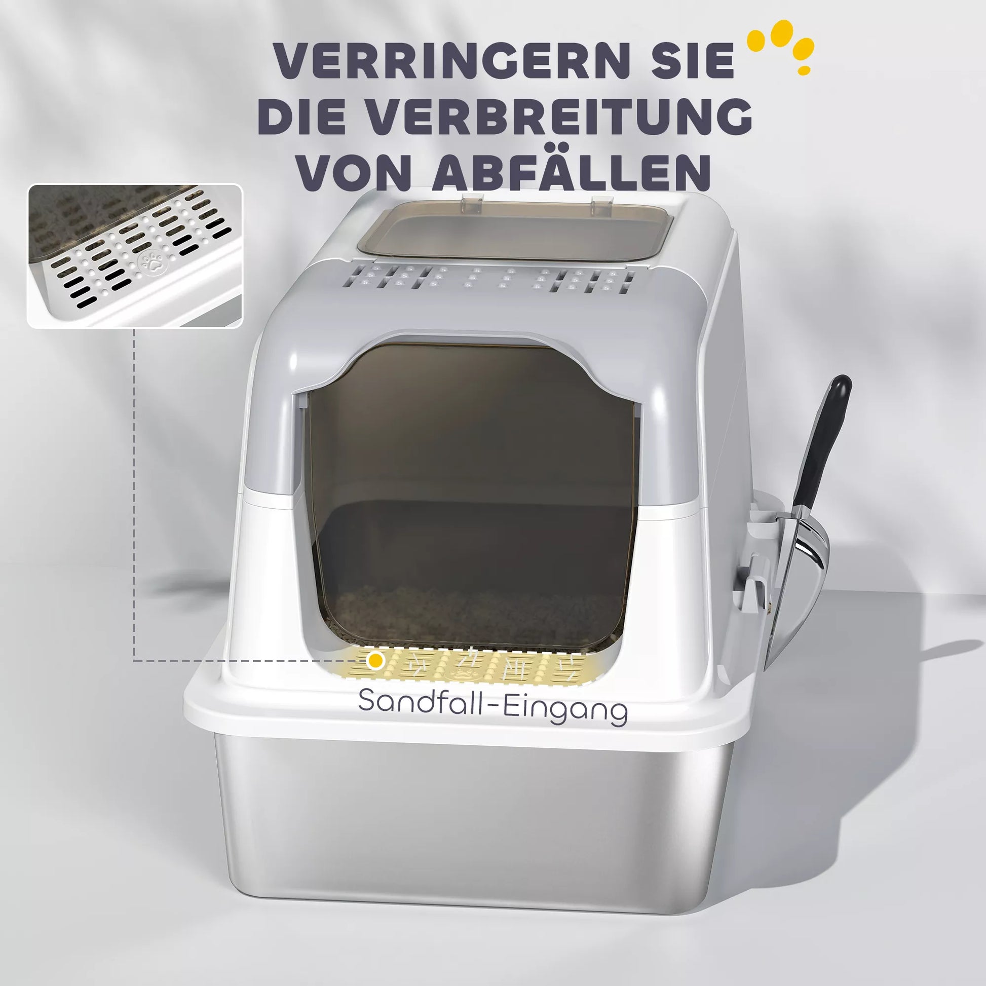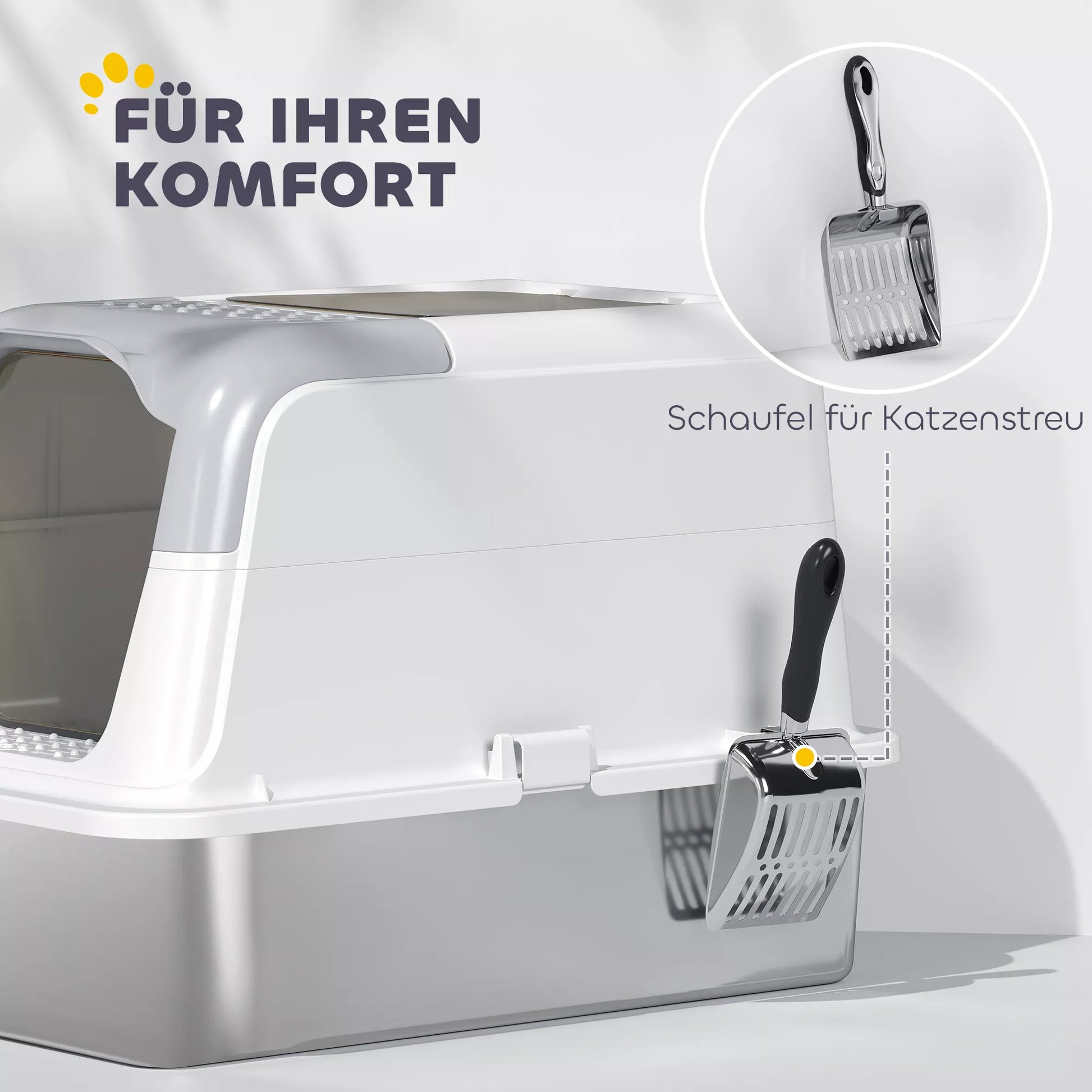Katės tualetas, katės tualetas su dangčiu, šaukštas, įėjimas priekyje ir išėjimas viršuje, nerūdijantis plienas, iki 7 kg
