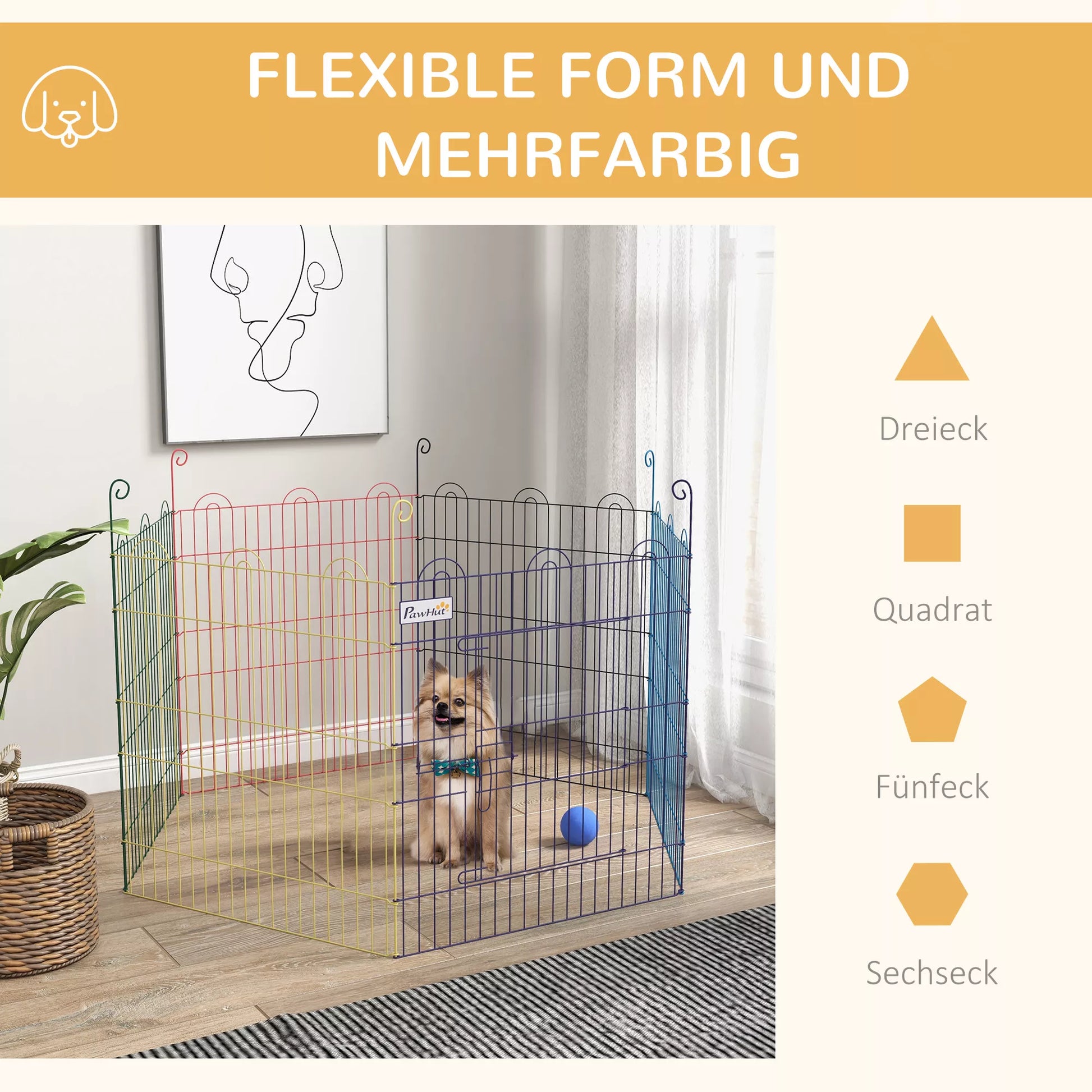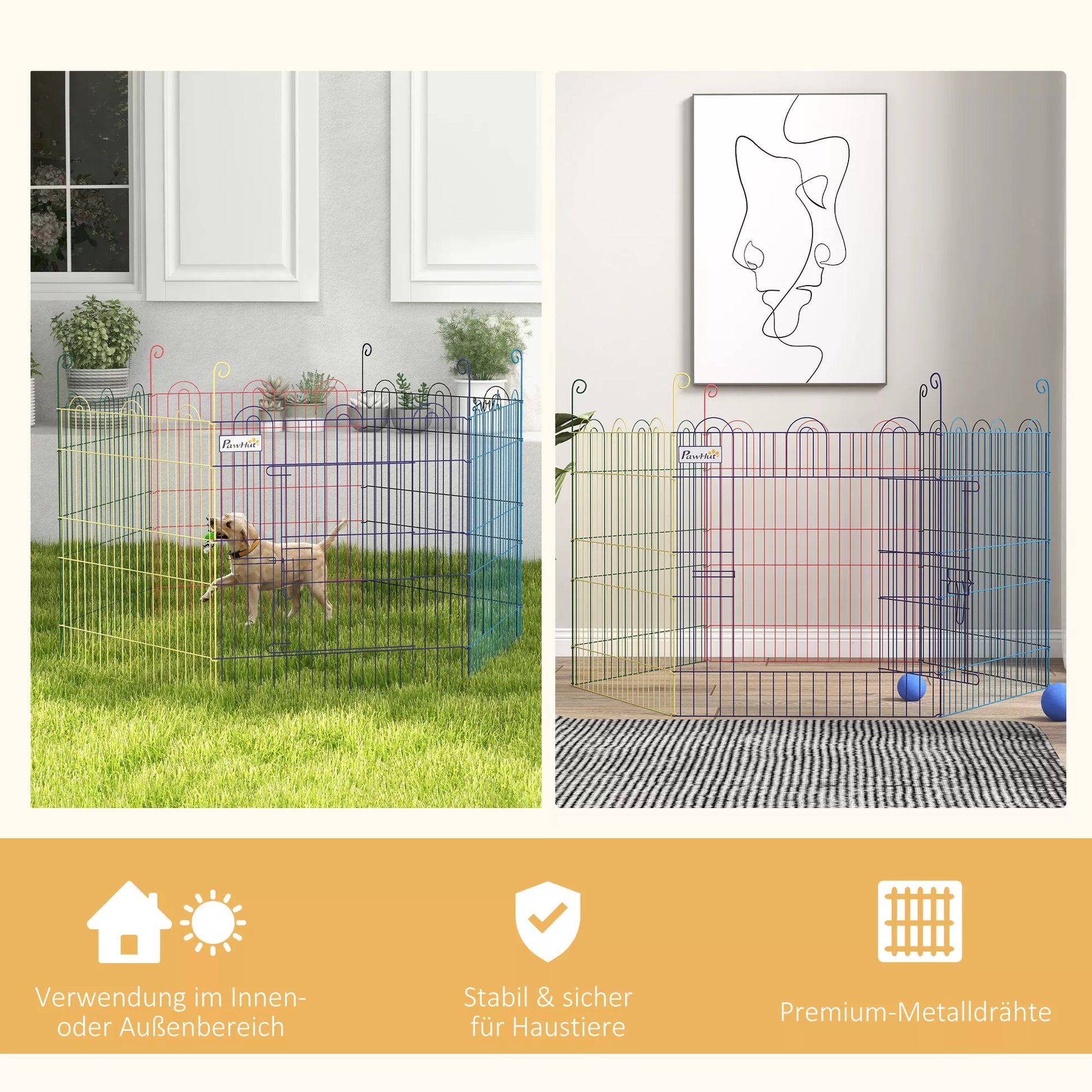 Atraskite universalią laisvalaikio aptvarą – puikųjį rojų jūsų augintiniams, tiek viduje, tiek lauke. Šis tvirtas šuniukų voljeras susideda iš šešių tinklelinių panelių, kurias galima lanksčiai statyti įvairiomis formomis – ar tai būtų trikampis, stačiakampis ar kvadratas. Su tvirtais kuoliukais jis saugiai įtvirtinamas žemėje, o įėjimo durų užraktas suteikia papildomą apsaugą nuo nepageidaujamų gyvūnų svečių.