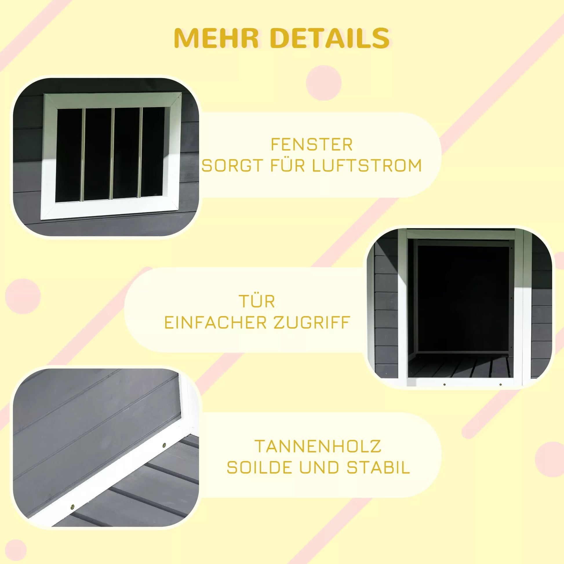 - ✔ Priekinis langas ir atvira durų anga gyvūnų namelyje užtikrina geresnę oro cirkuliaciją
