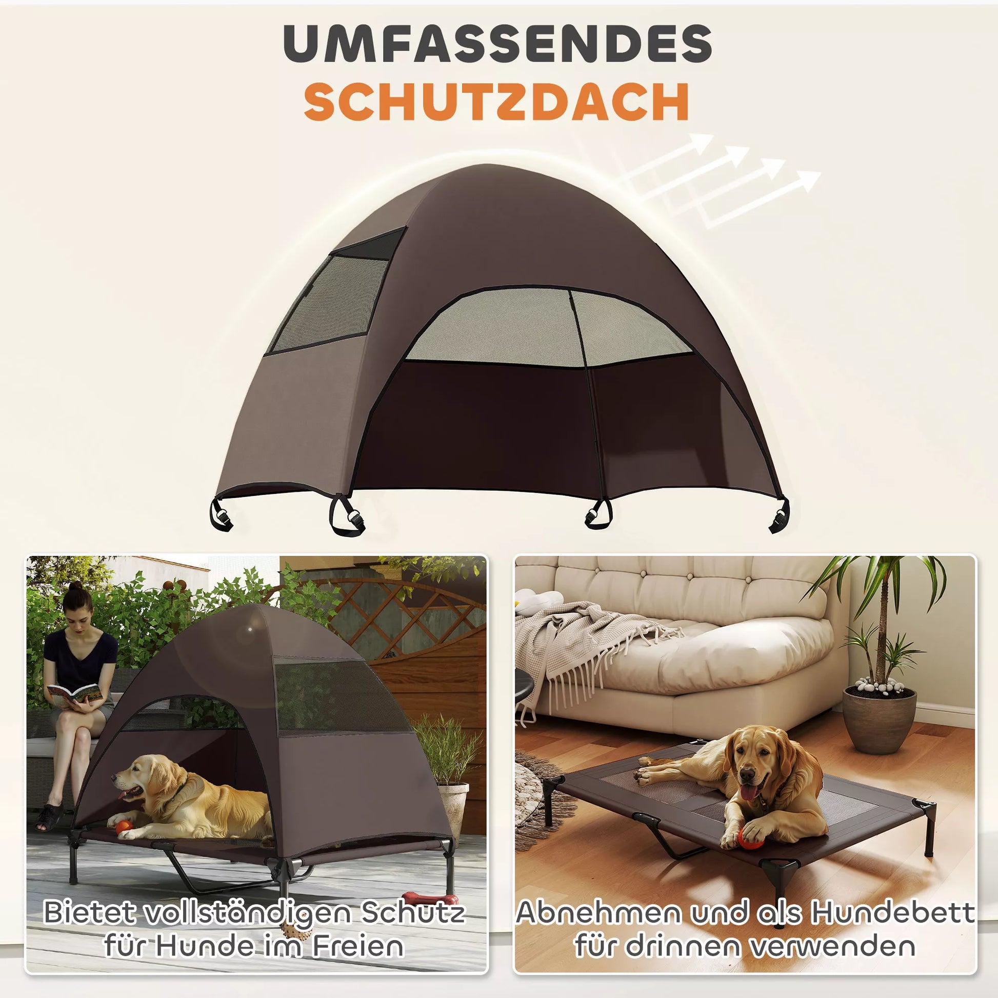 - ✔ Trys pusės dengiantis šunų lovelės stogelis su apsauga nuo saulės padidina šuns komfortą