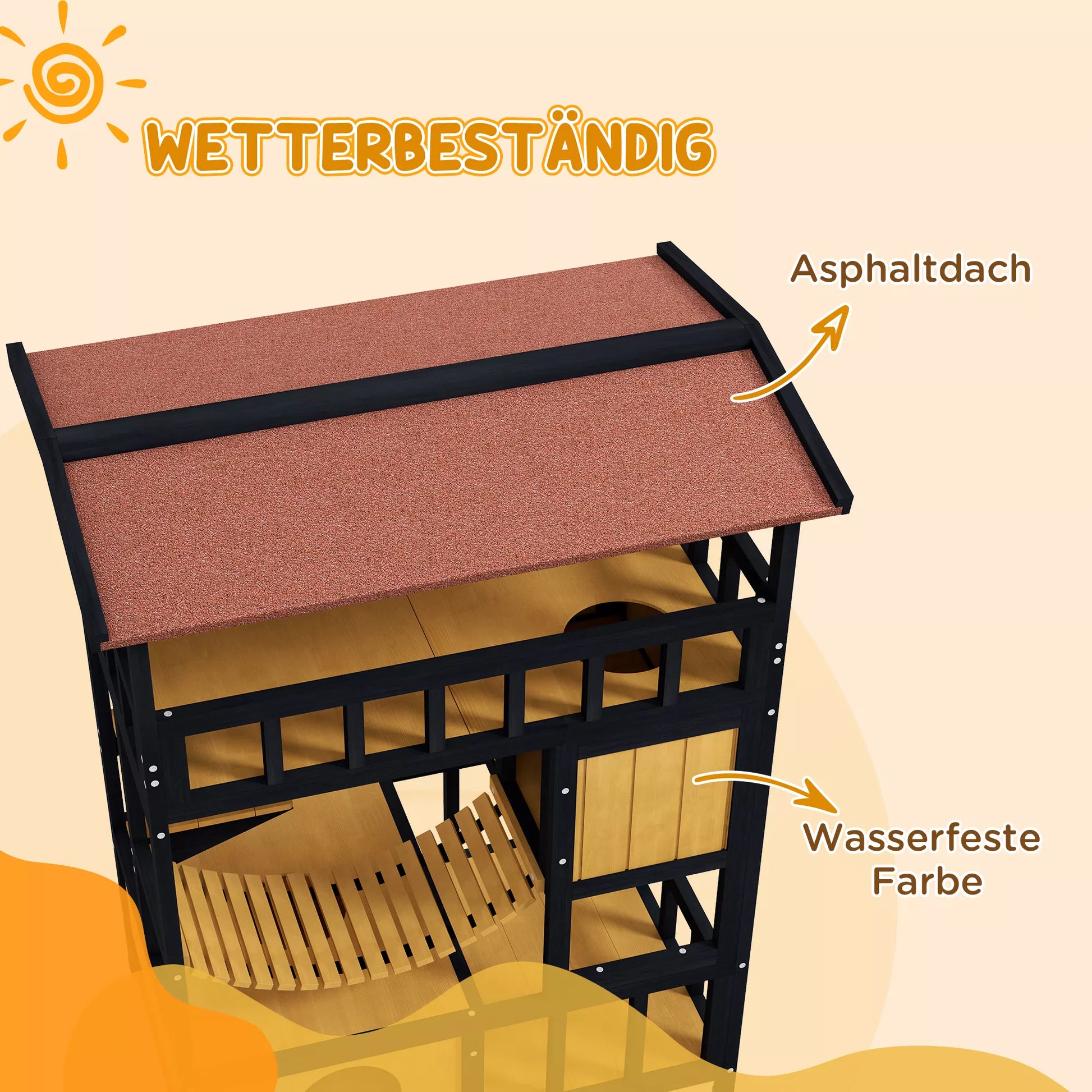 Šis lauko kačių namelis turi keturis lygius, svyruojančio pakabinamo tilto, balkonų apžvalgos vietų ir jaukių slėptuvių. Jis skatina jūsų katę lipti, šokinėti ir kviečia jaukiai ilsėtis. Kelios įėjimo angos ir tvirta eglės medienos konstrukcija garantuoja lengvą tyrinėjimą ir saugumą.