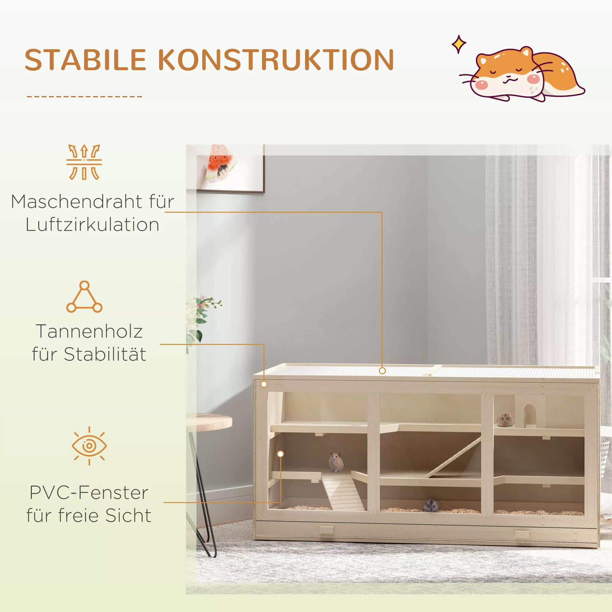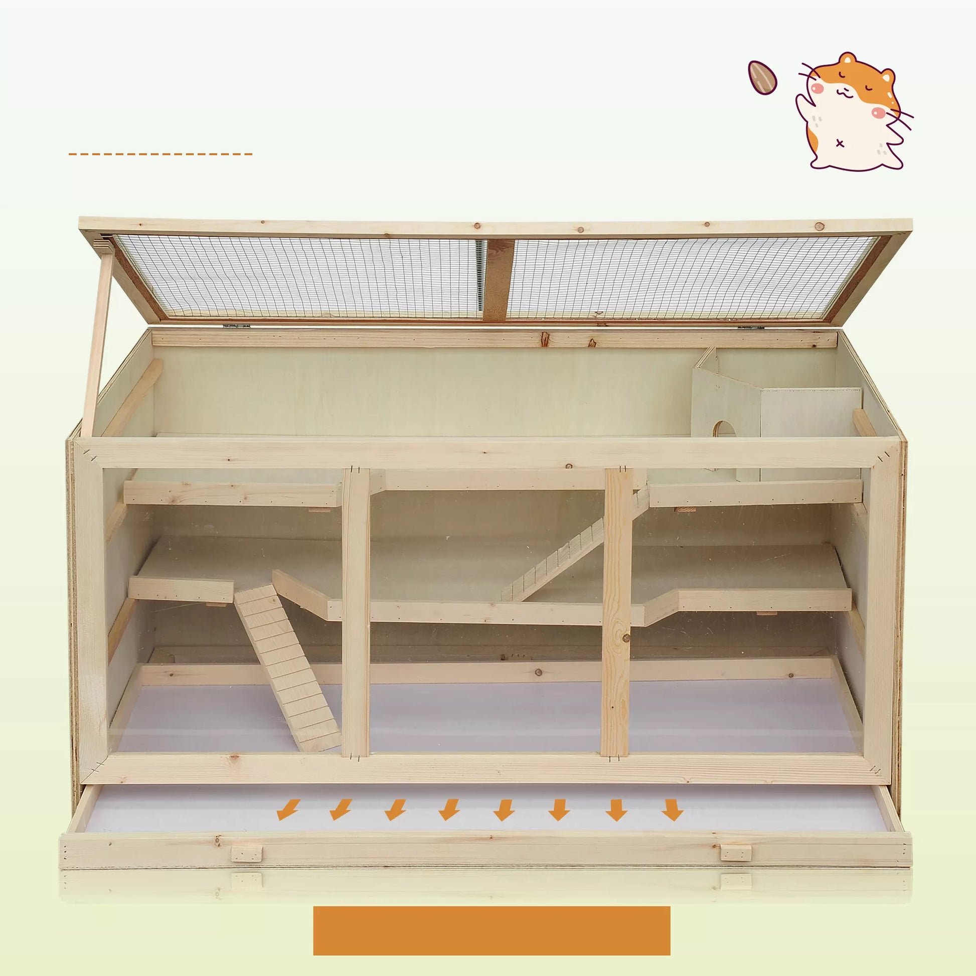Šis [Brand Name] mažų gyvūnėlių narvas idealiai tinka žiurkėnams, jūrų kiaulytėms ir kitiems smulkiems gyvūnėliams. Tai tobula gyvenamoji ir judėjimo erdvė, kurioje jie jausis patogiai ir laimingai. Pagamintas iš medžio konstrukcijos su PVC langais ir viršutinėmis durimis. Viršutinė dalis turi vielos tinklelį, kuris taip pat gali būti visiškai atidarytas arba reguliuojamas nuo 30 iki 60 laipsnių kampu, užtikrinant pakankamai šviežio oro. Šis narvas suteikia jiems saugią ir sausą vietą gyventi ir žaisti.
