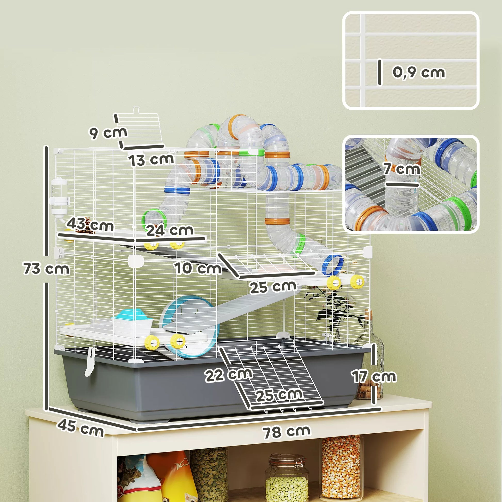 - ✔ 0,9 cm grotelių tarpas apsaugo nuo pabėgimo