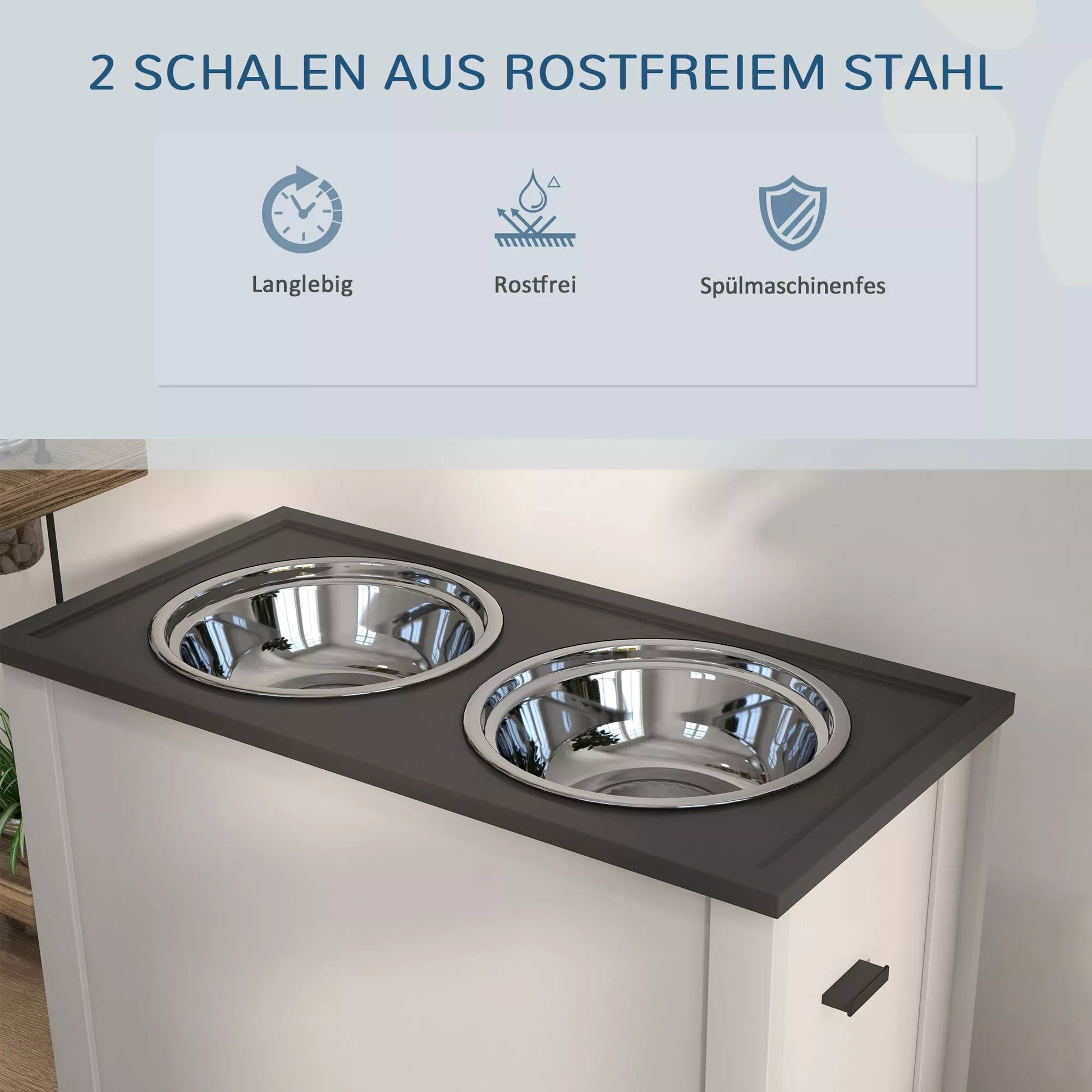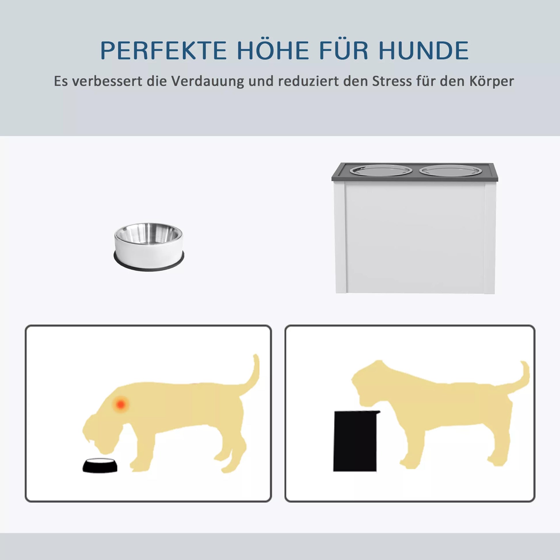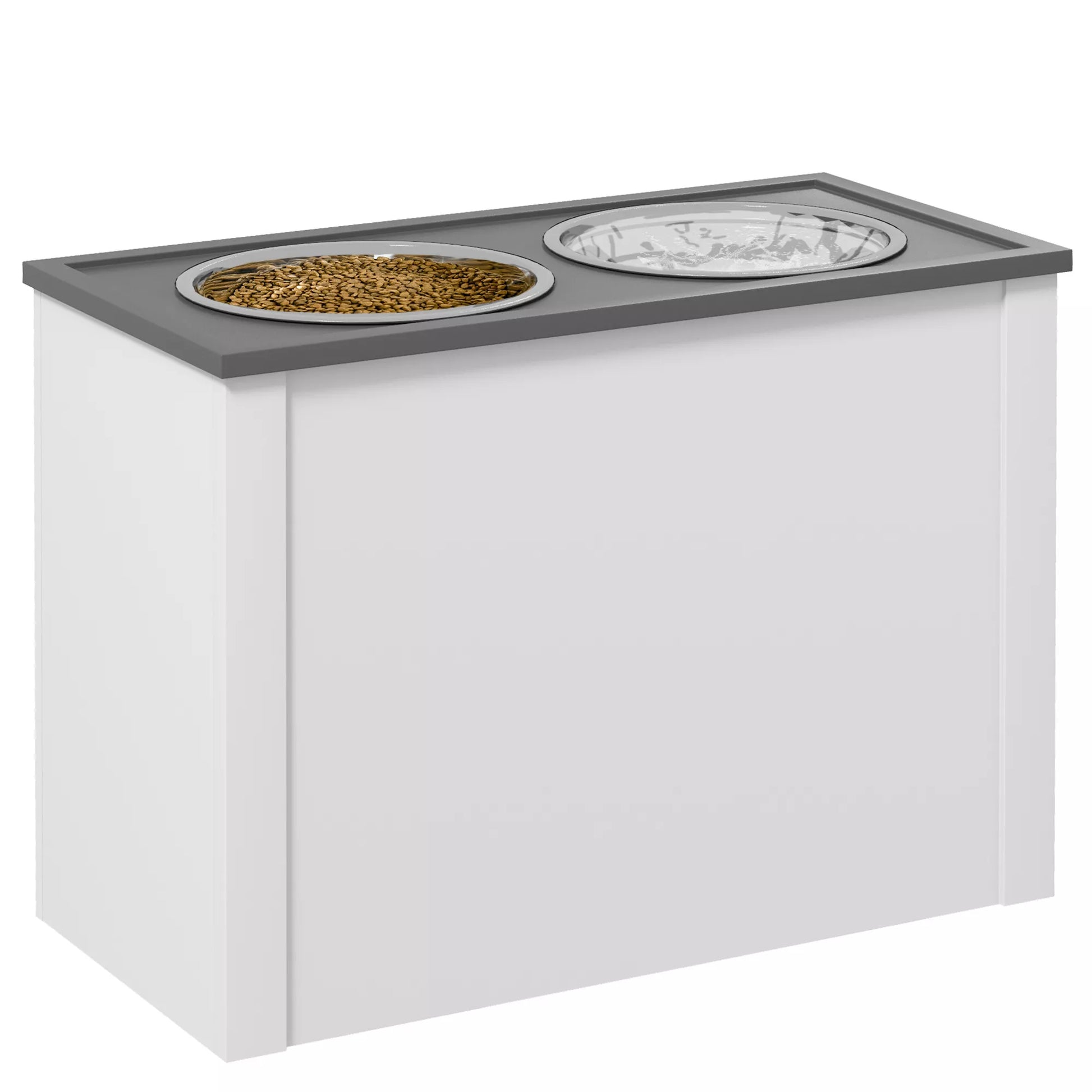 Maitinimo stotelė su paaukštintais maisto indais, 1 laikymo vieta, 2 nerūdijančio plieno dubenėliai, 60 x 30 x 42cm, balta + pilka