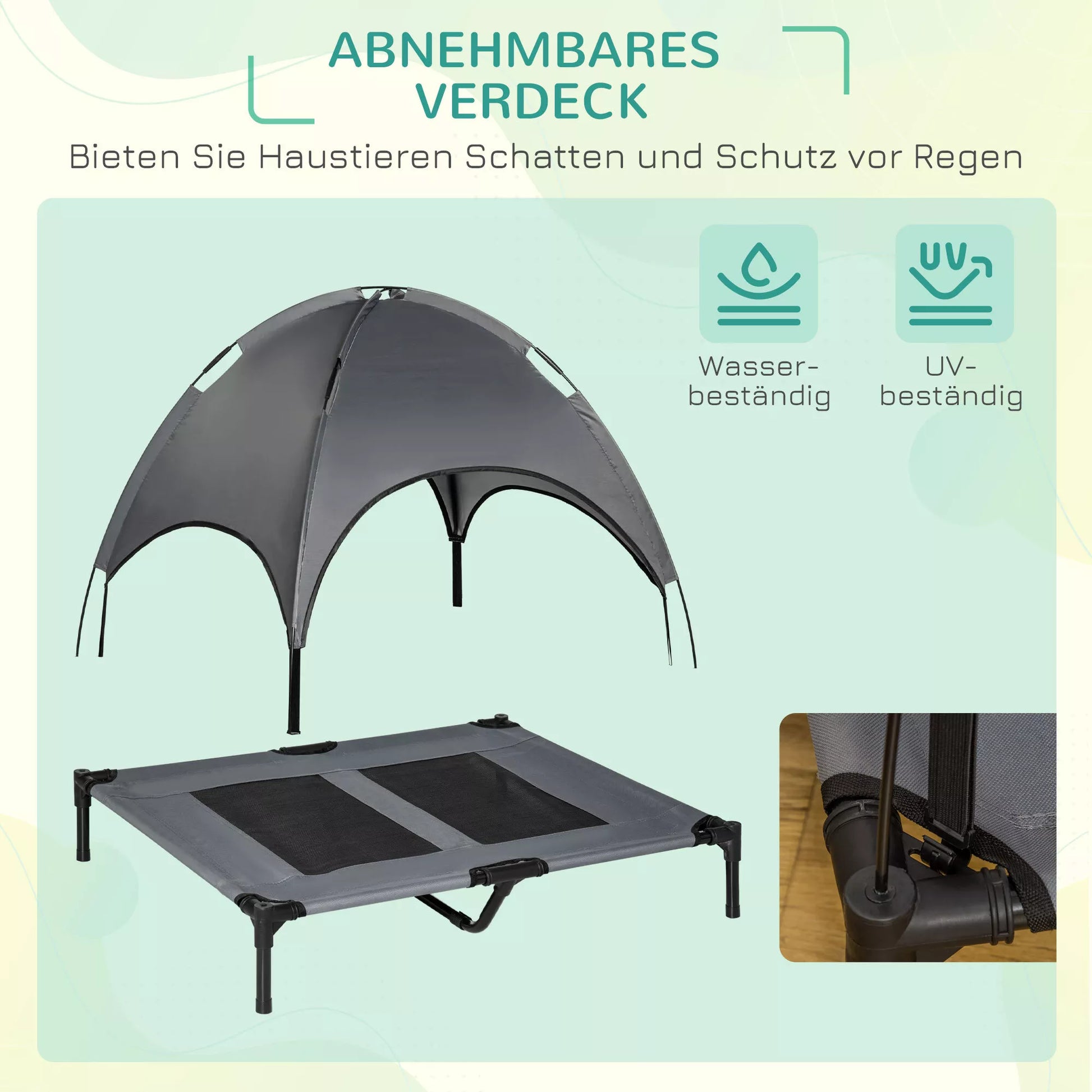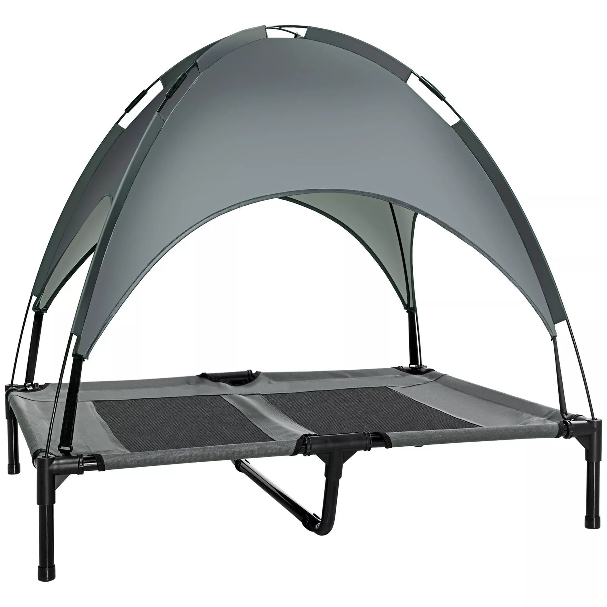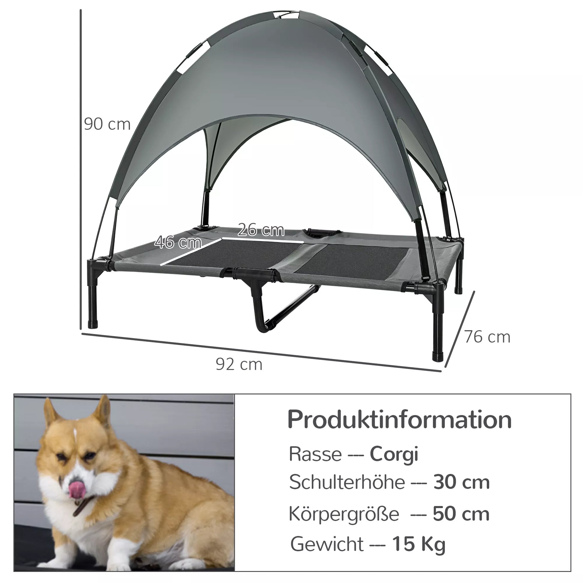 Paaukštinta šunų lova su baldakimu, naminių gyvūnėlių lova, lauko šunų gultas su stogeliu, kvėpuojantis, taftos audinys, skirta stovyklavimui, pilka 92 x 76 x 90 cm