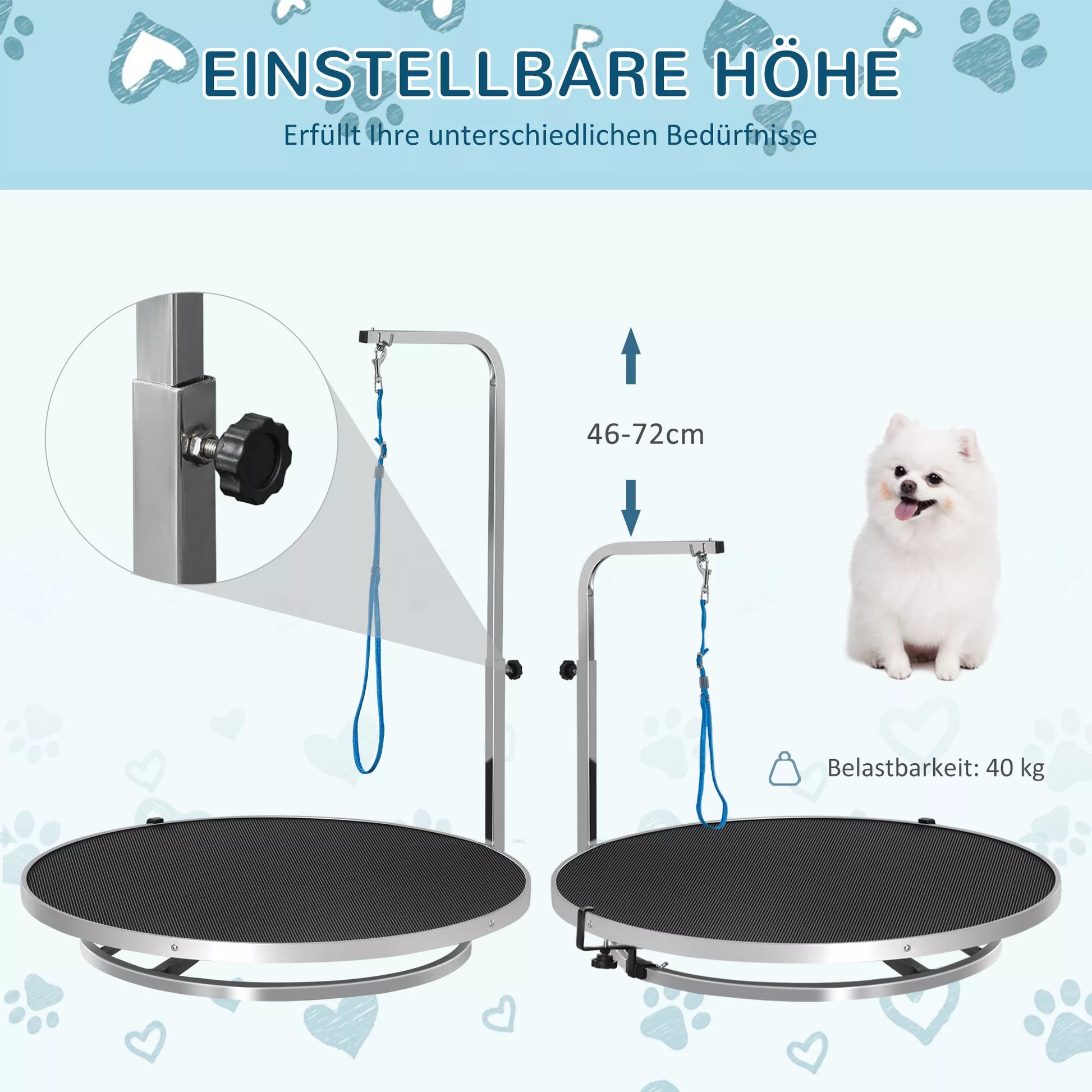 Su šiuo praktišku kirpimo stalu jūsų šuns kirpimas taps lengvas. Pasukamas stalviršis palengvina šuns kirpimą, o integruota saugos virvė užtikrina didelį saugumą. Stalo paviršius yra neslidus, todėl jūsų šunys negali paslysti. Šis kirpimo stalas palengvina darbą privačioms ir profesionalioms šunų kirpykloms.