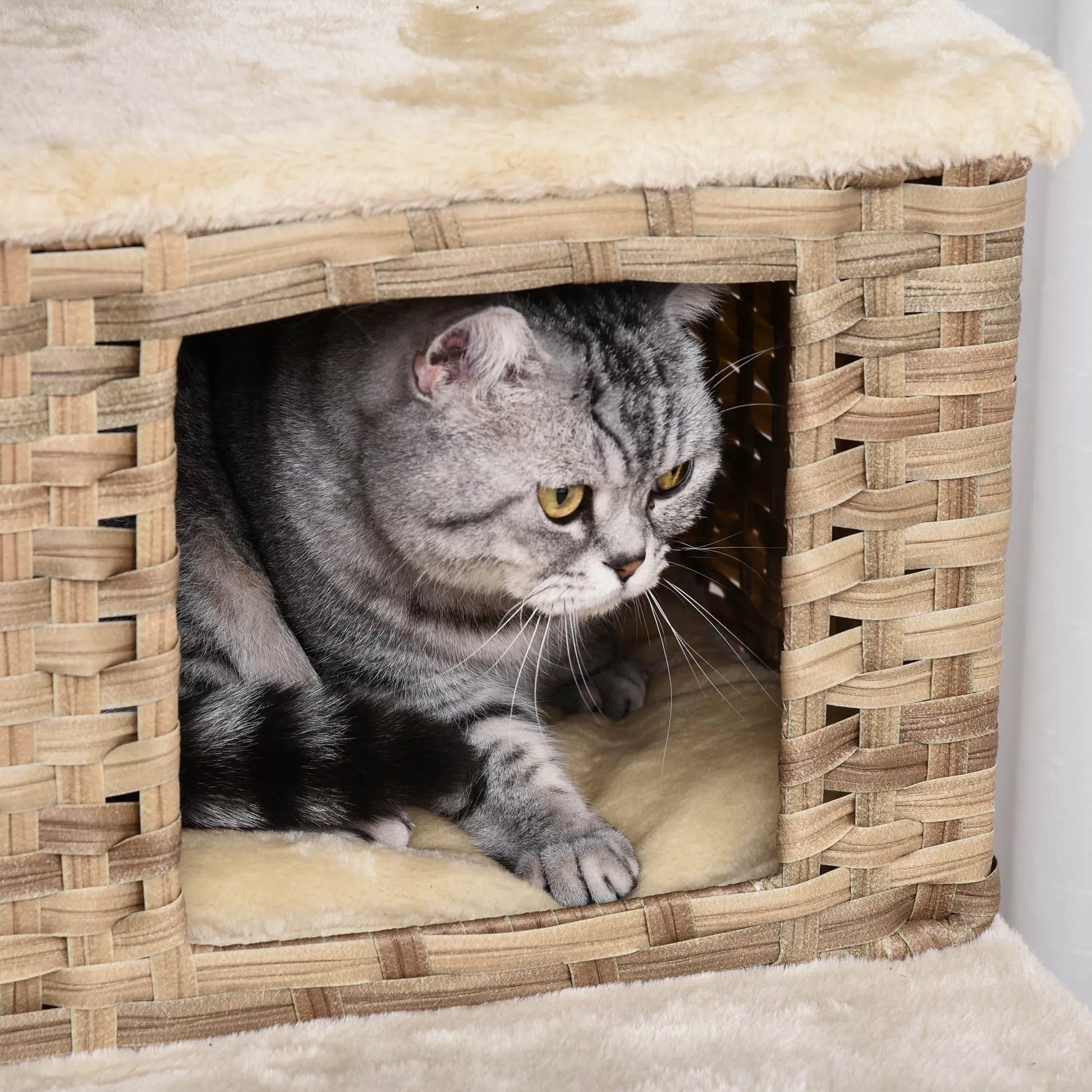 Rataninis katės medis su urveliu, daugiaaukštis katės namelis, laipiojimo medis katėms, E1 MDF, sizalis, smėlio spalvos+ruda, 55 x 55 x 174 cm