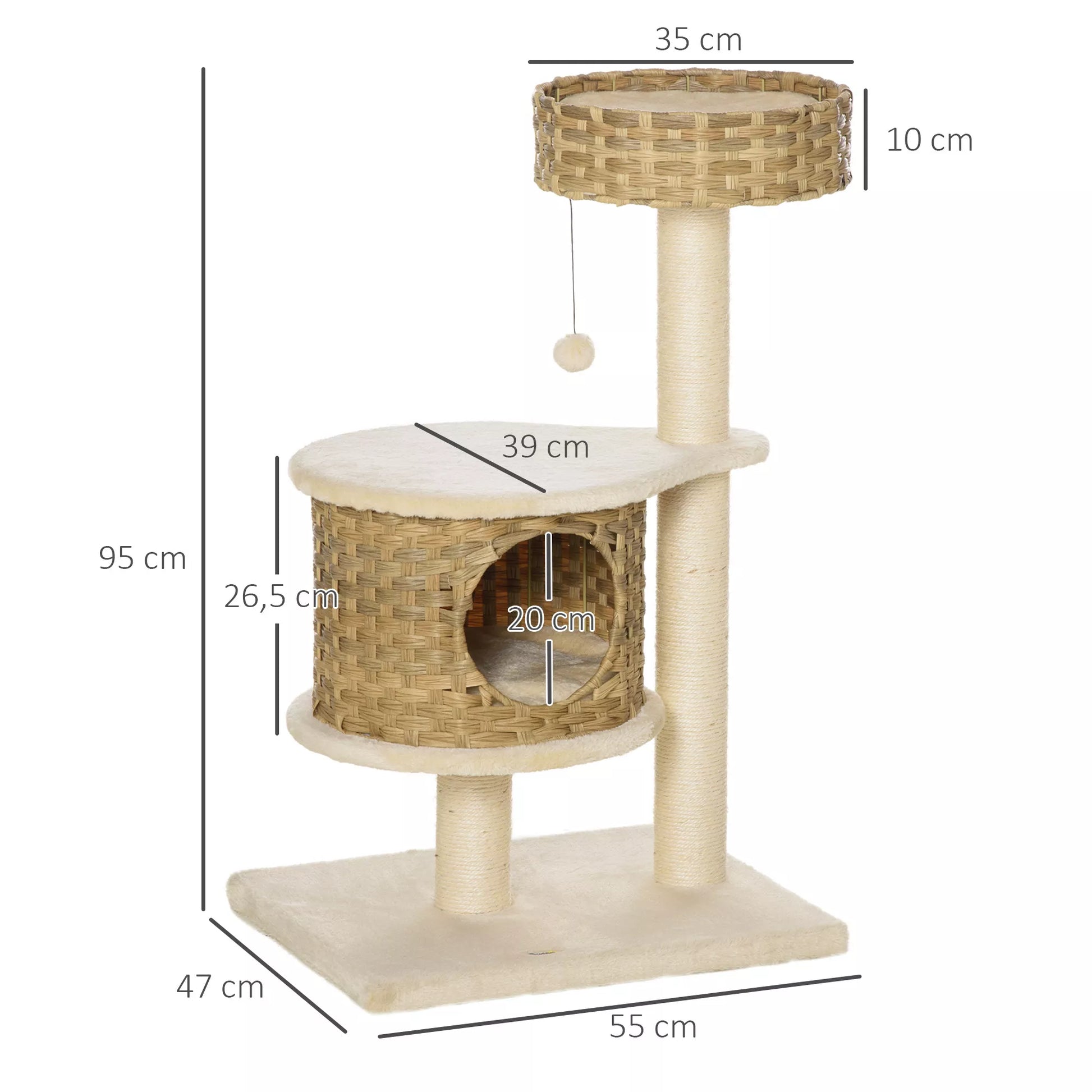 Rotango kačių draskyklė 95 cm aukščio, 3 pakopų kačių medis su platforma, kačių lova, laipiojimo medis su katei skirta slėptuve, sizalio stulpais, žaisliukais, kačių baldai, Sizalis Natūralus+Smėlio spalvos