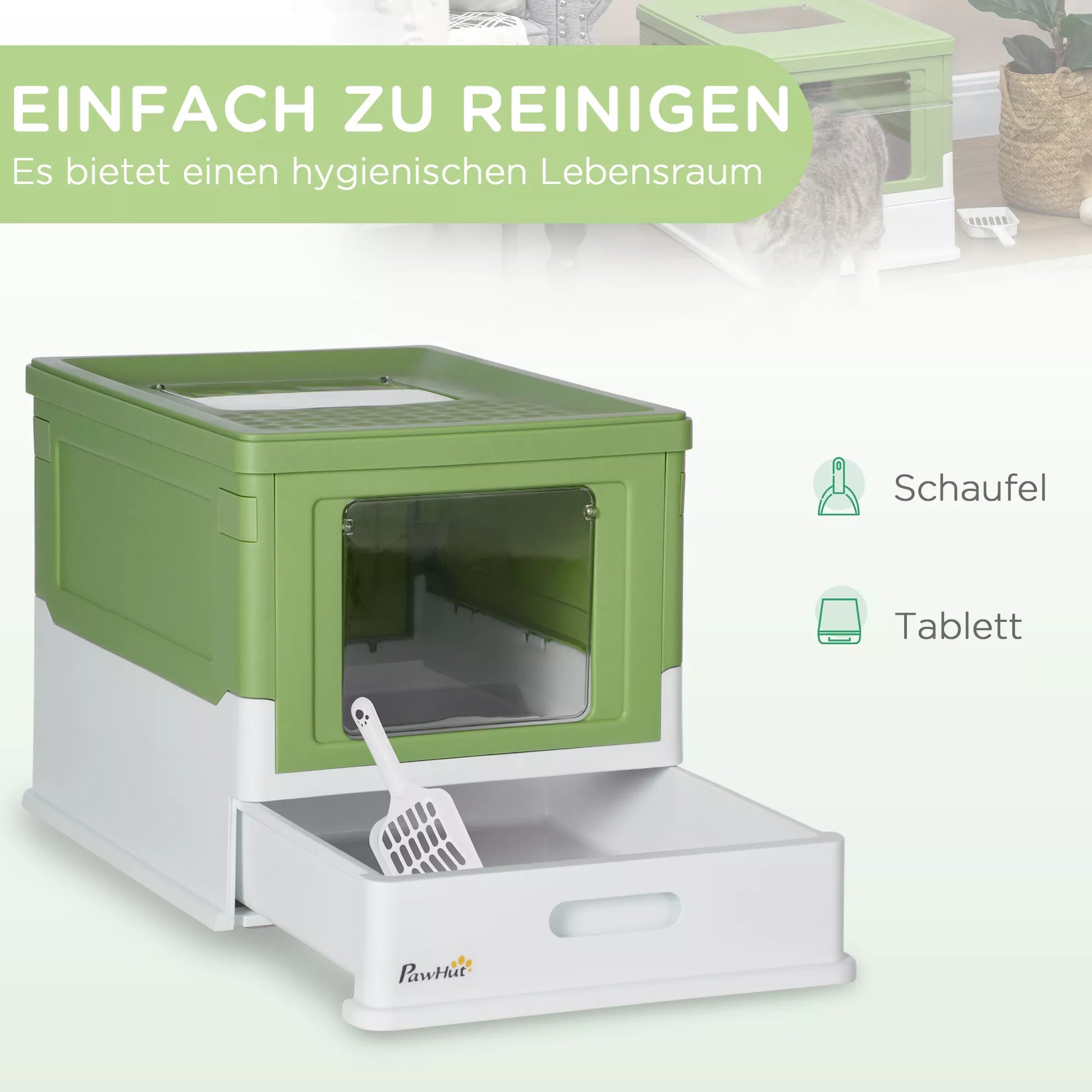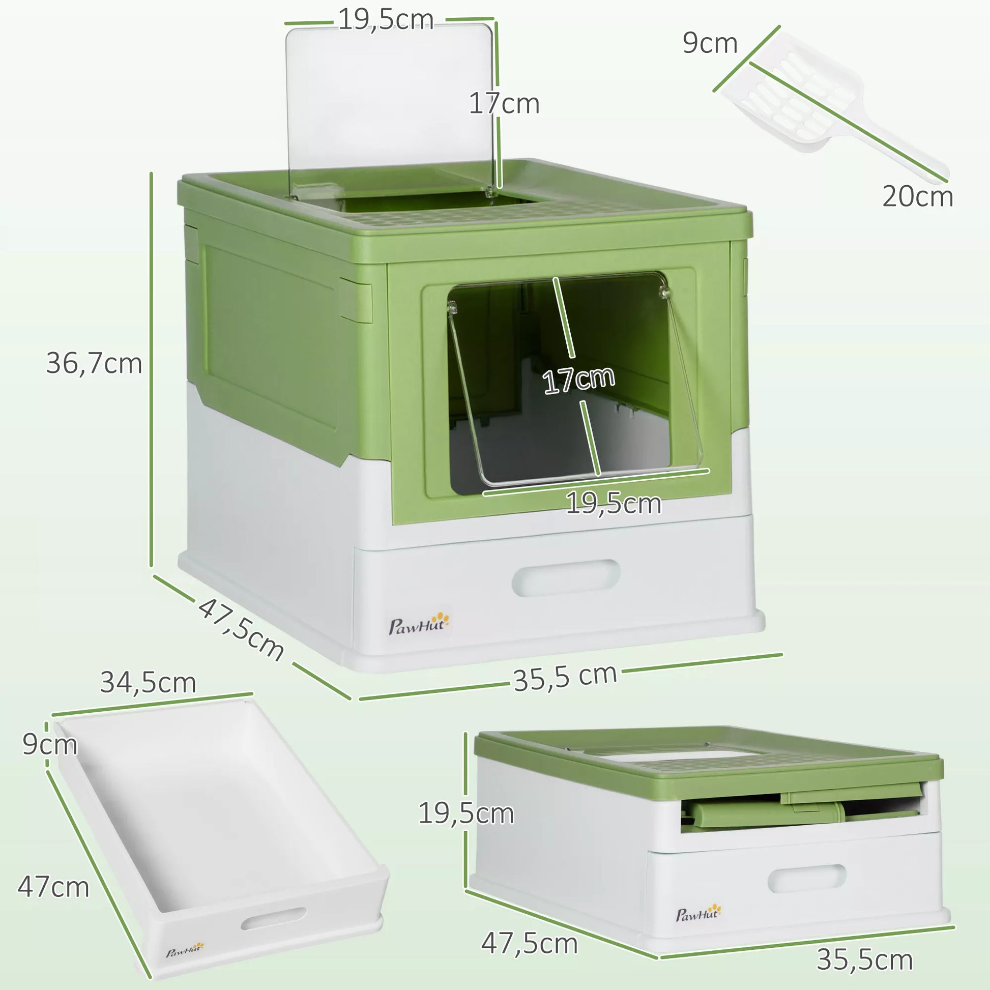 Katės tualetas, sulankstomas, 2 durelės, šepetys, 47,5x35,5x36,7 cm, baltas/žalias
