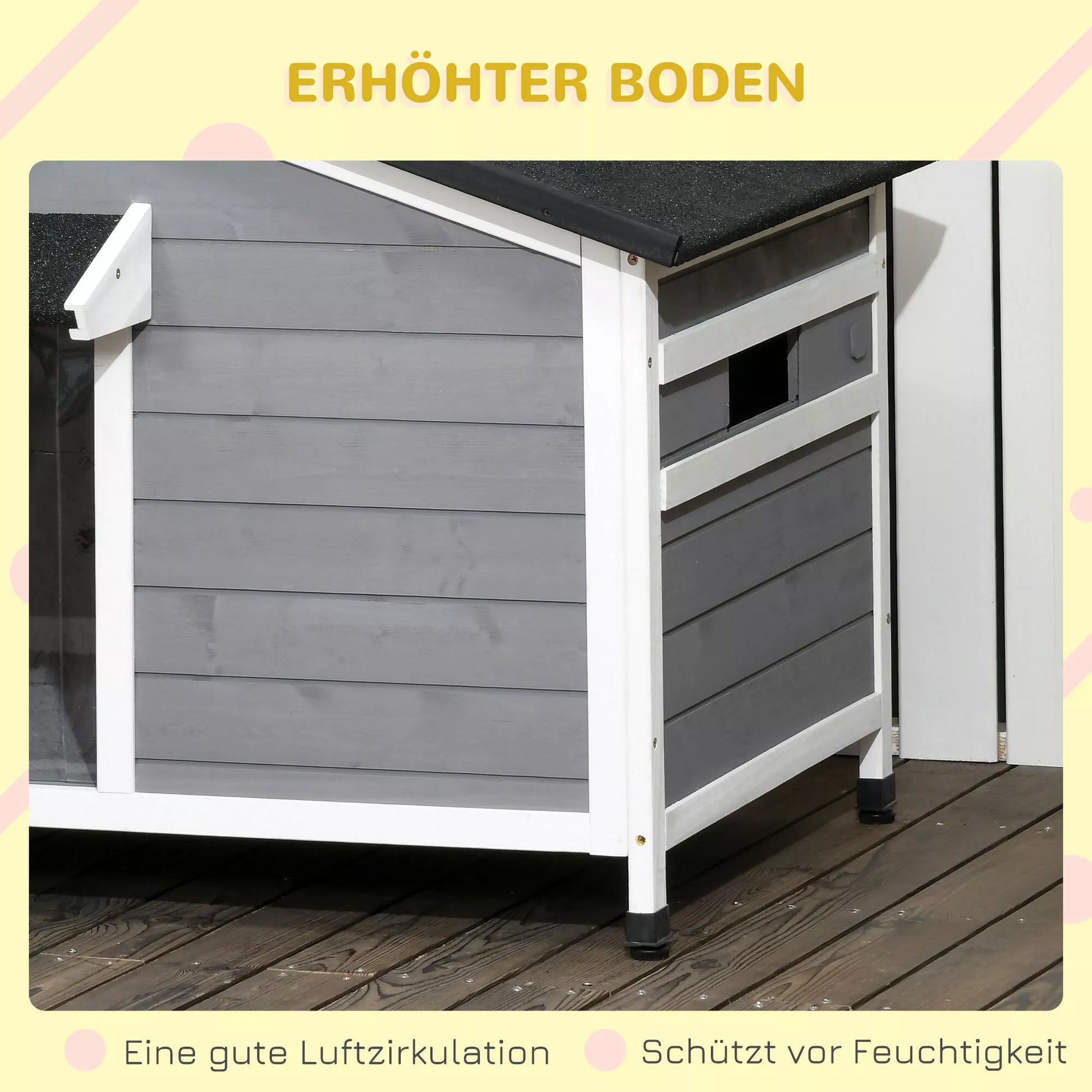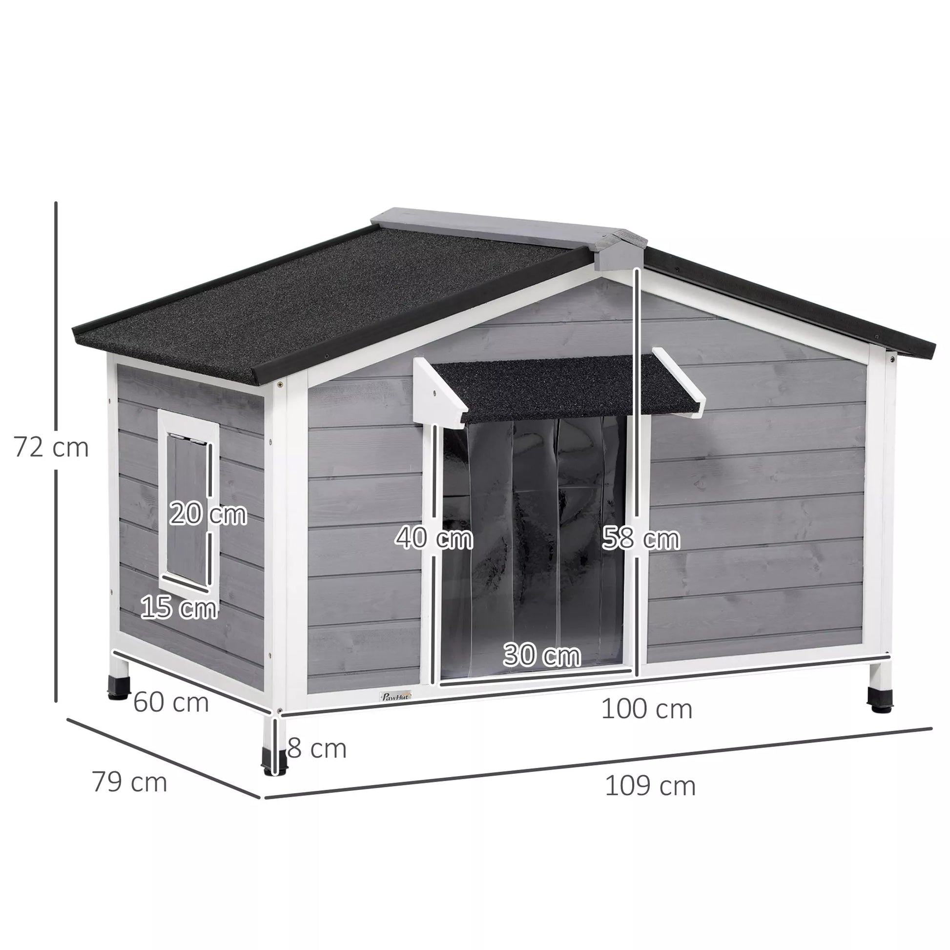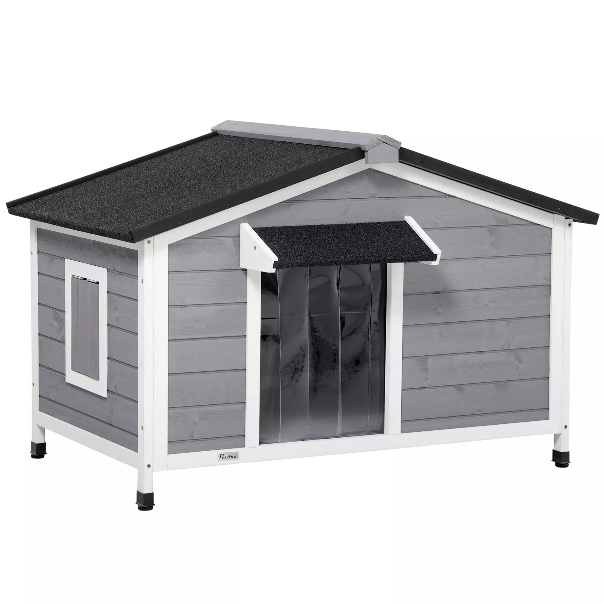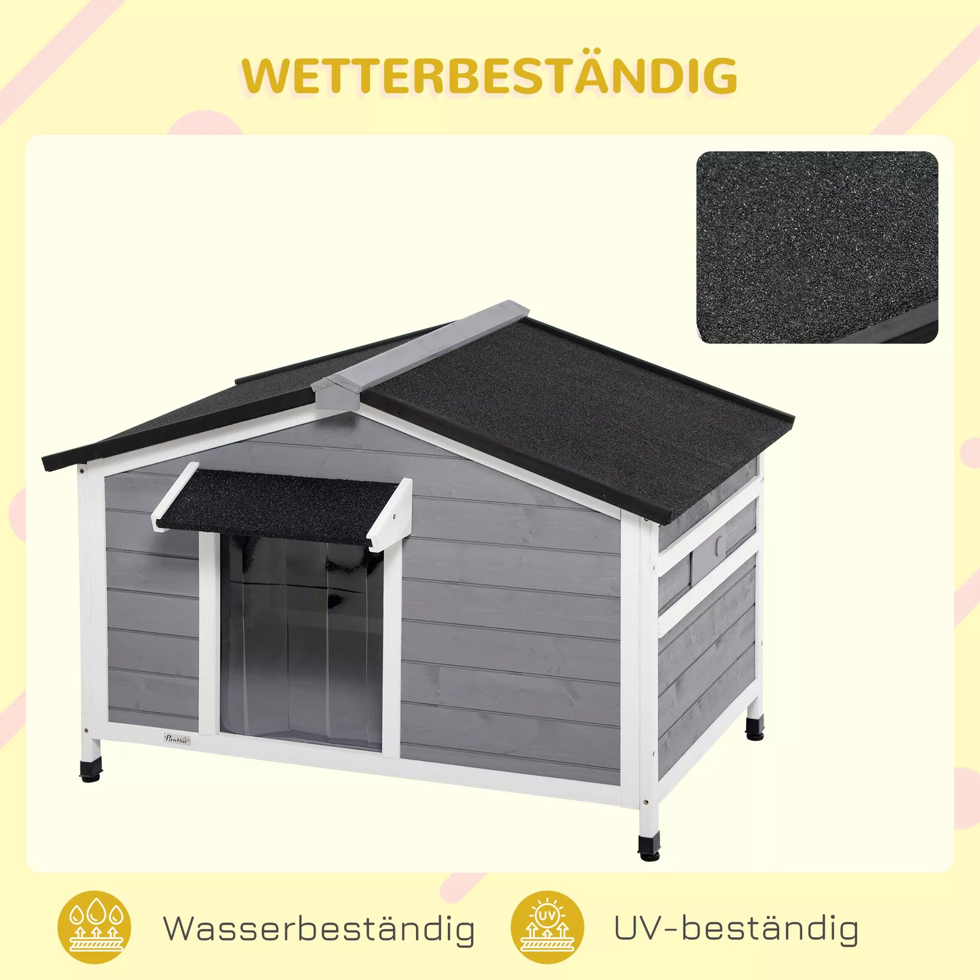 Šunų būda iš masyvmedžio, atspari oro sąlygoms, su asfaltiniu stogu, nuimamu pagrindu, 109 cm x 79 cm x 72 cm, pilka + balta