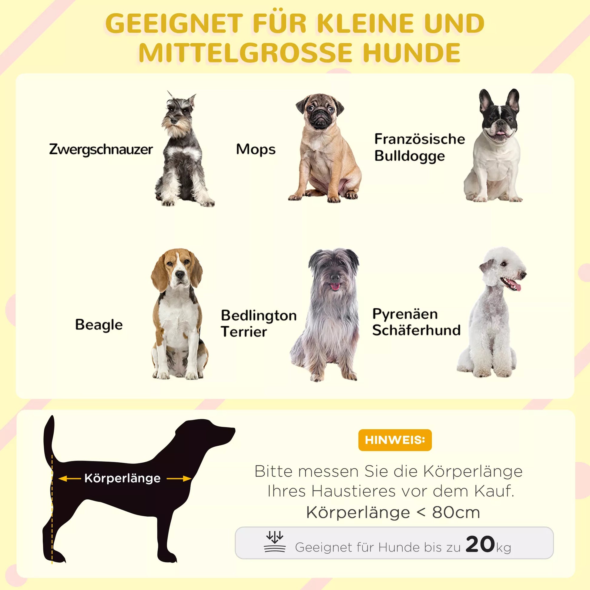 - ✔ Tinka mažiesiems šunims iki 20 kg ir 80 cm ūgio, tokiems kaip prancūzų buldogai ir taksai