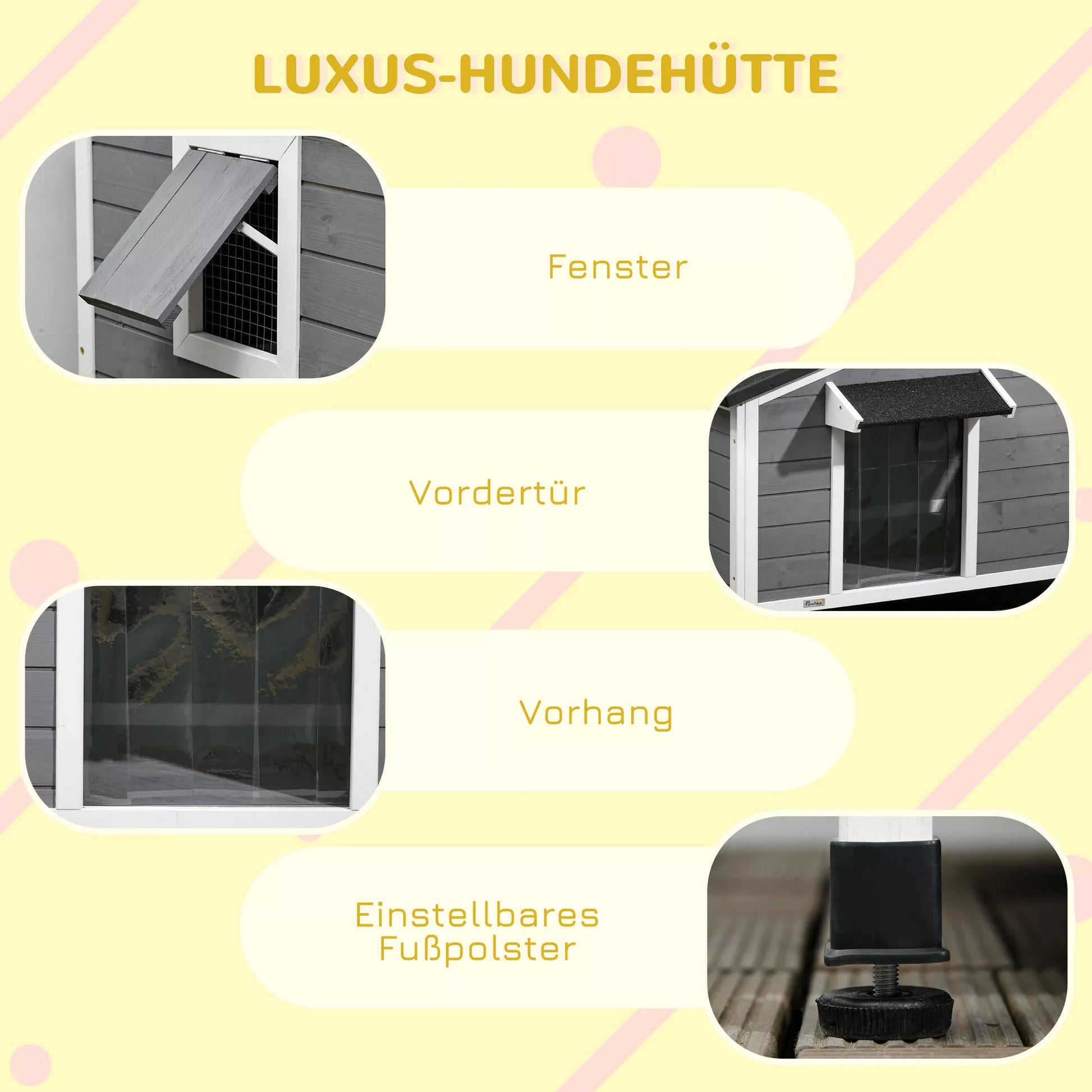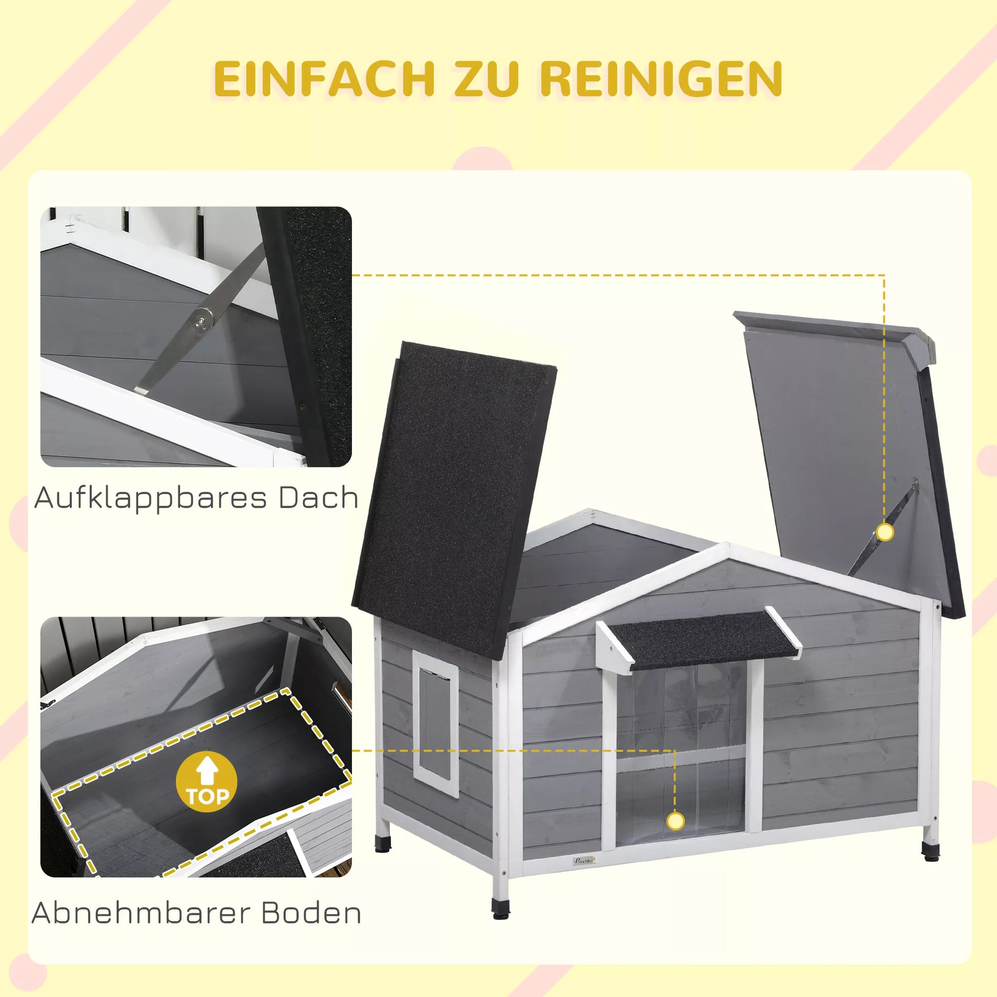 Jūsų šuo tikrai pamils šį šunų namelį. Atidaromas stogas leidžia jums paglostyti savo šunį, duoti jam kaulą ir su juo žaisti. Namelyje yra svetainė, kurioje jūsų augintinis turės daug vietos ilsėtis. Lauko sąlygoms tinkamos masyvmedžio medžiagos ir atstumiantis vandenį audinys užtikrina kokybę, kuri atlaiko ir lietų. Namelio dizainas yra mielas, stilingas ir funkcionalus.