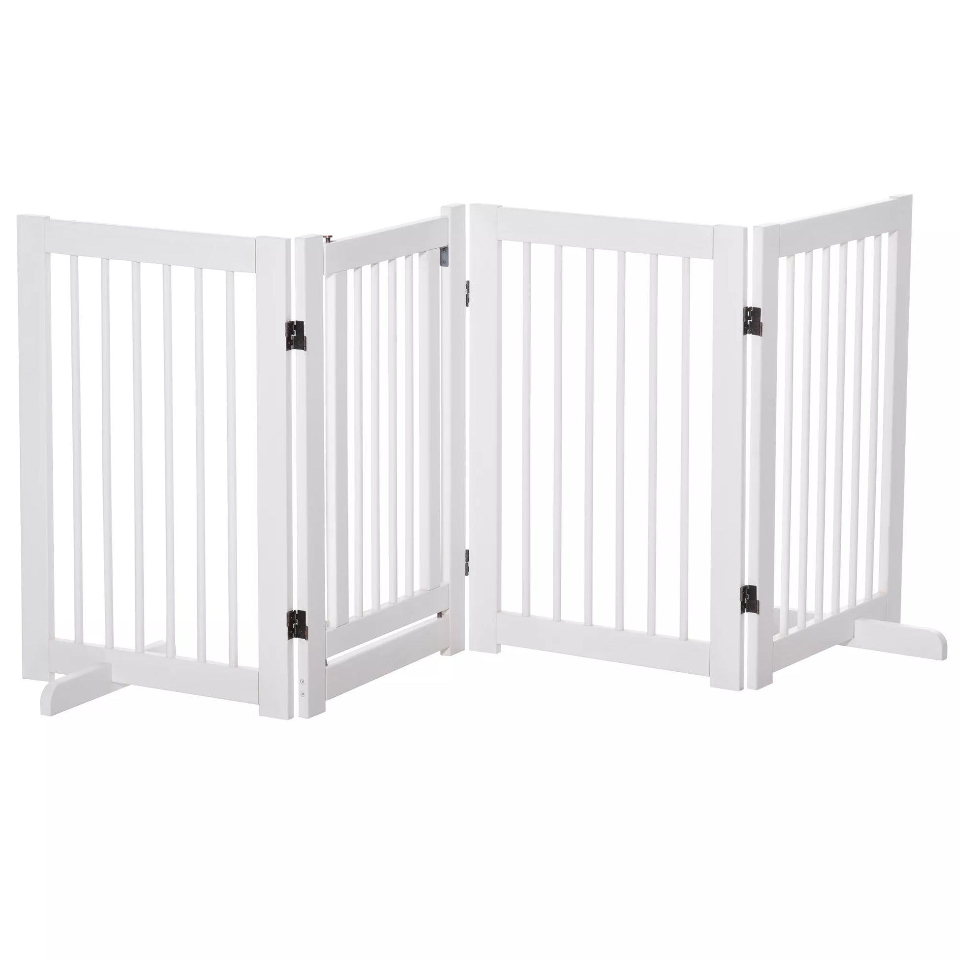 Šunų užtvaras 4 dalių, 204 x 75 cm Sulankstomi apsauginiai varteliai su durelėmis, Laisvai pastatomi šunų varteliai su 2 atraminėmis kojelėmis, Mediniai varteliai laiptams, koridoriui, virtuvei, balti