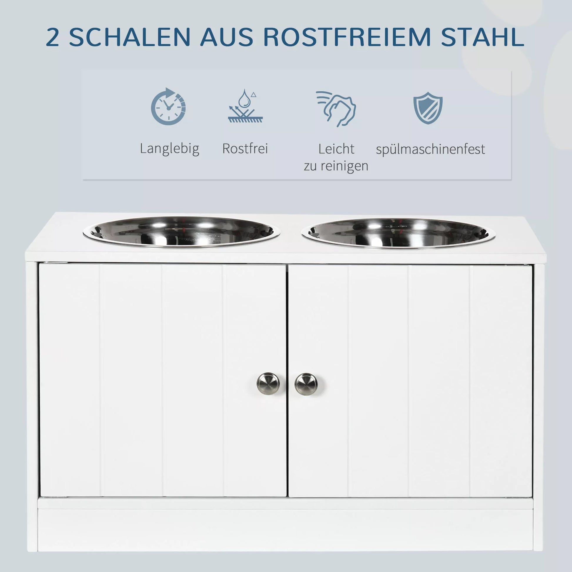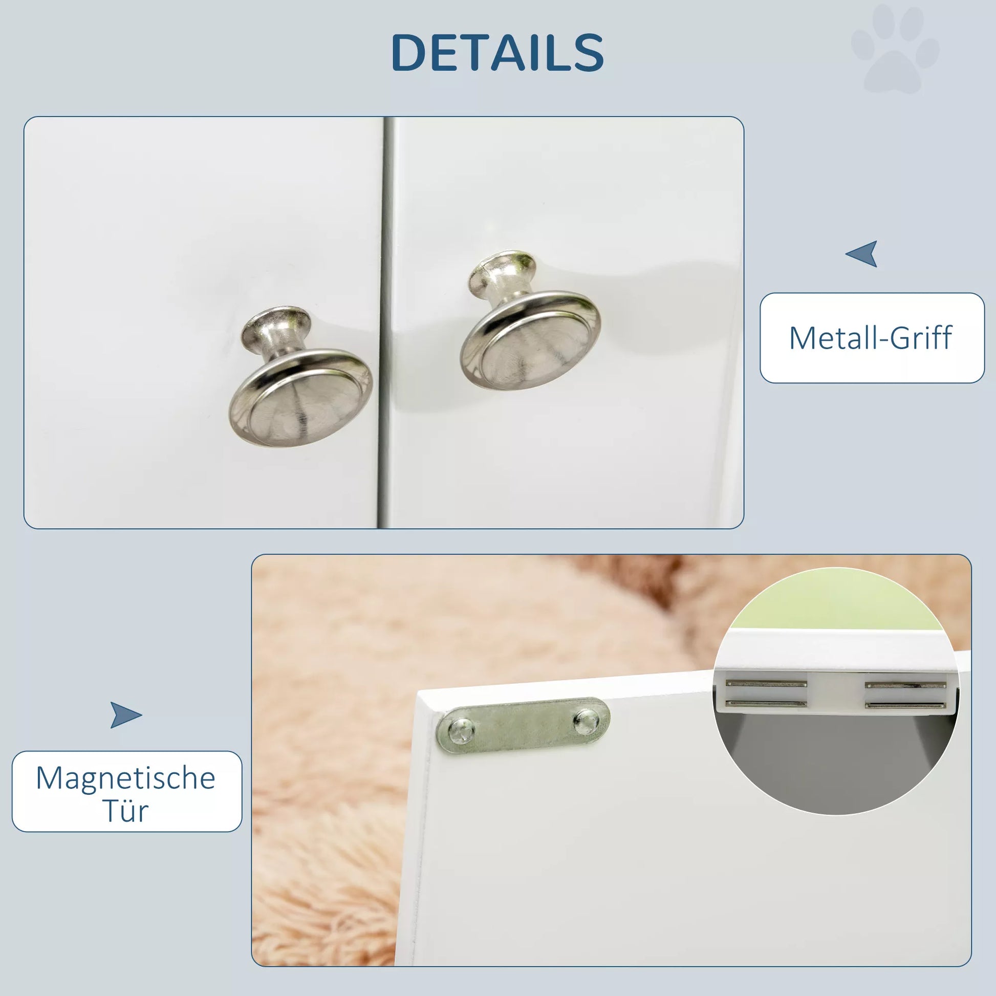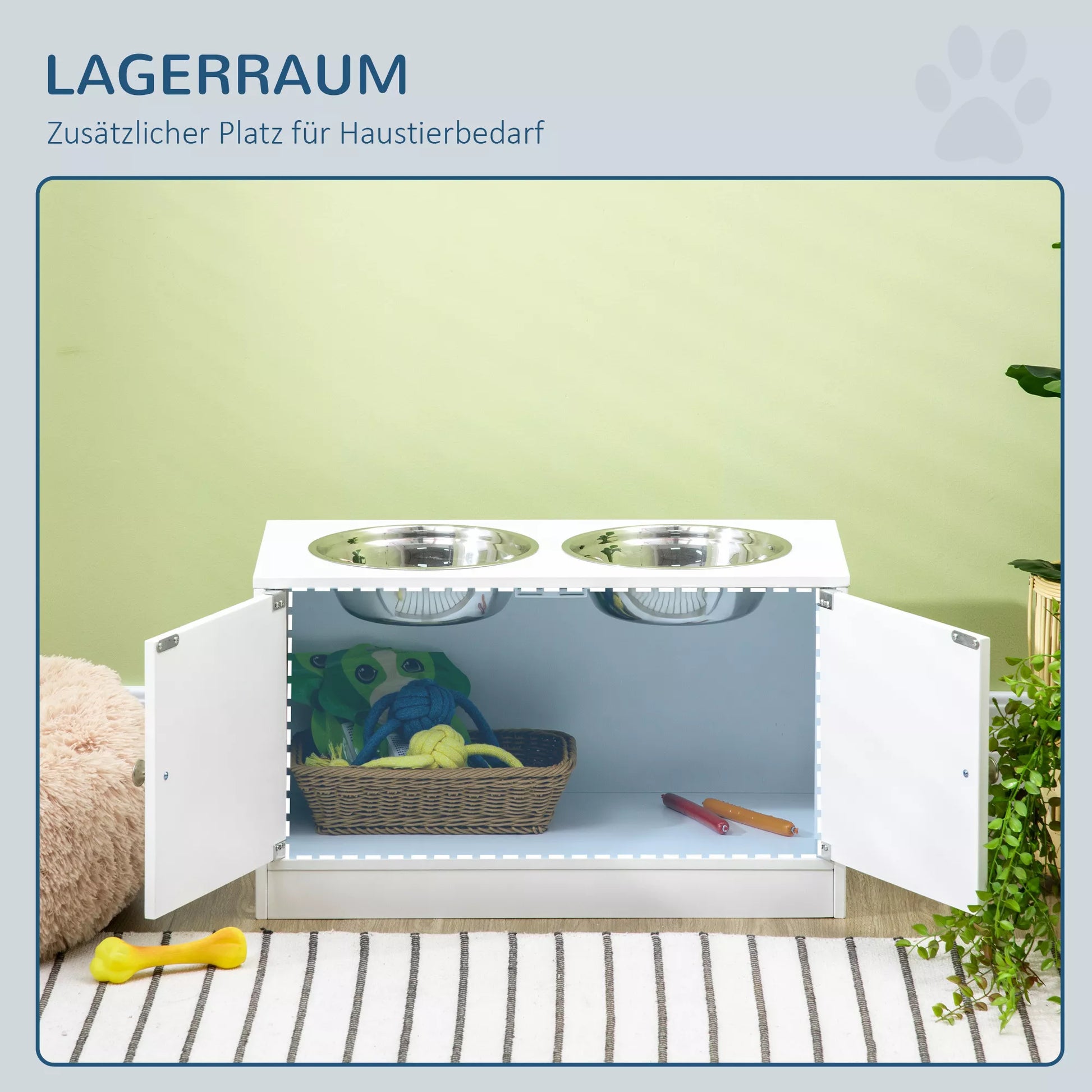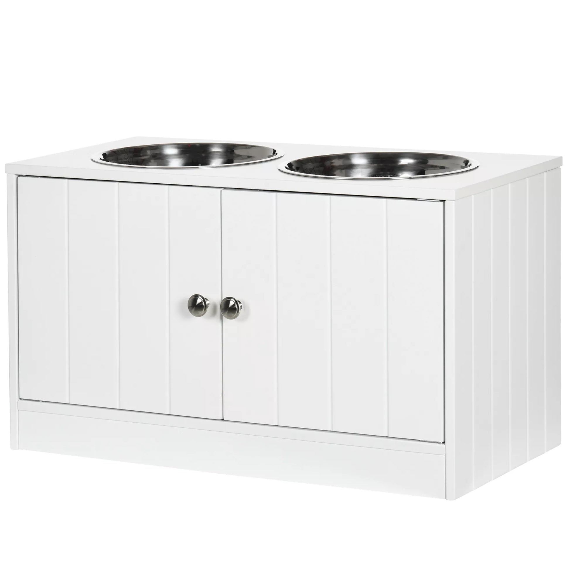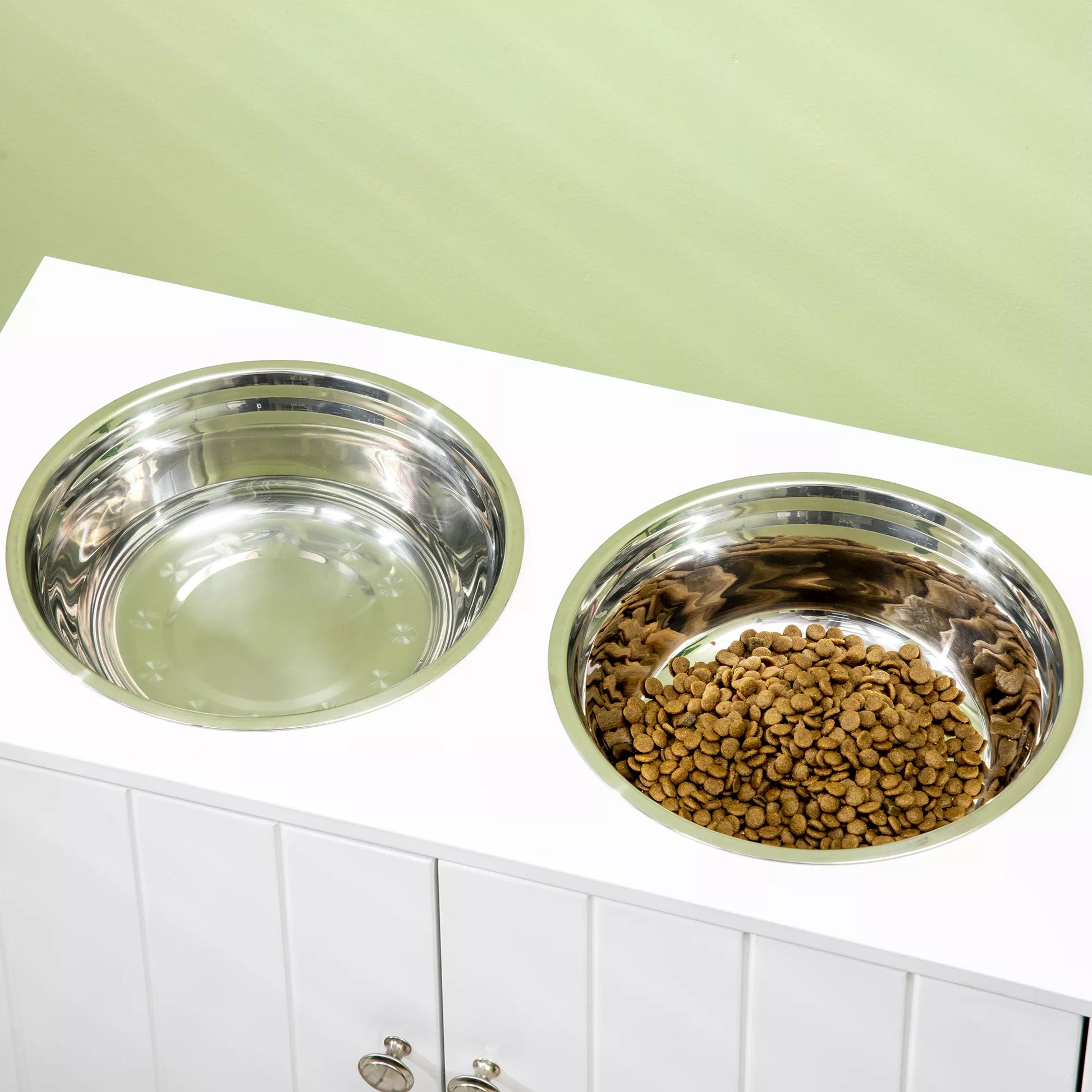 Šunų ėdalo stotelė, 2 nerūdijančio plieno dubenėliai, 44L talpos spintelės skyrius, magnetinės durelės, balta, 60x30x35,5 cm