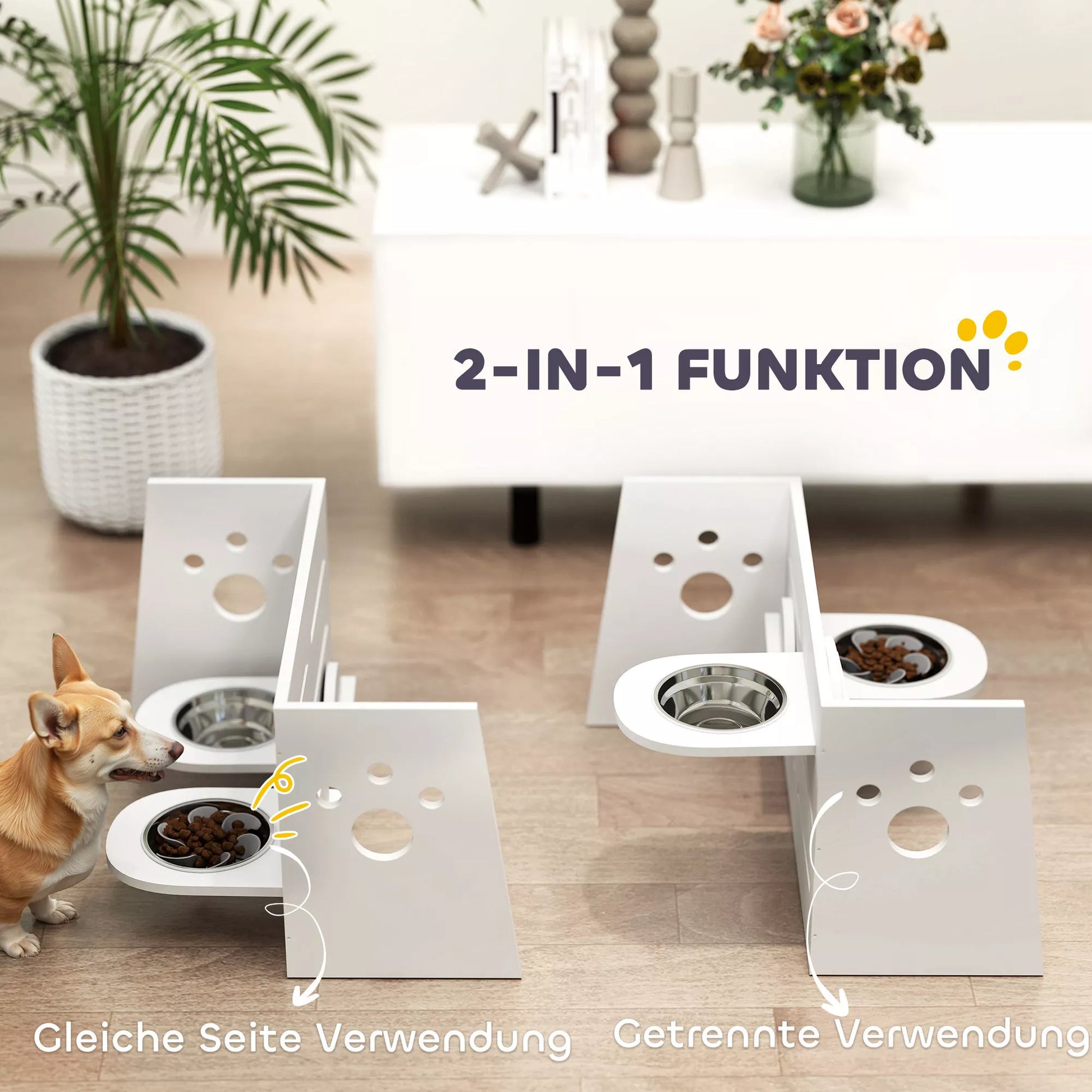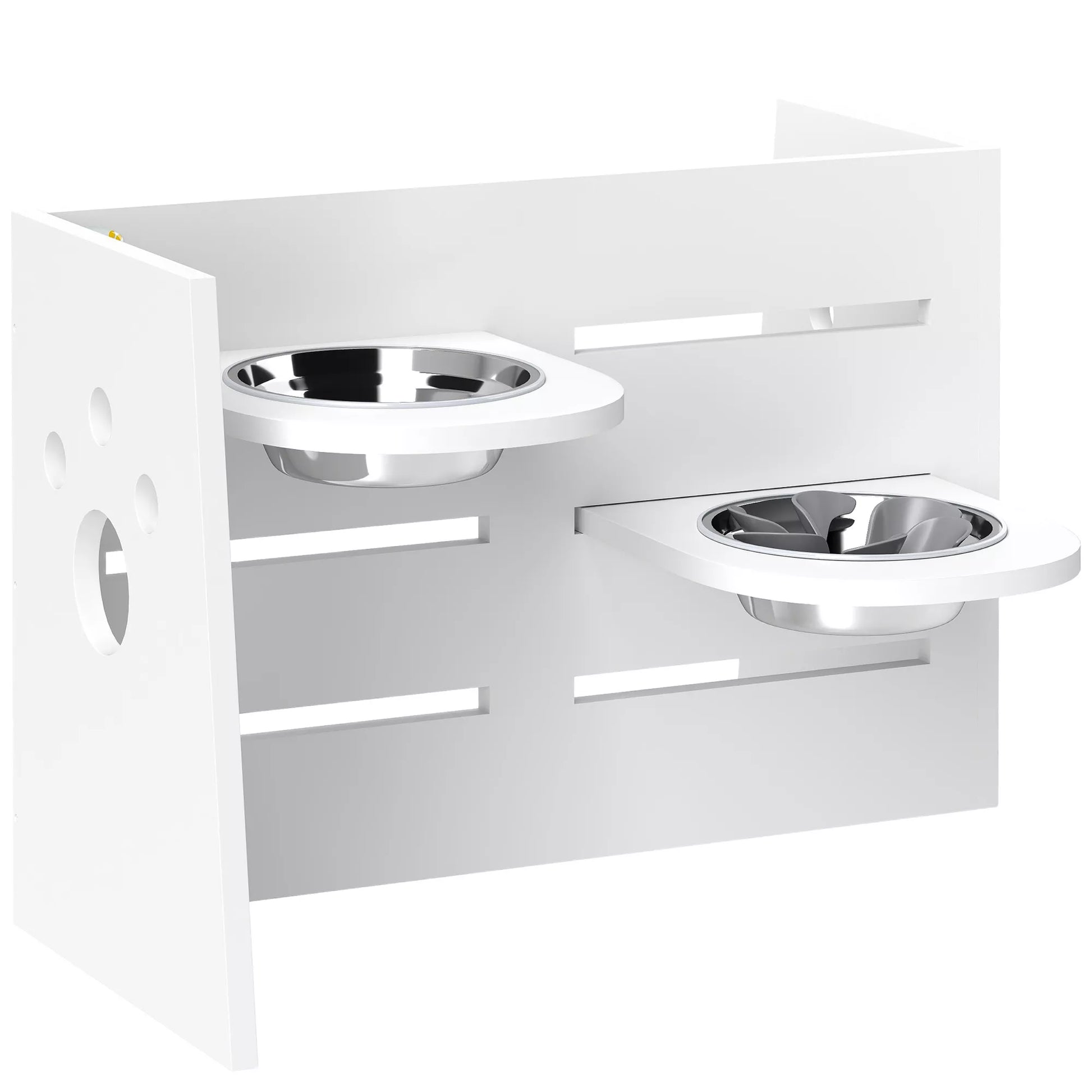 Stovas maistui šunims, reguliuojami dubenėliai su atskiru dizainu, 2 nerūdijančio plieno dubenėliai, kilimėlis nuo greito ėdalo, Baltas