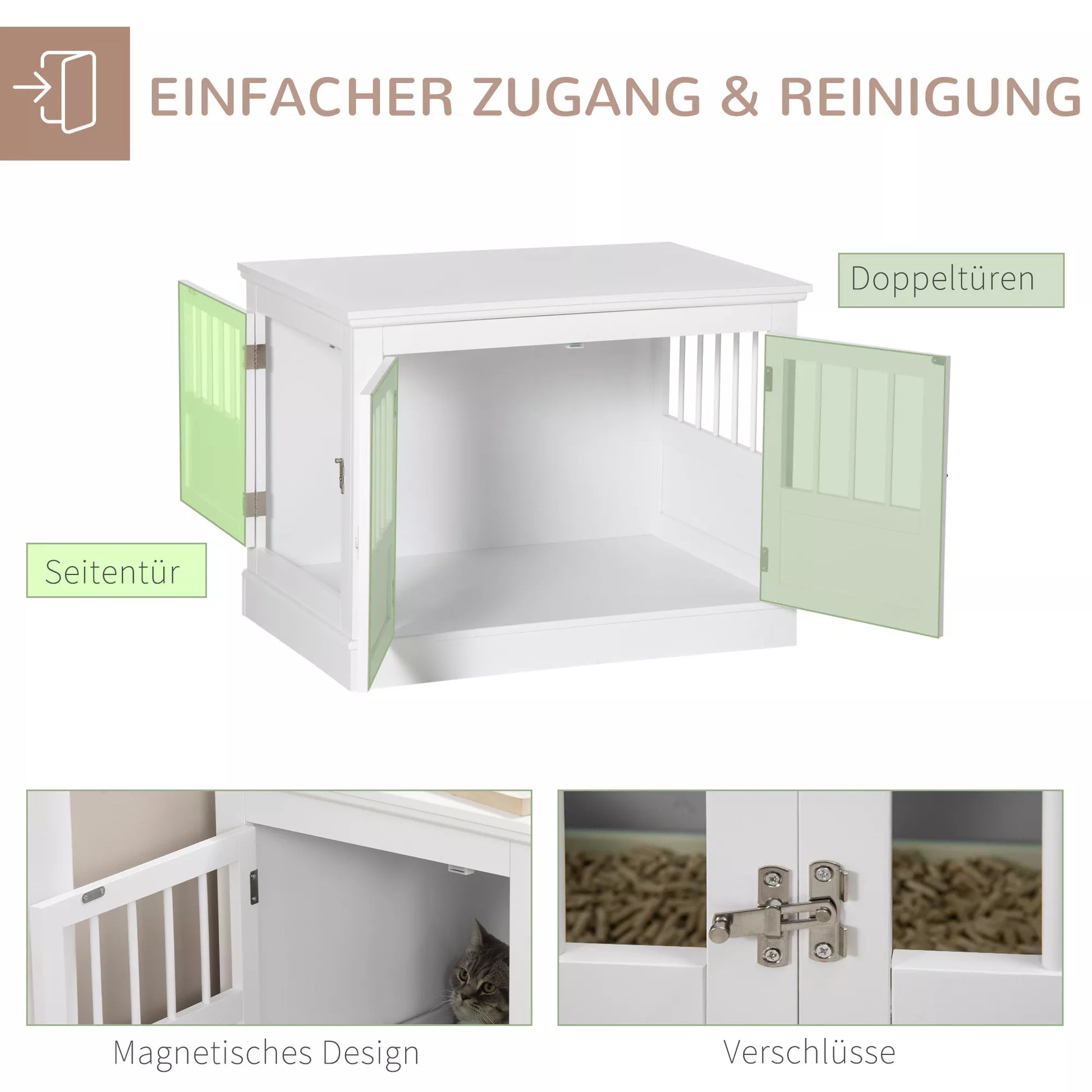 Ši šunų dėžė namams suteikia erdvią, lygią paviršių patogumui. Trys šunų narvo durys leidžia lengvai atidaryti užraktus iš kelių pusių, todėl galite patogiai išleisti savo šunį. Su saugiu „ “ baldinio stiliaus šunų narvu patirsite, kaip greitai užsidaro magnetinis užraktas, taupydamas jūsų laiką ir pastangas.