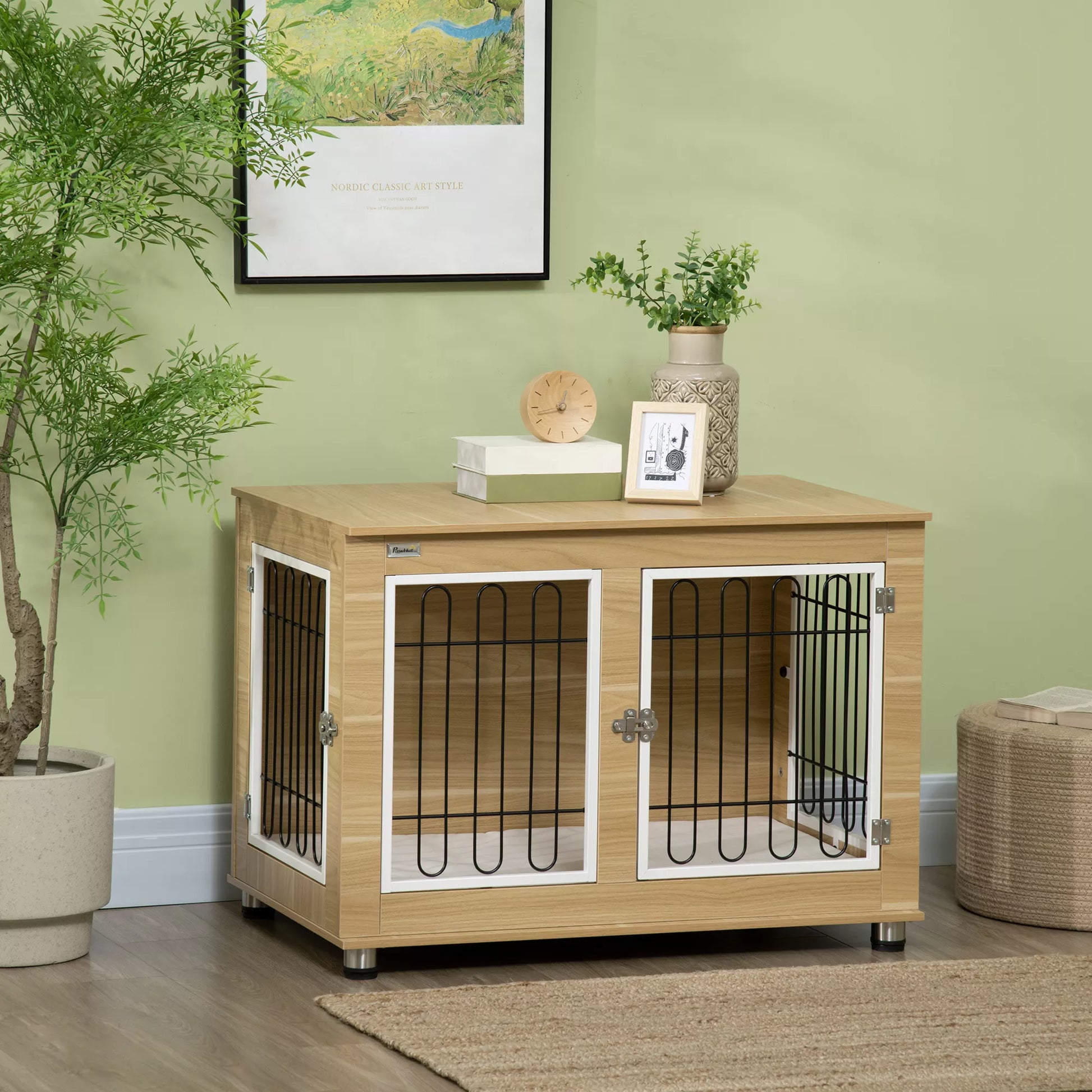 Šunų narvas, plaunama pagalvėlė, šunų dėžė, 2 užraktai, 90 cm x 58 cm x 65 cm, Natūralus + Juodas + Baltas