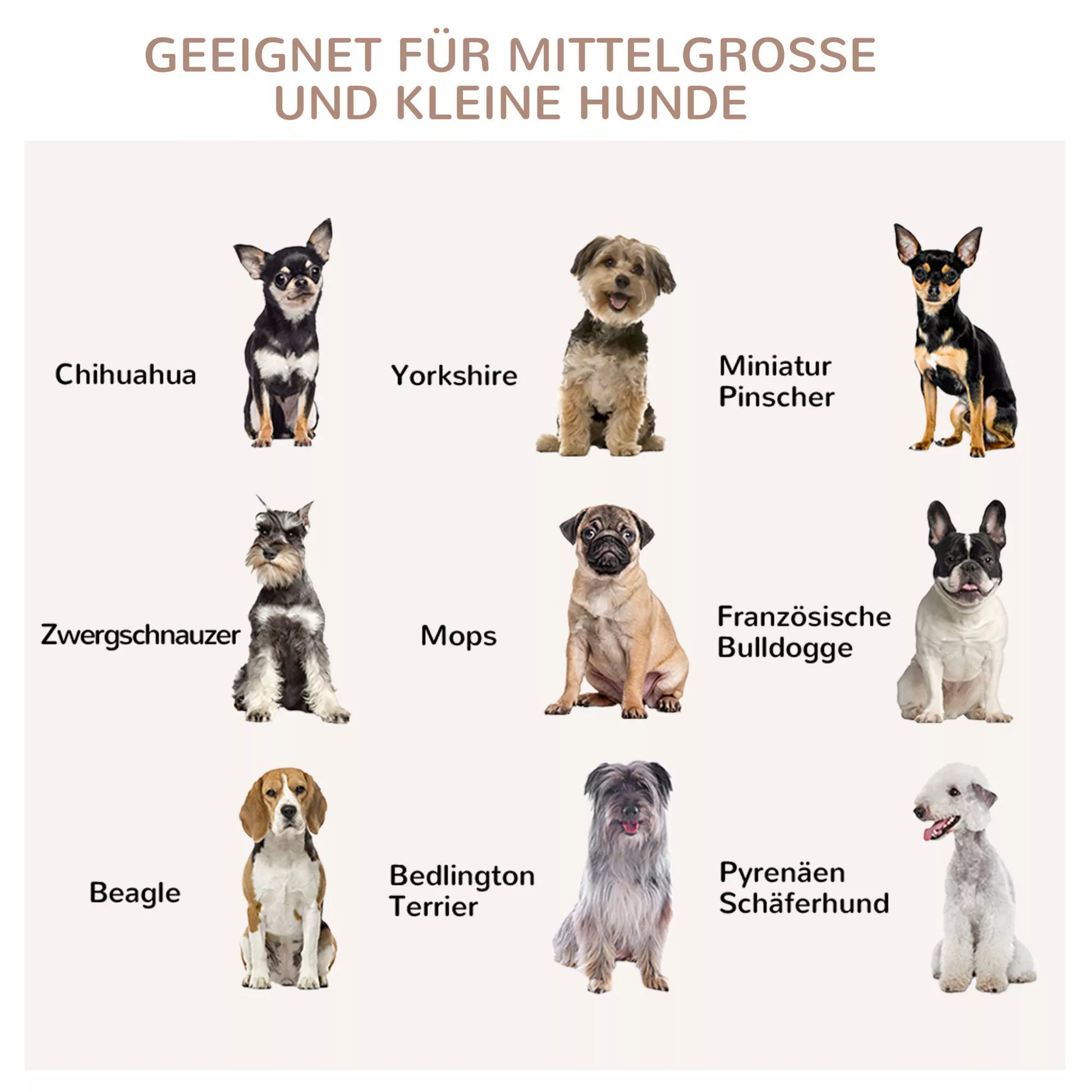 - ✔ Tinka vidutinio dydžio šunims iki 20 kg, rekomenduojama, kad šuo būtų mažesnis nei 50 cm ilgio