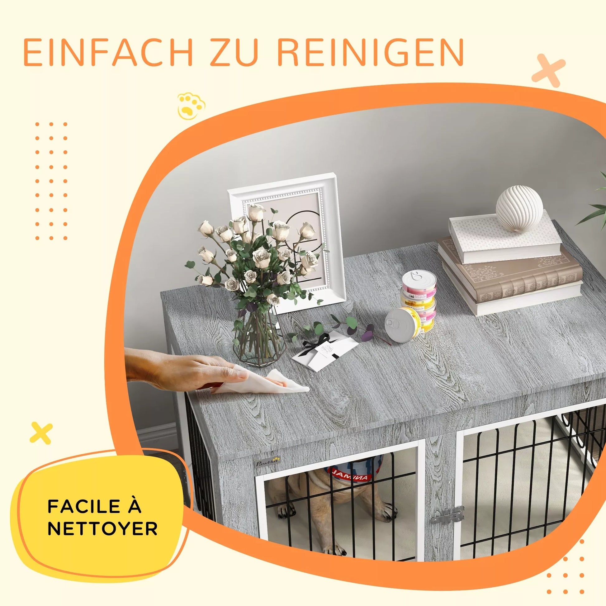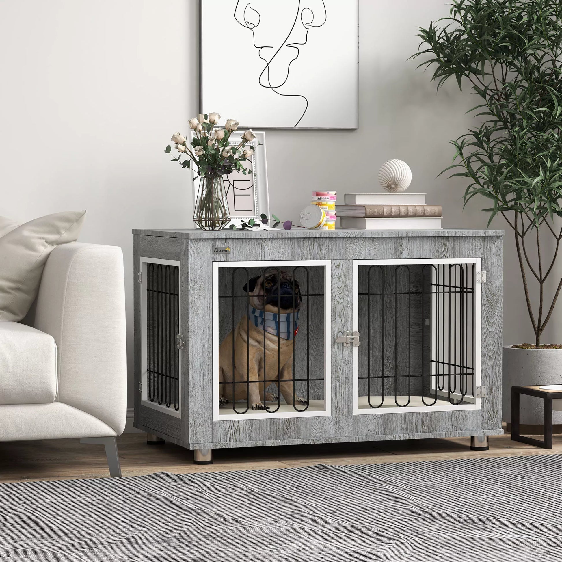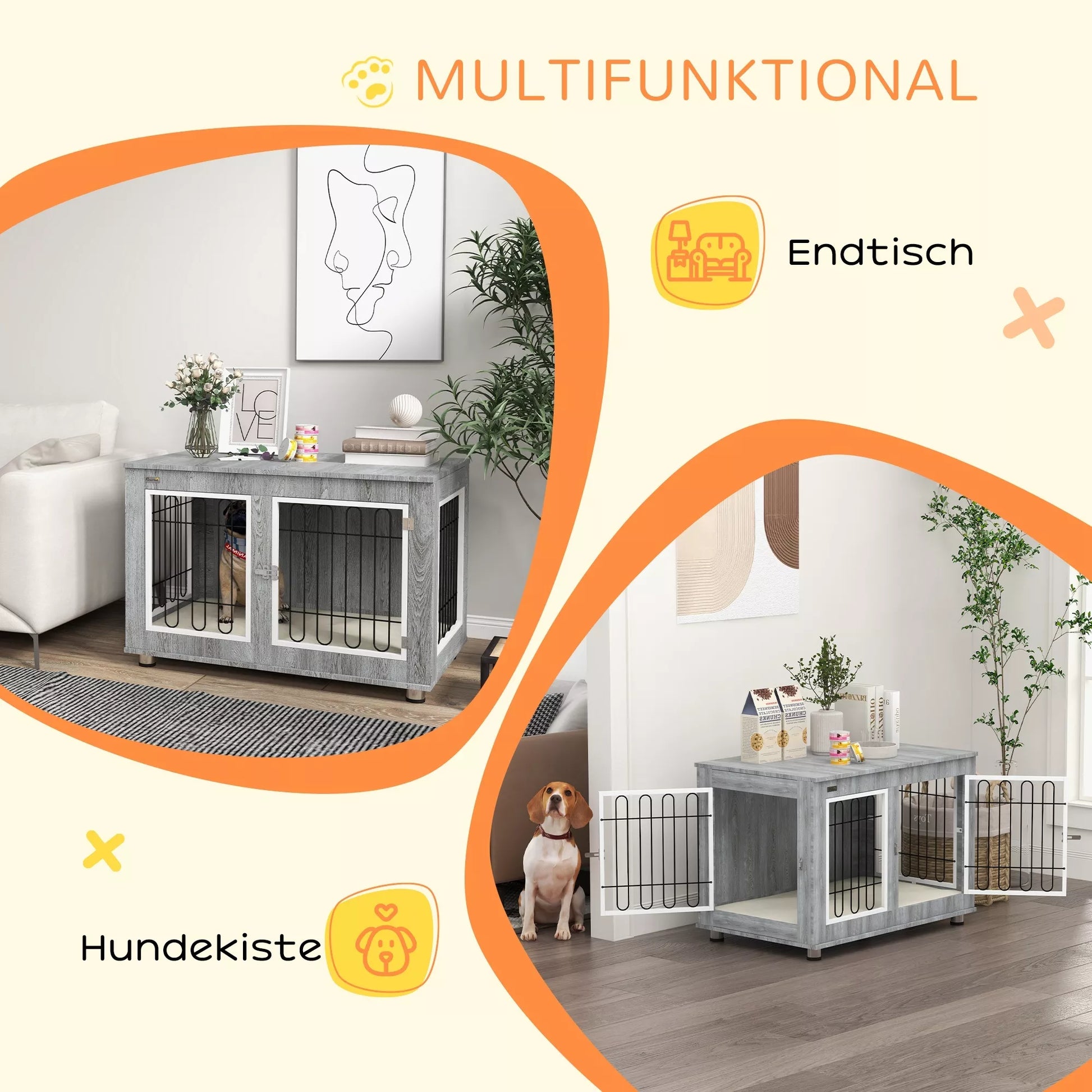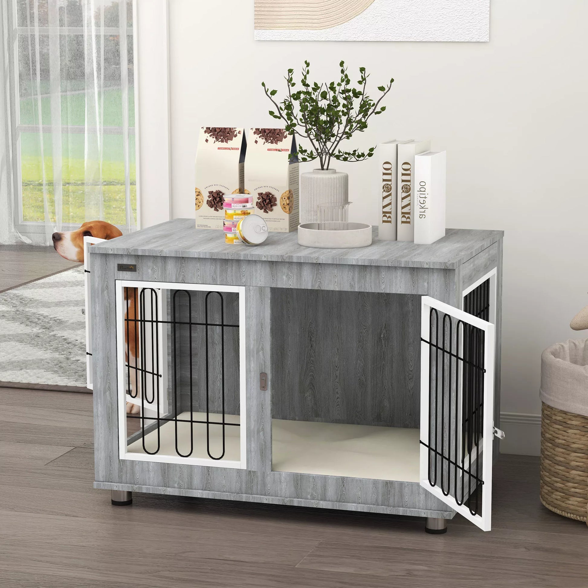 Šis dekoratyvinis šunų namelis nuo suteikia jaukios šunų lovos miego komfortą viduje, su minkštu paminkštinimu ir nuimamu užvalkalu, kurį galima skalbti, kad būtų lengva valyti. Dvi durys su plačiomis angomis leidžia lengvai įeiti ir išeiti. Tvirta konstrukcija, kurią Jums reikės visą šuns gyvenimą, išliks net ir kasdien naudojant. Padarykite šią dizaino šunų dėžę savo namų dalimi.