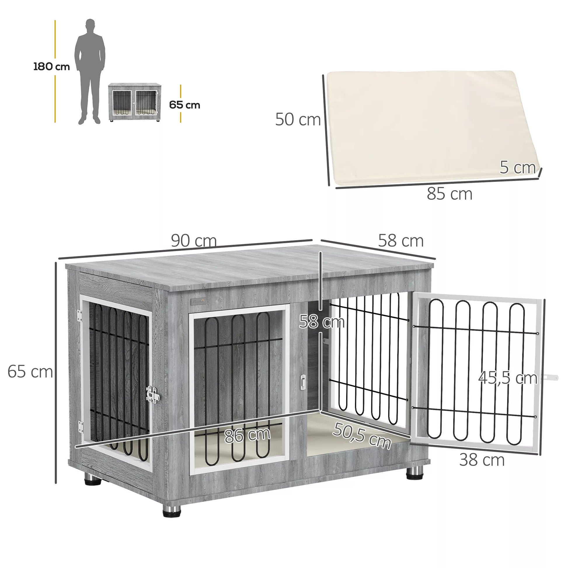 Šunų narvas su skalbiama pagalvėle, 2 užraktai, 90 cm x 58 cm x 65 cm, pilkos spalvos