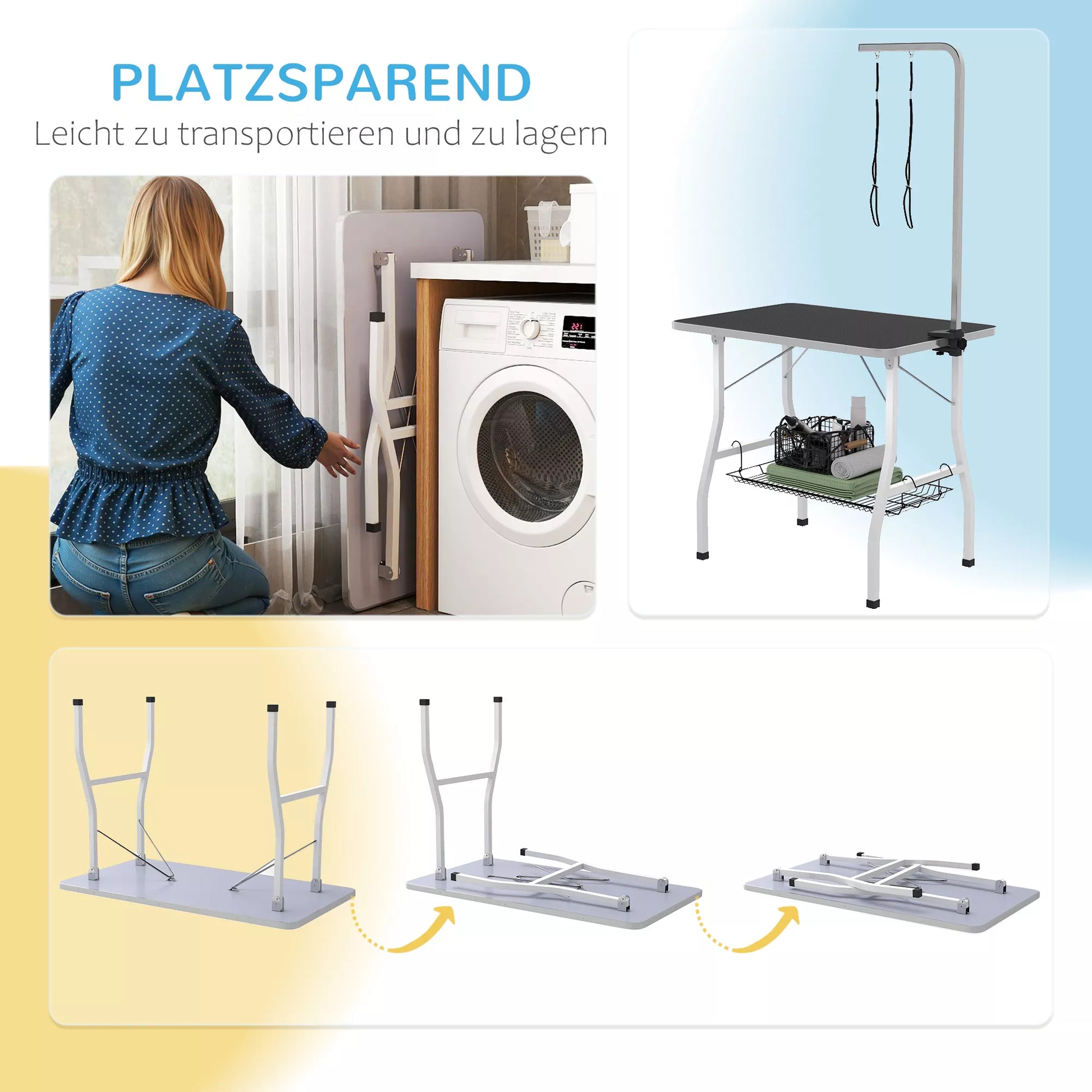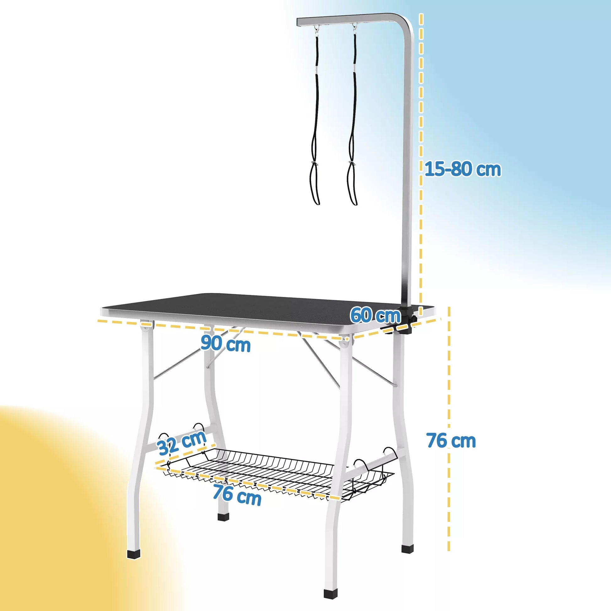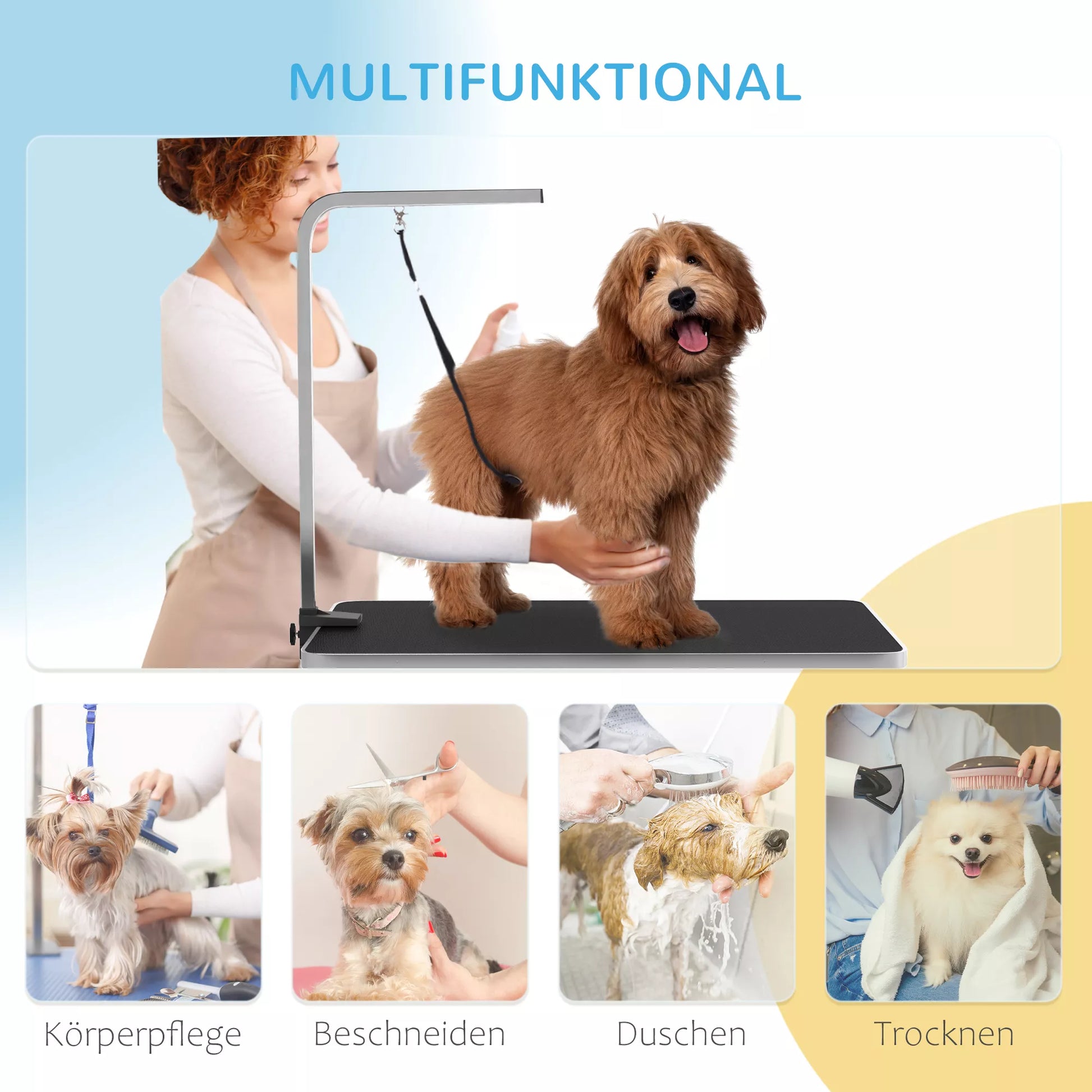 Šunų priežiūros stalas, kirpimo stalas su reguliuojamu laikikliu, laikymo skyrius, gumine danga, 90 x 60 x 76 cm, Juodas